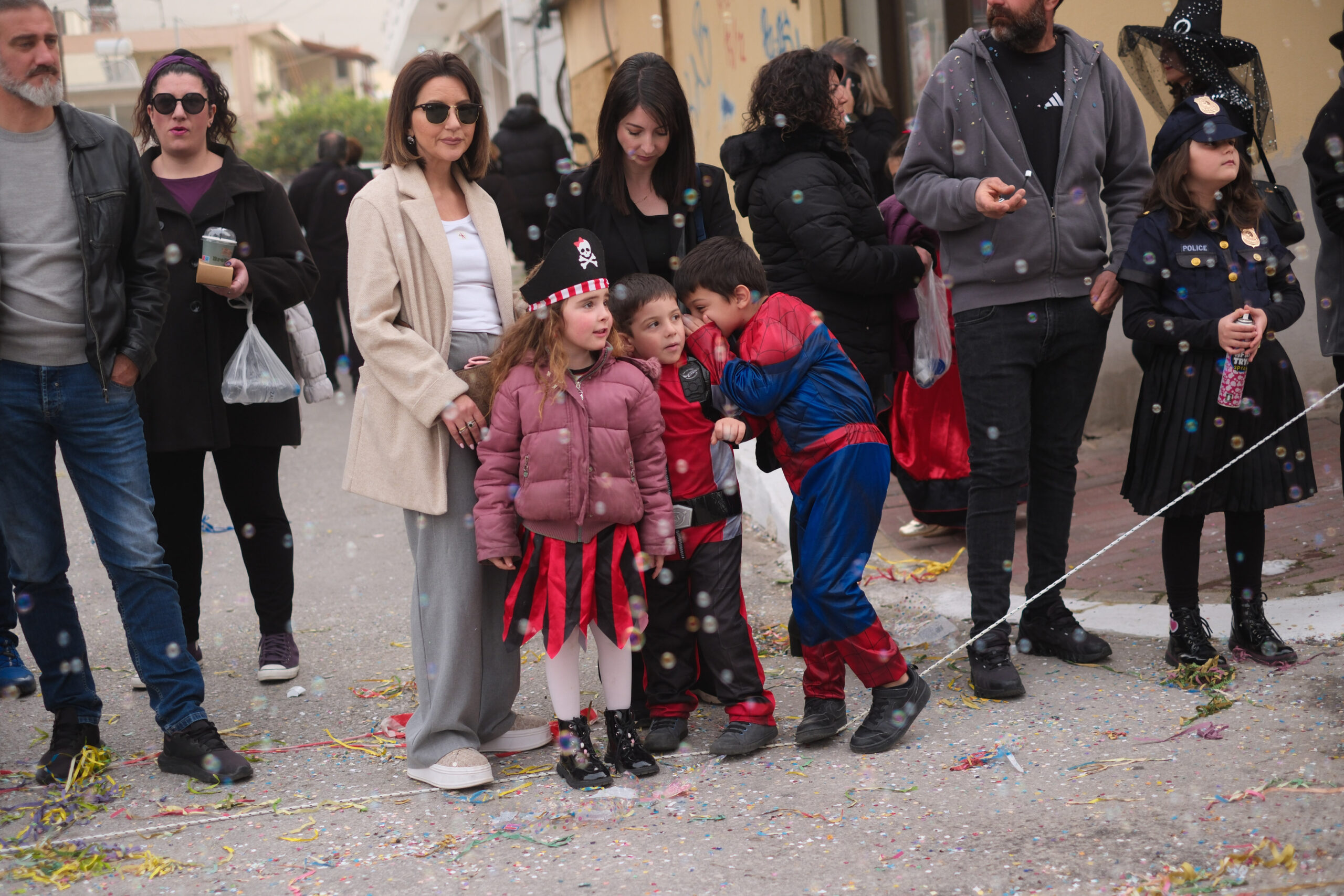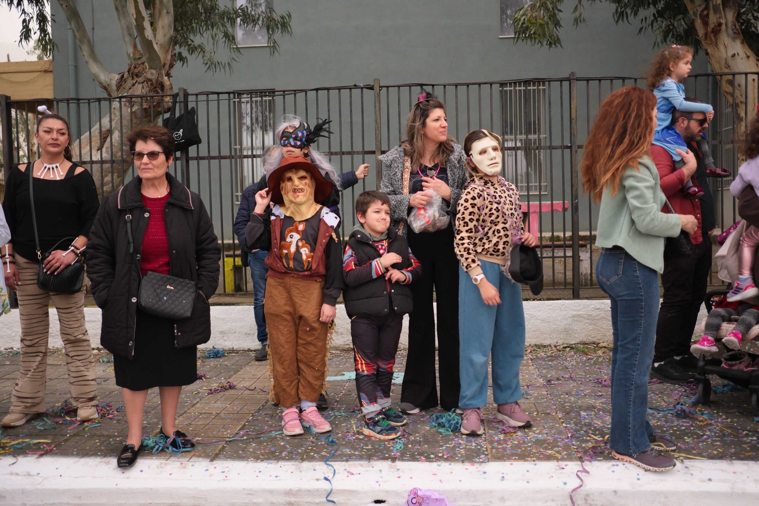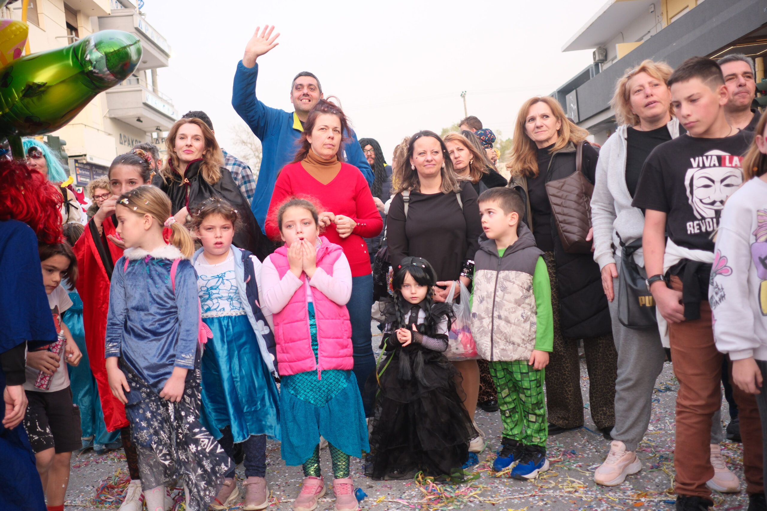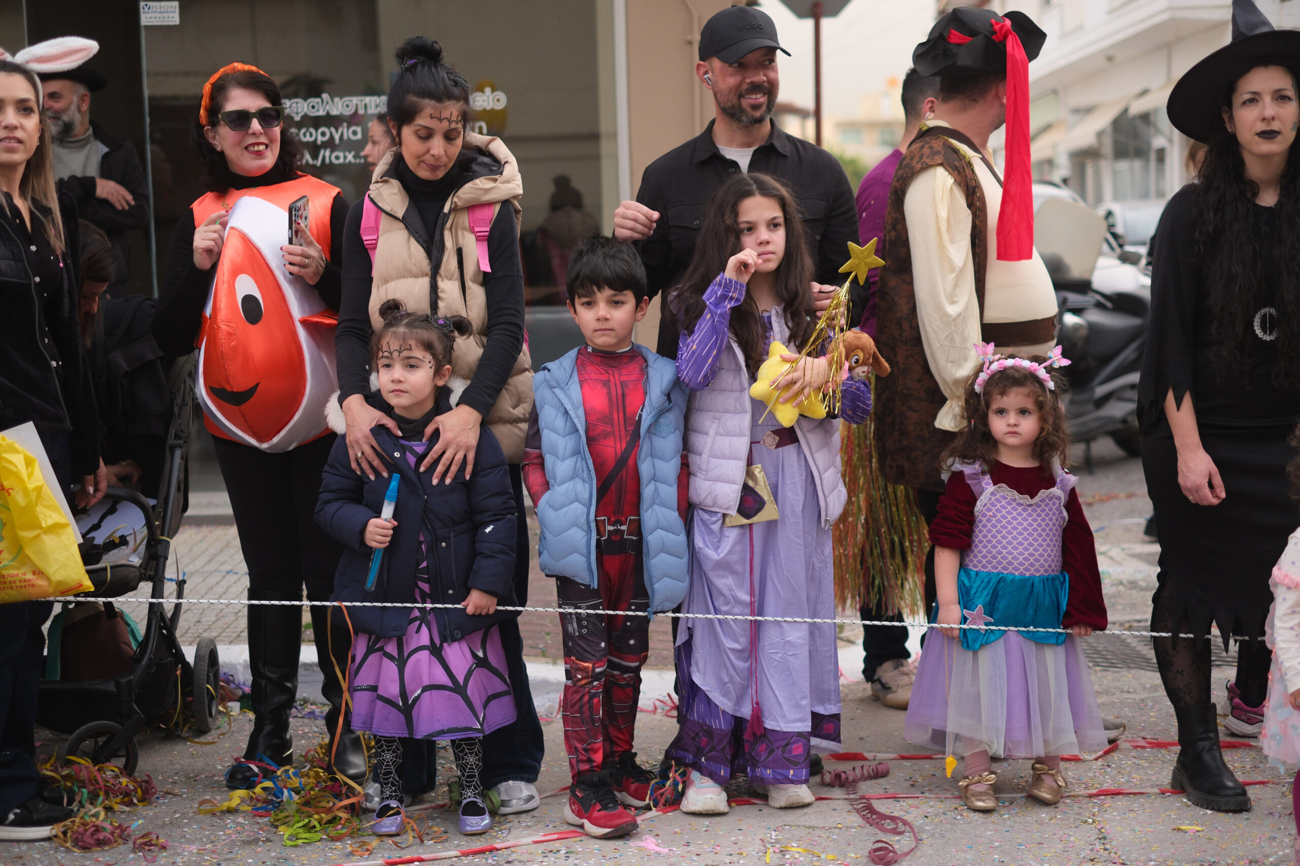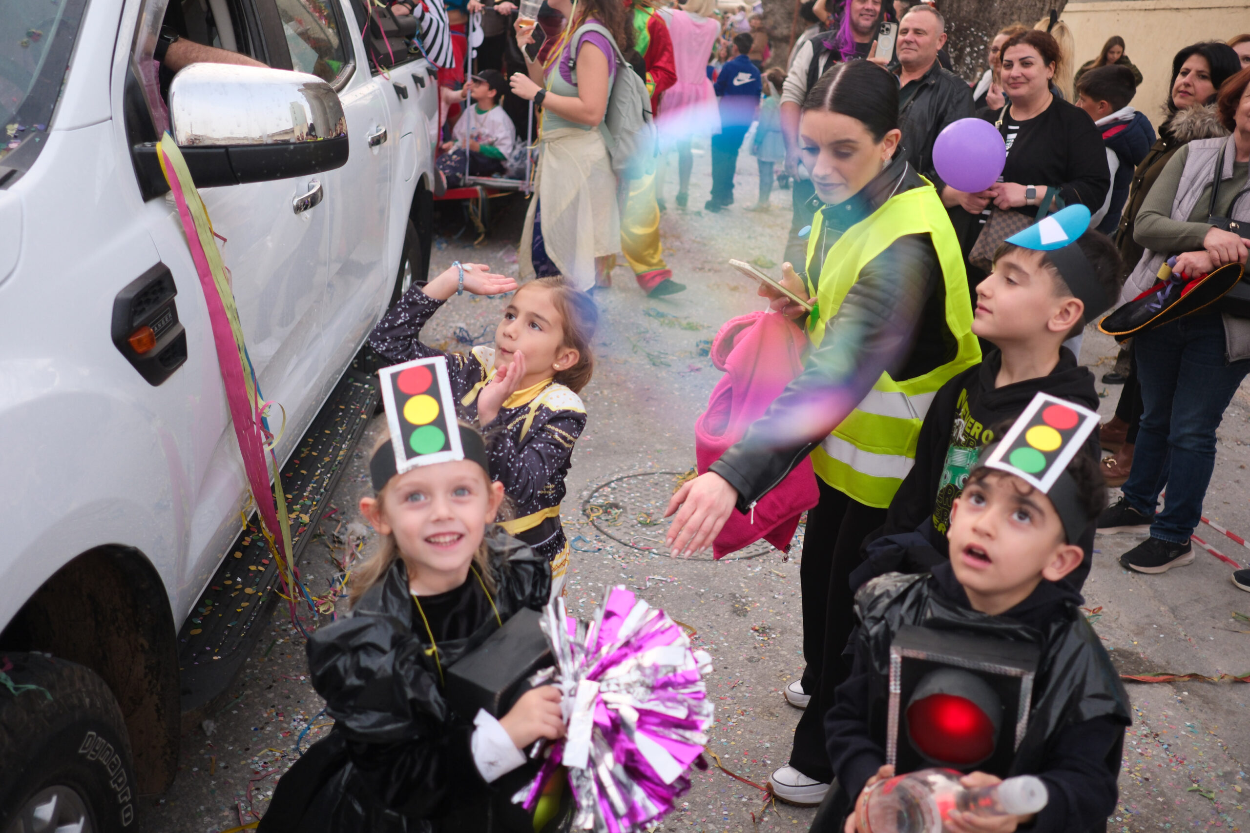 Το σκηνικό της παρέλασης συμπληρώθηκε από τα καθιερωμένα αποκριάτικα αξεσουάρ, με τις σερπαντίνες και τα κονφετί να δημιουργούν μια αίσθηση ατελείωτου πάρτι.