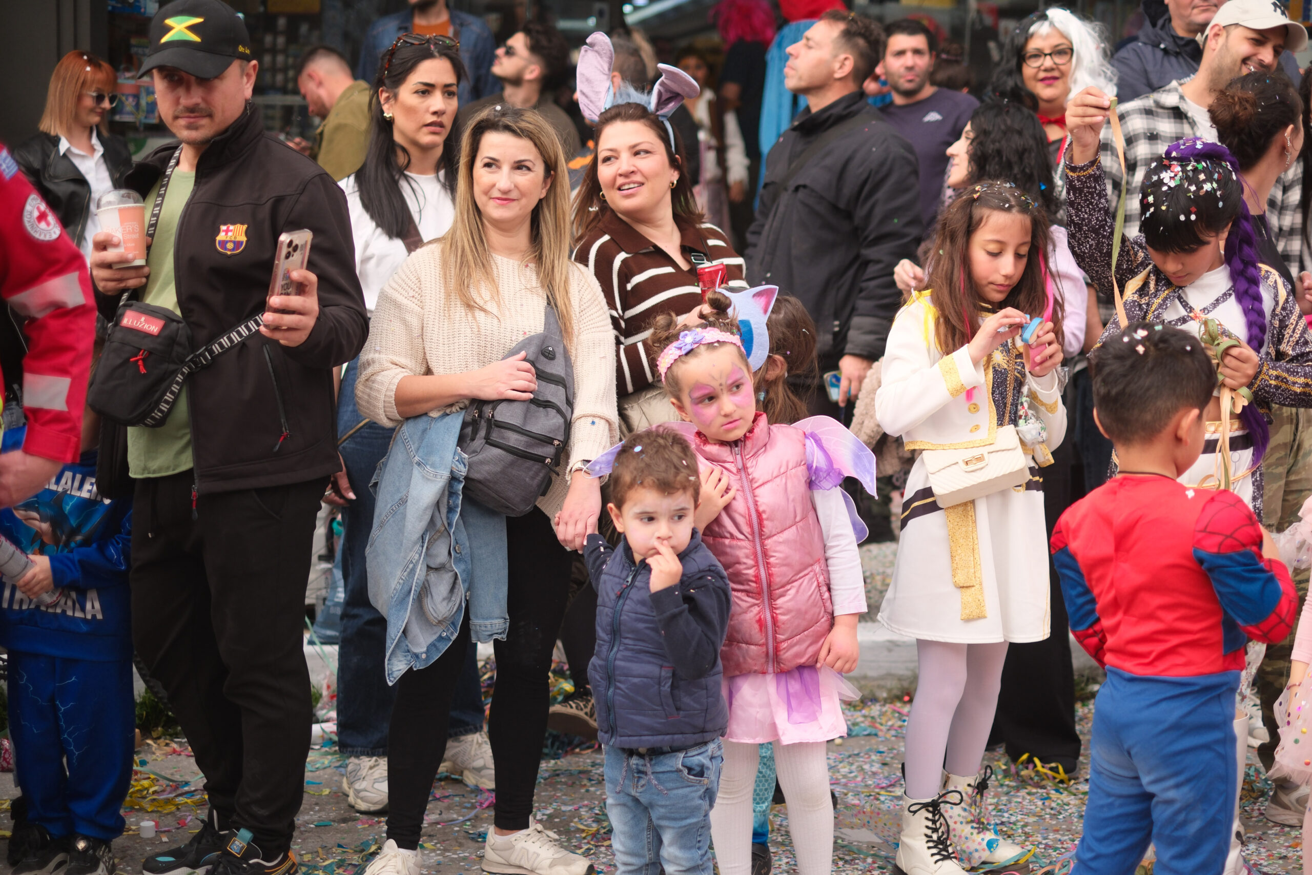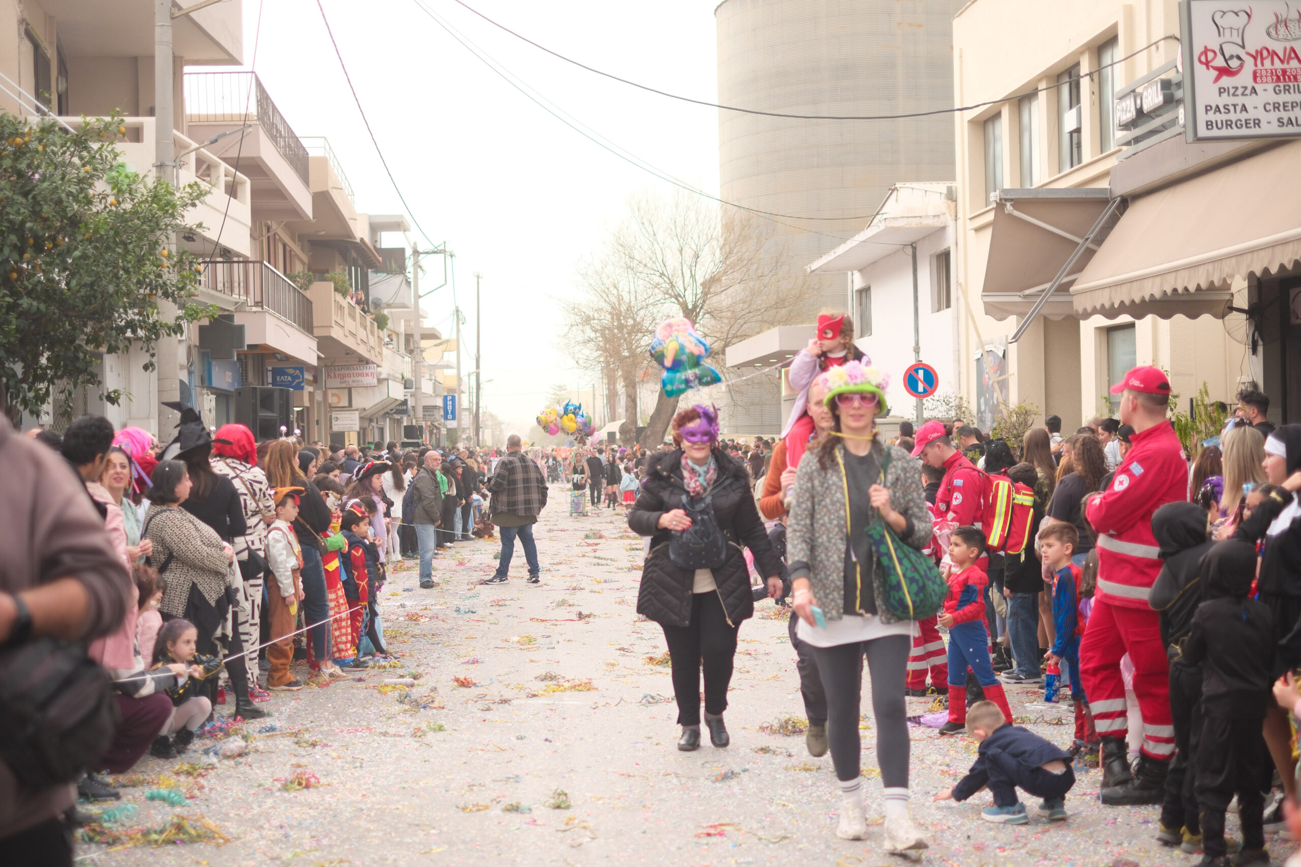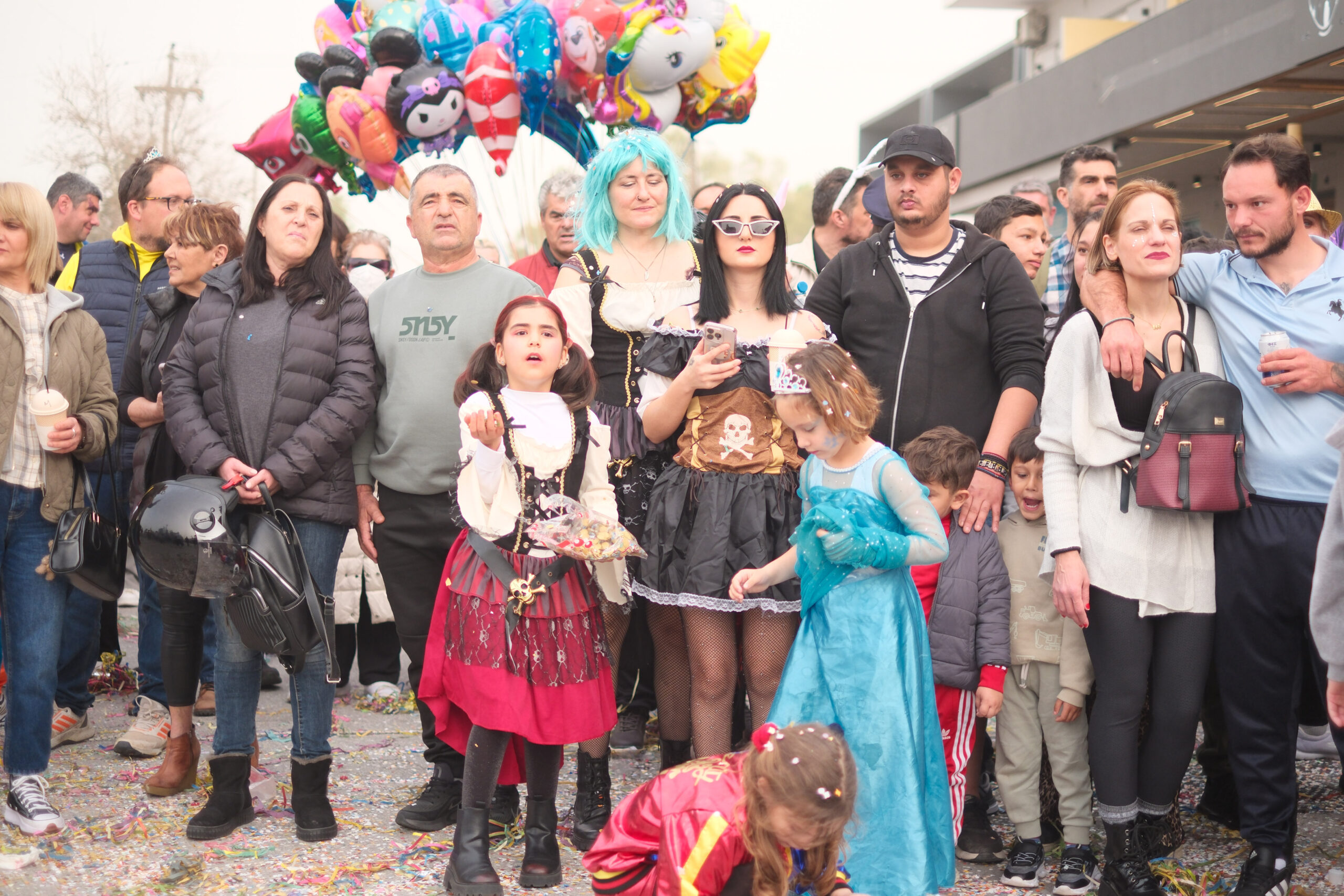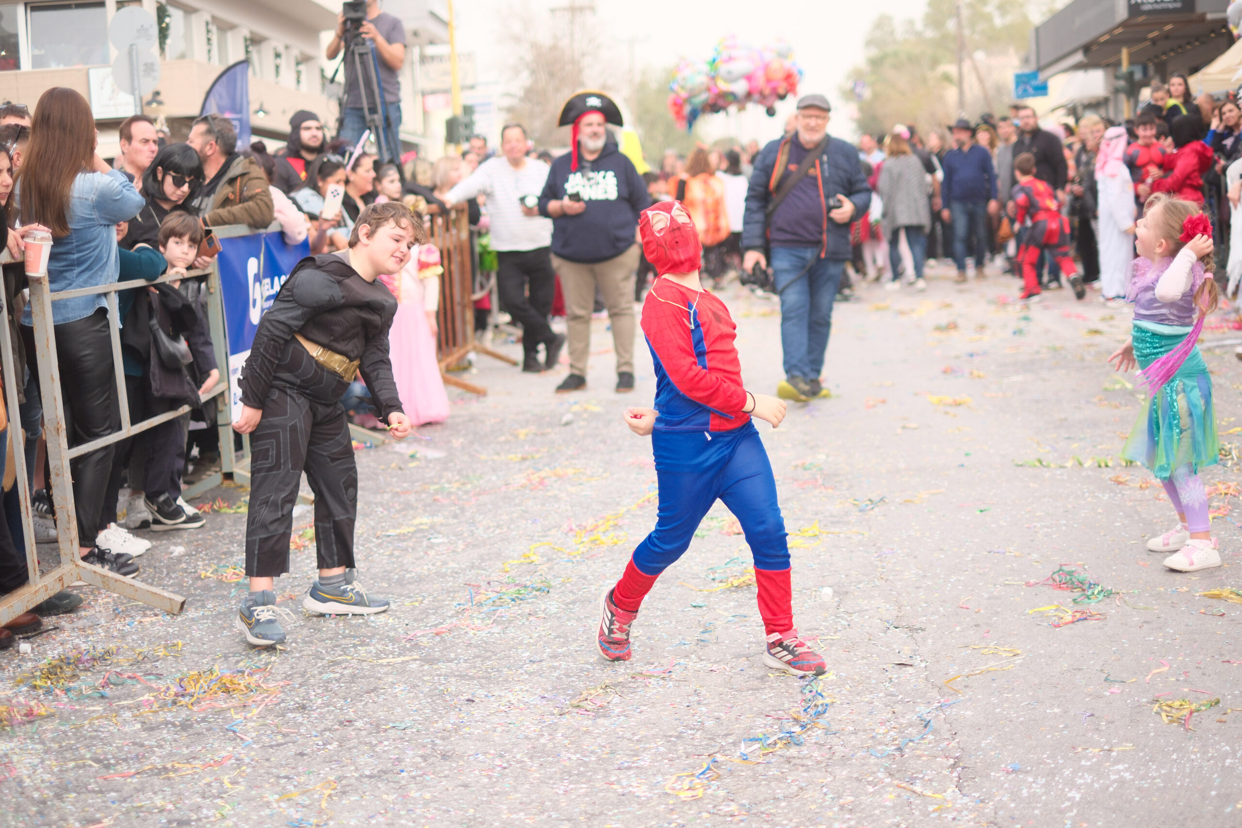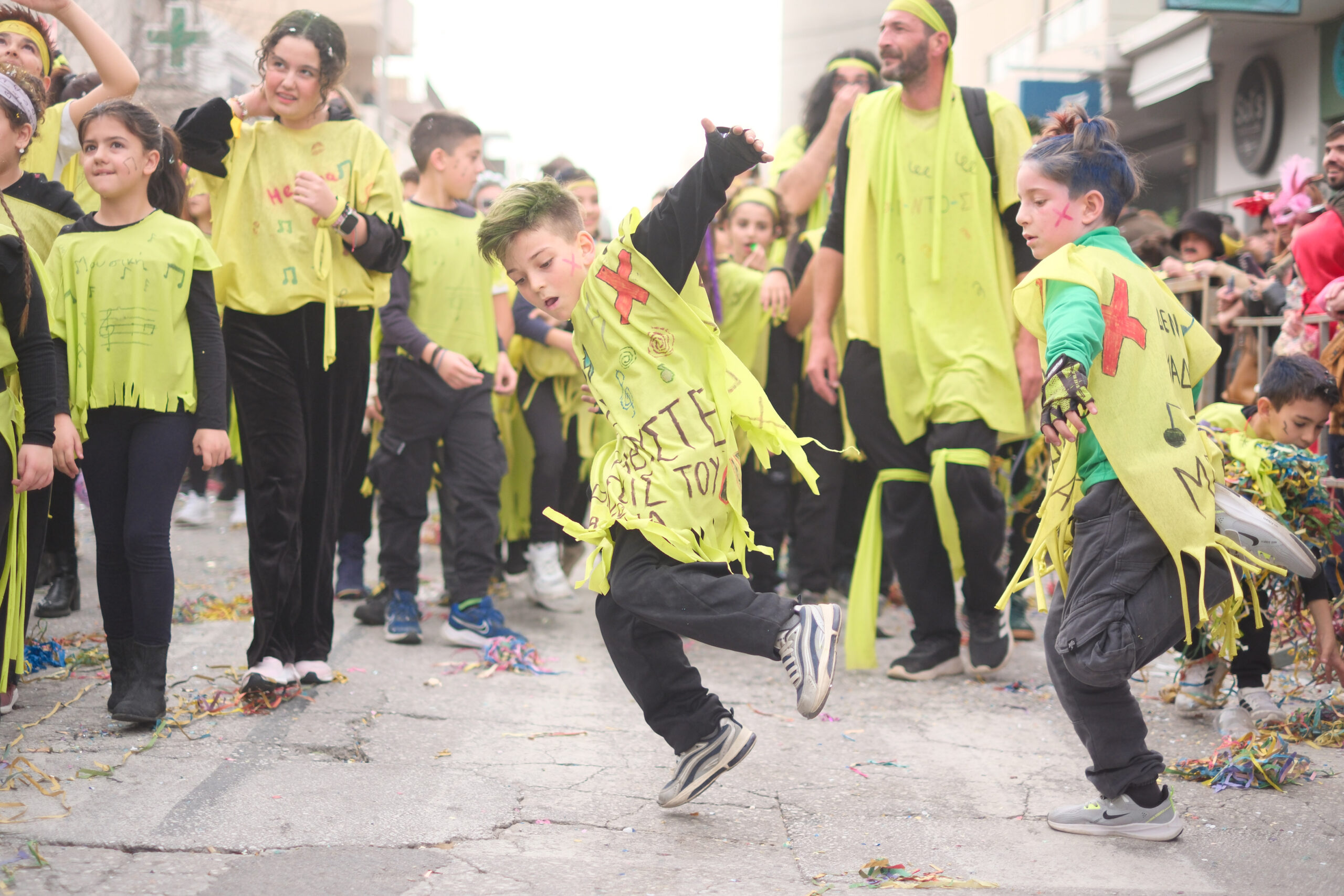 Το σκηνικό της παρέλασης συμπληρώθηκε από τα καθιερωμένα αποκριάτικα αξεσουάρ, με τις σερπαντίνες και τα κονφετί να δημιουργούν μια αίσθηση ατελείωτου πάρτι.