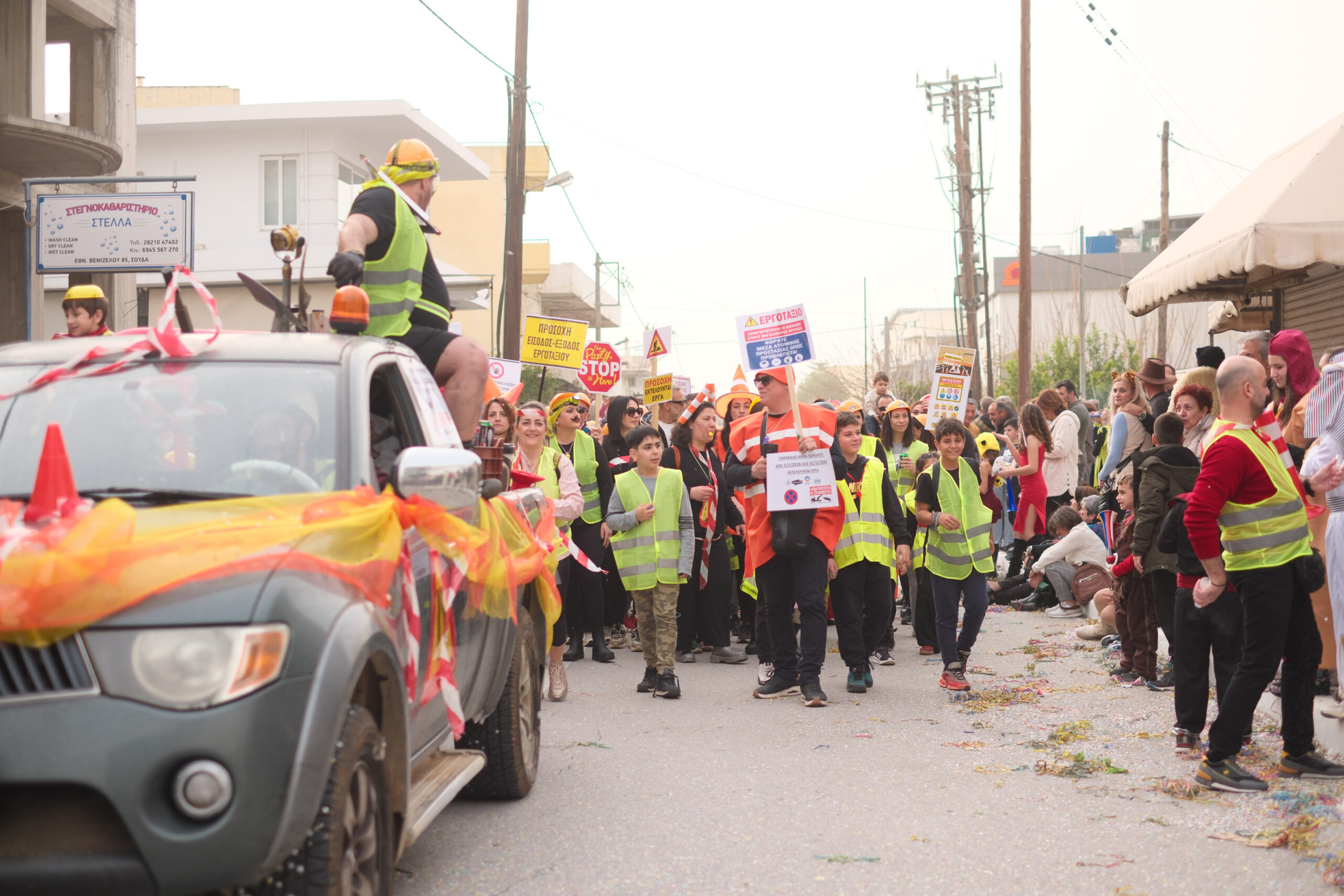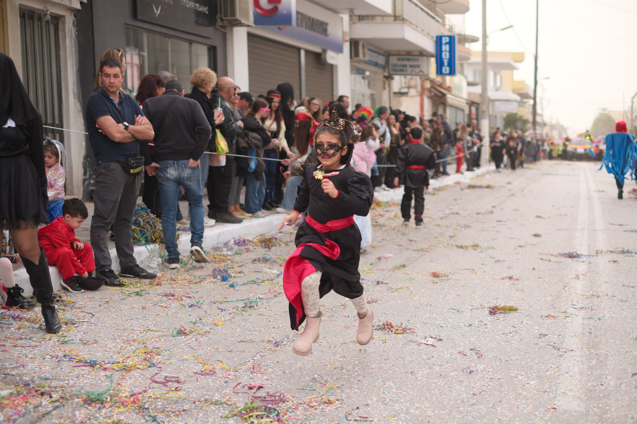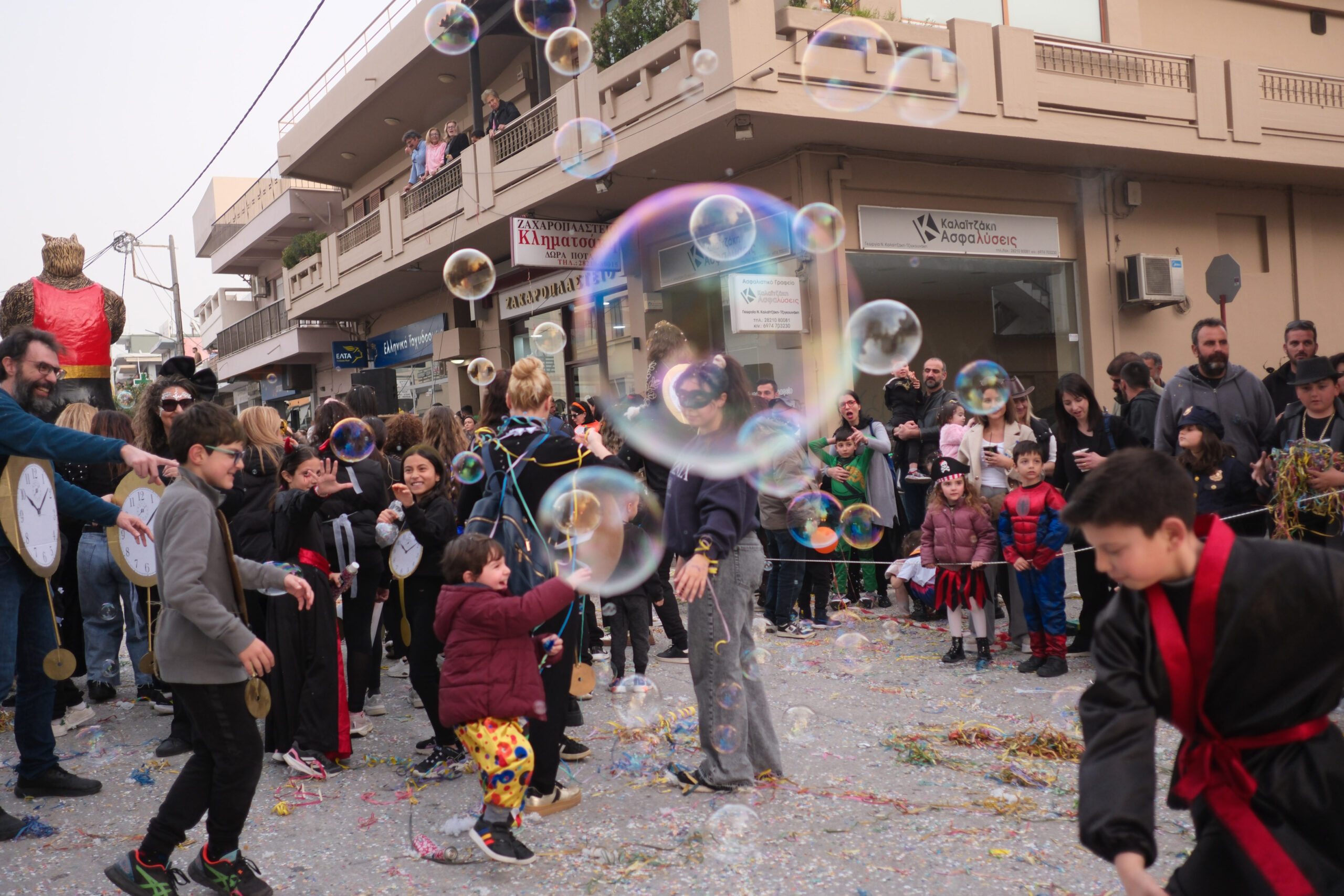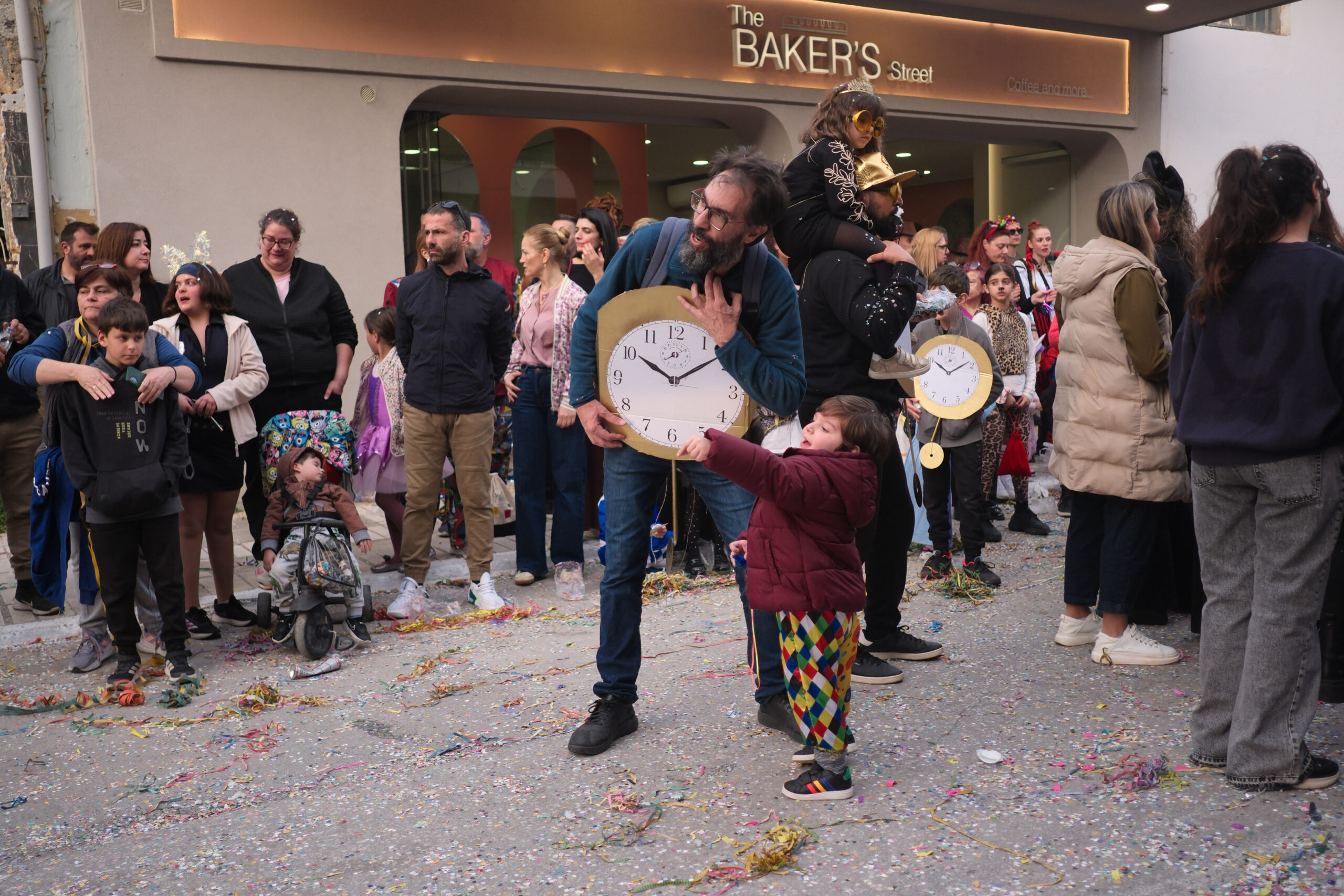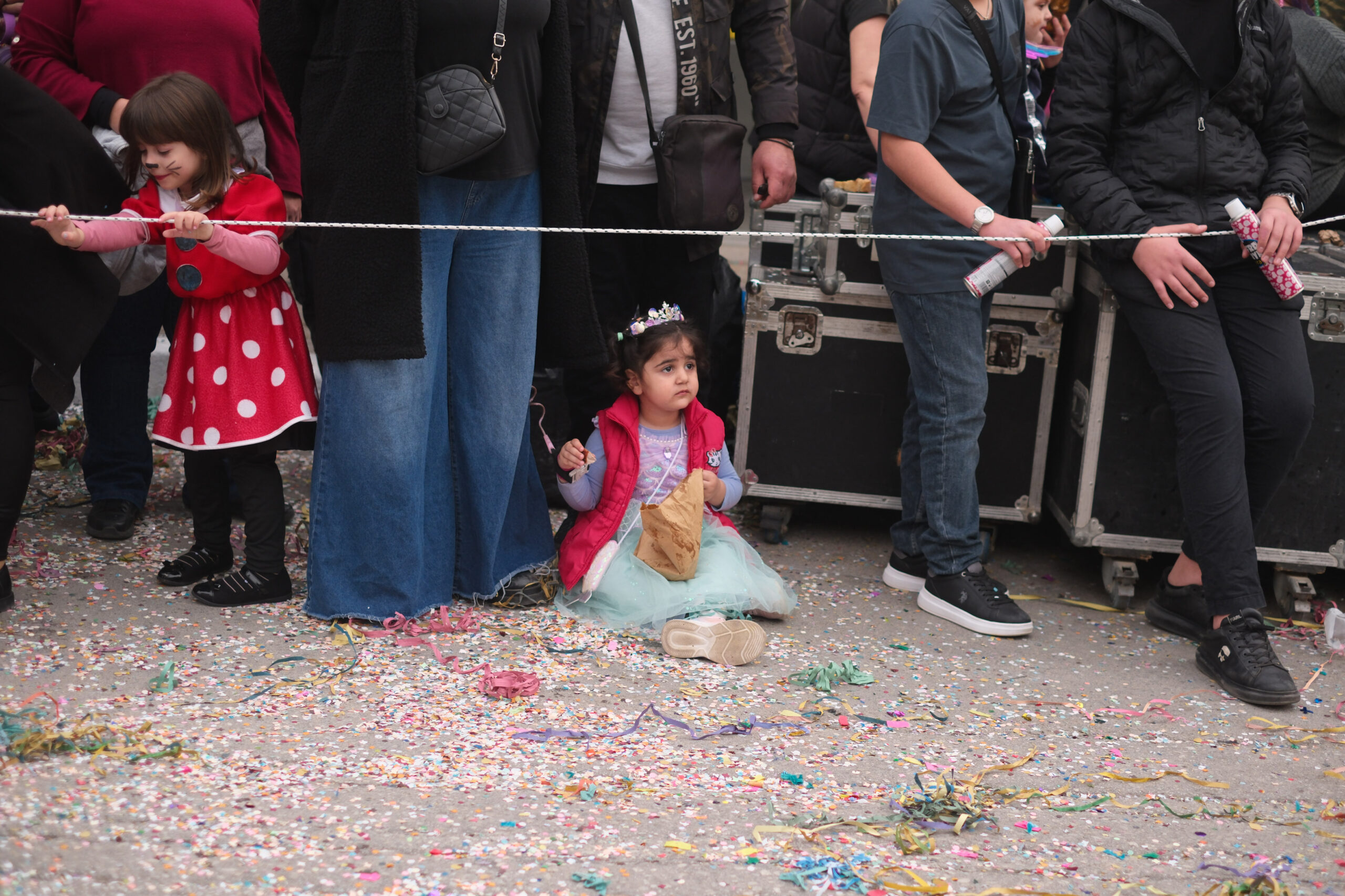 Το σκηνικό της παρέλασης συμπληρώθηκε από τα καθιερωμένα αποκριάτικα αξεσουάρ, με τις σερπαντίνες και τα κονφετί να δημιουργούν μια αίσθηση ατελείωτου πάρτι.