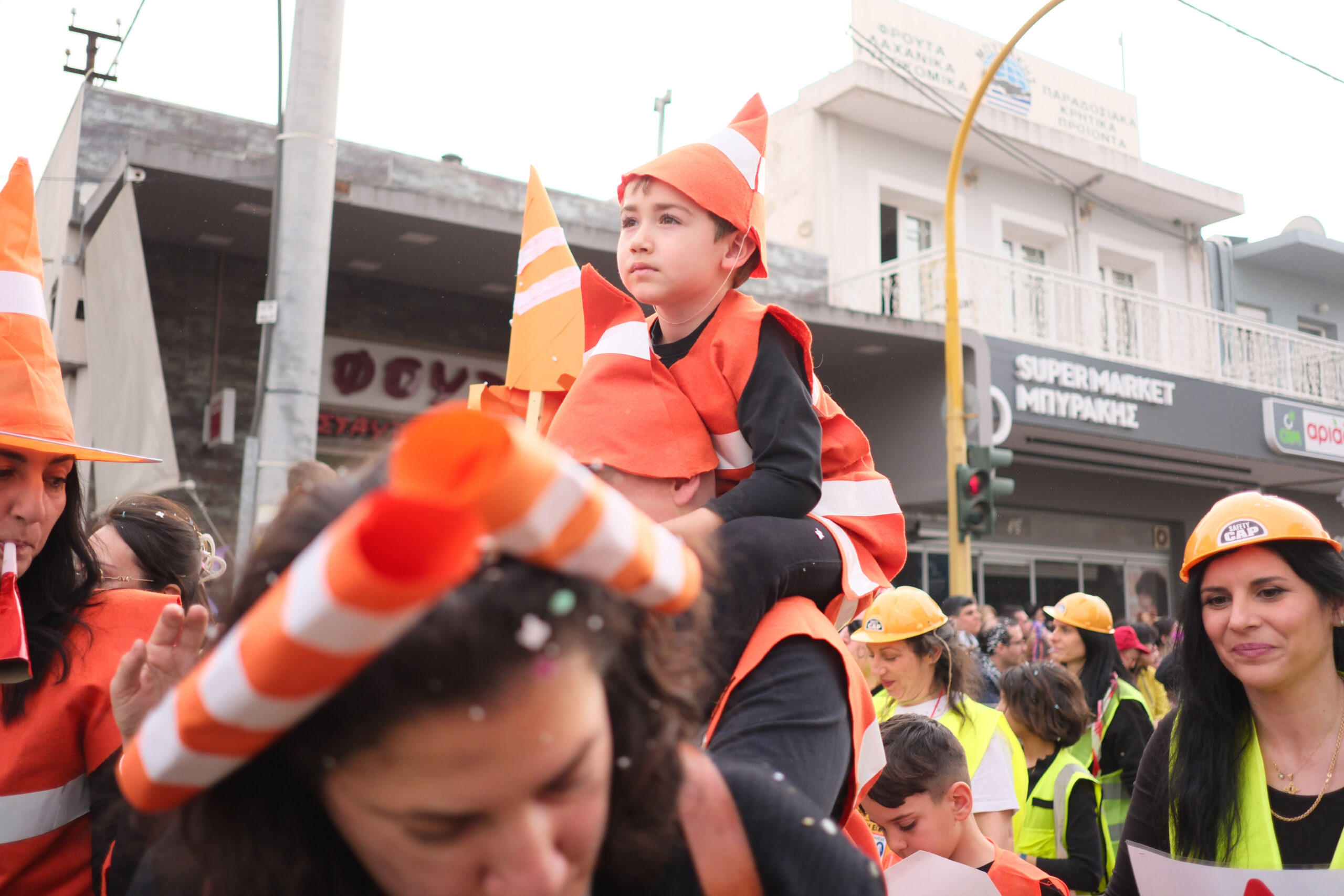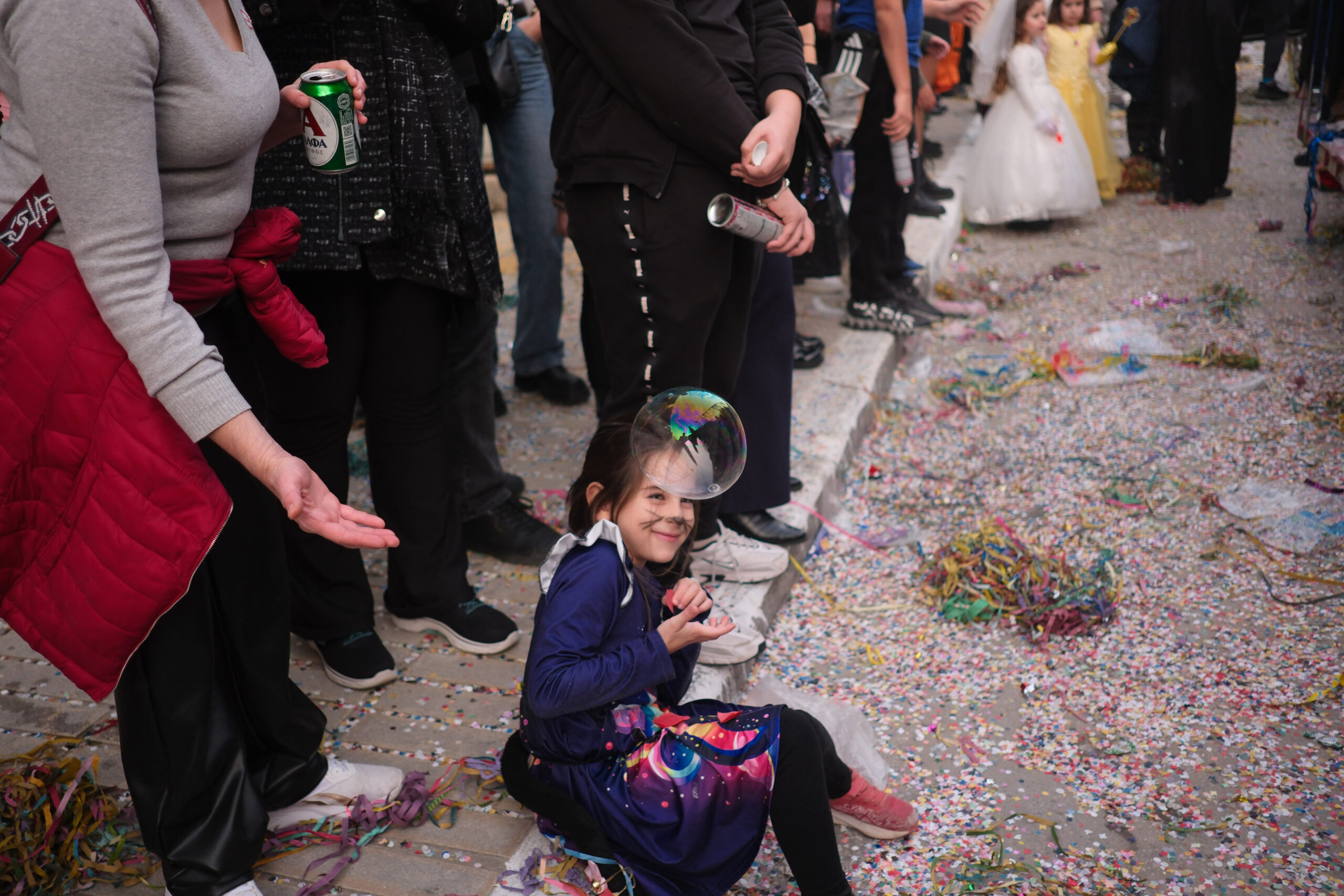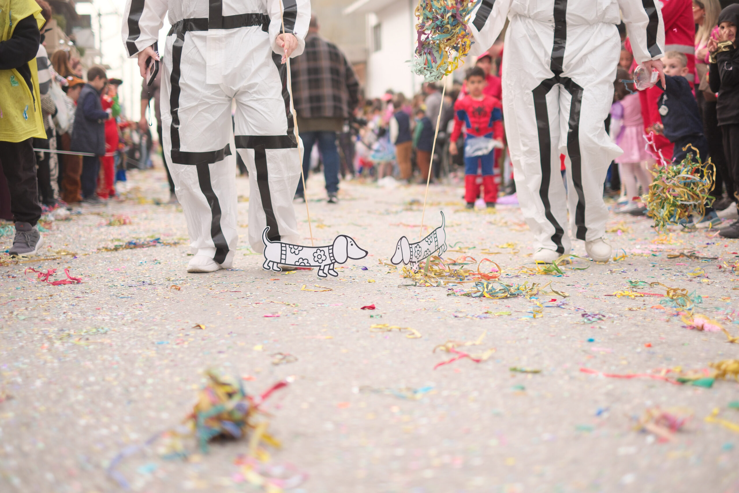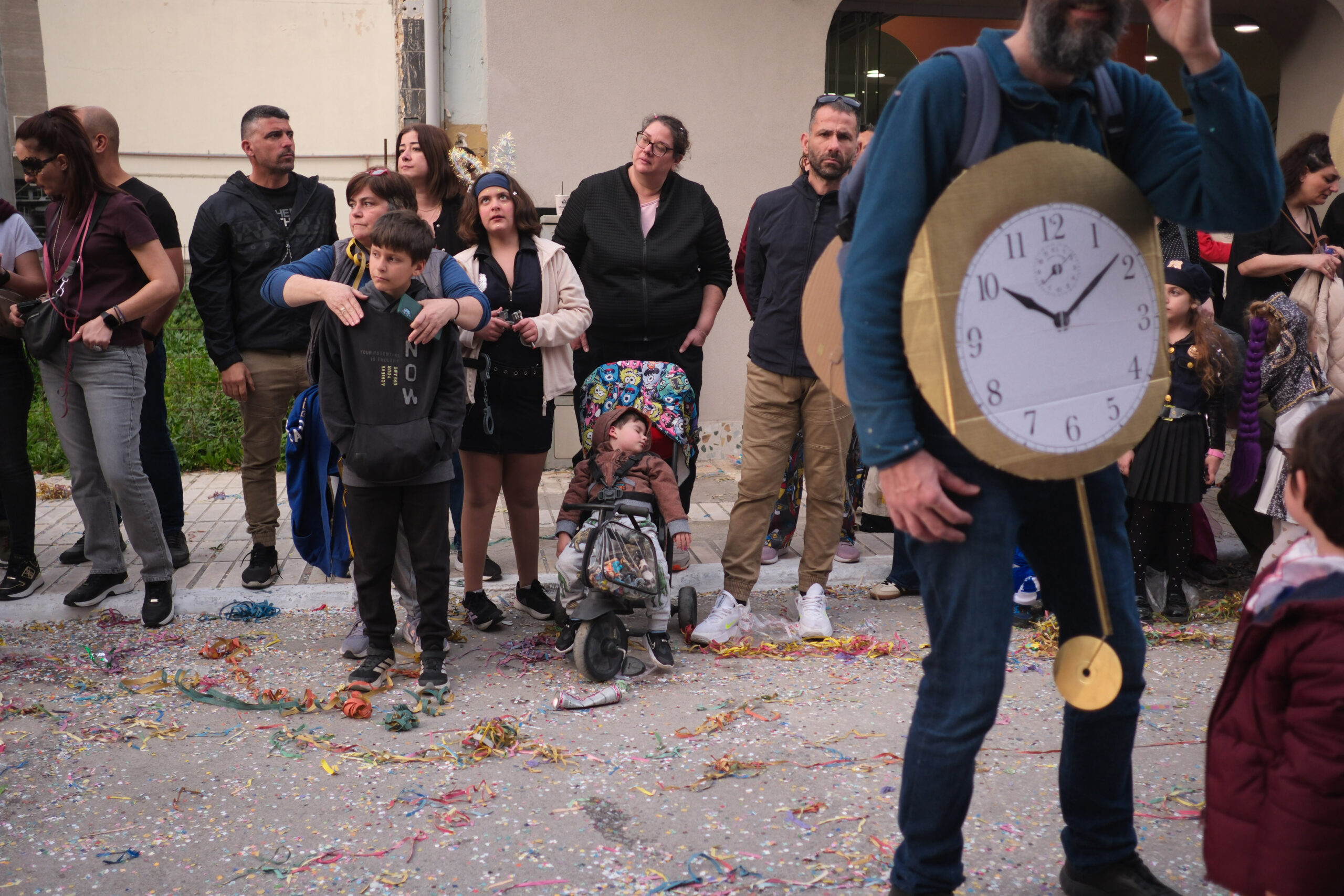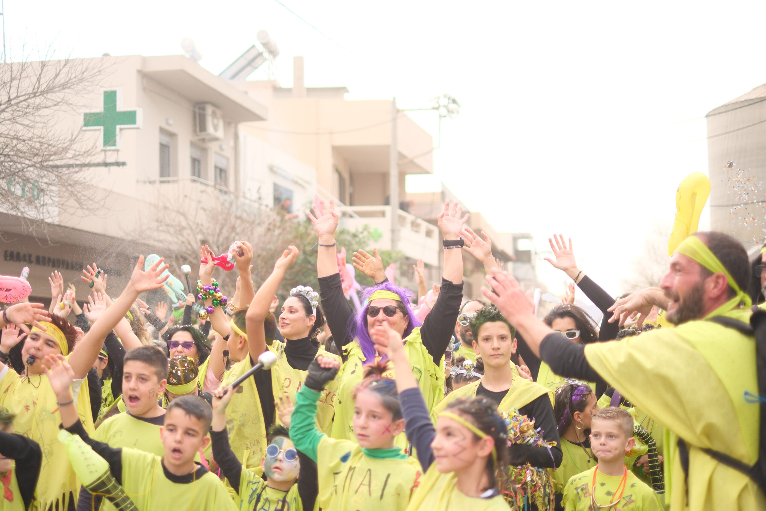 Το σκηνικό της παρέλασης συμπληρώθηκε από τα καθιερωμένα αποκριάτικα αξεσουάρ, με τις σερπαντίνες και τα κονφετί να δημιουργούν μια αίσθηση ατελείωτου πάρτι.