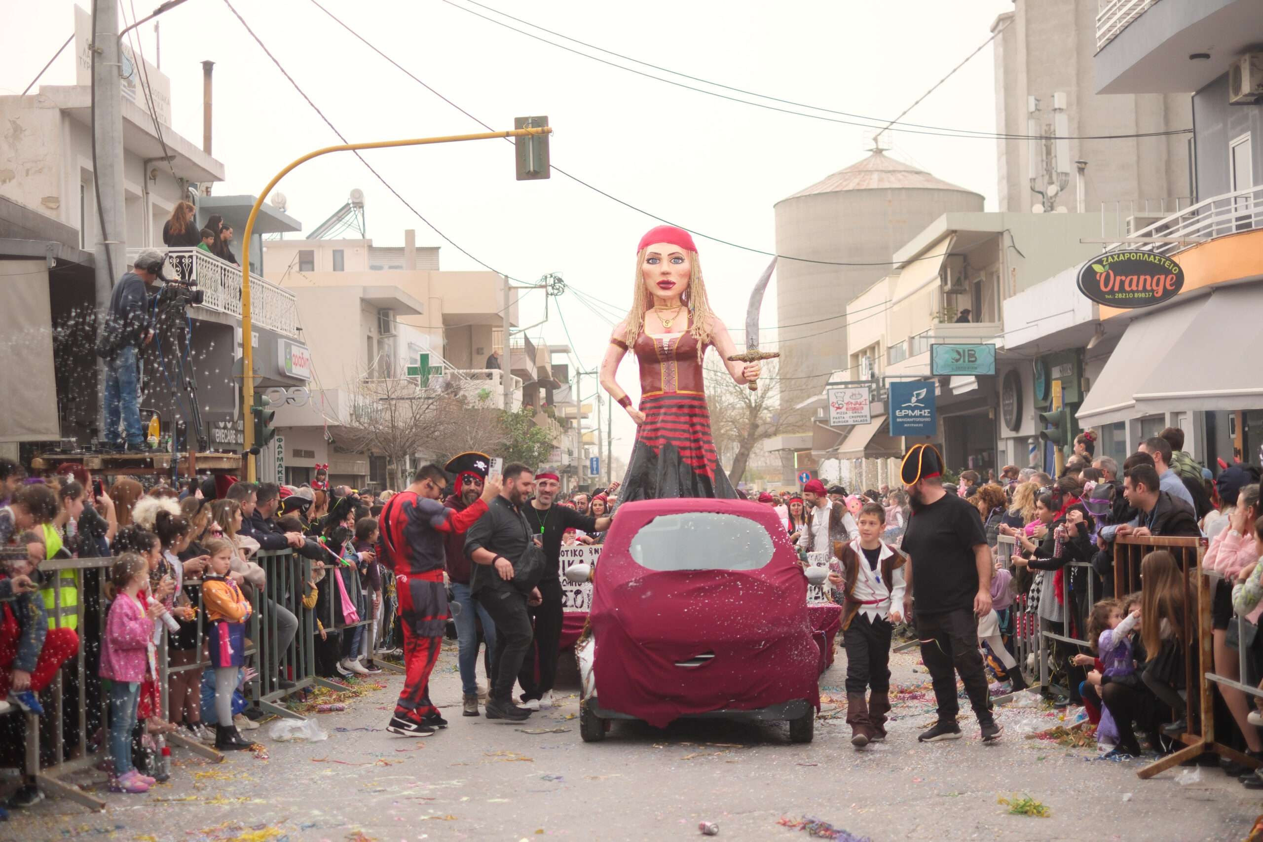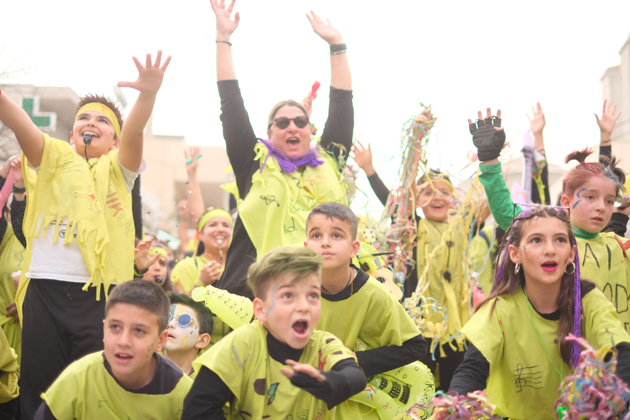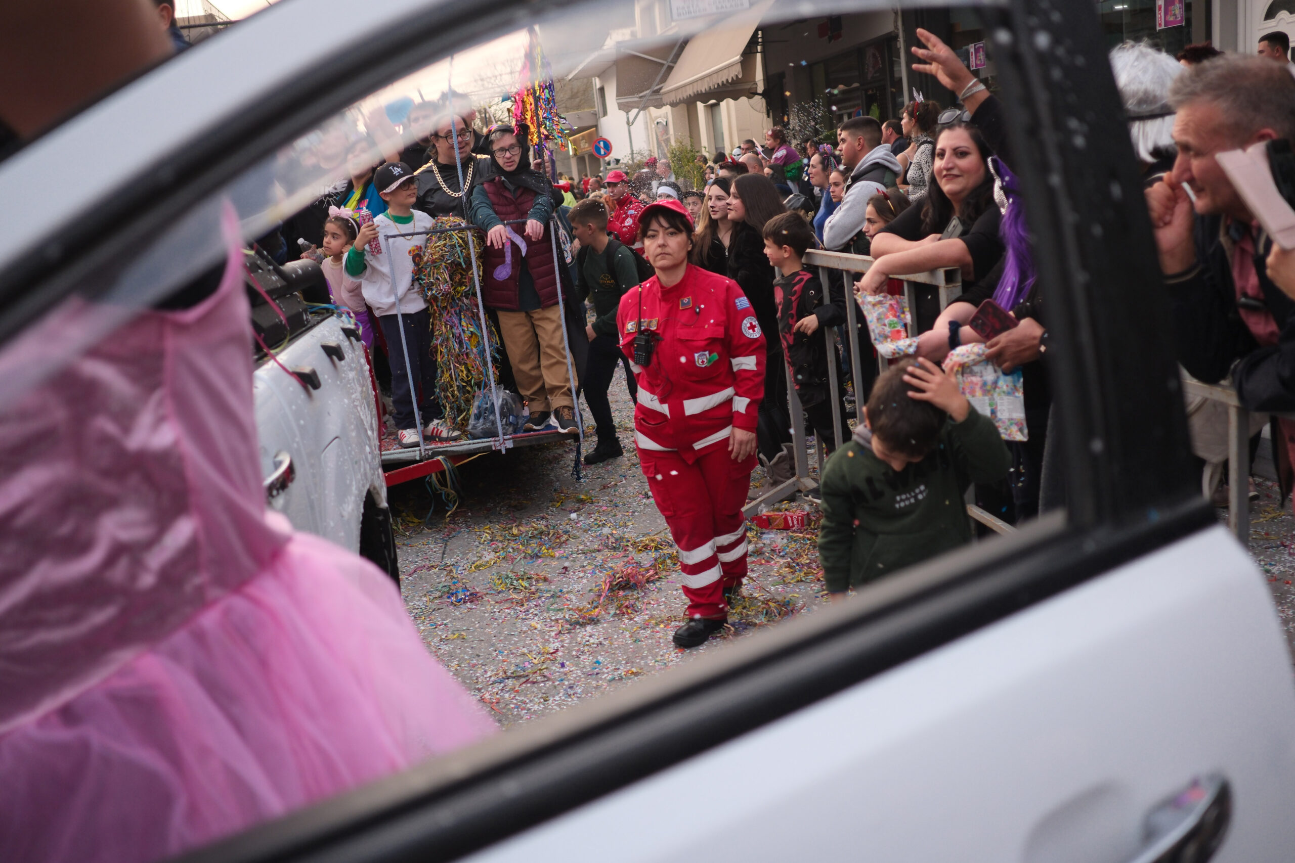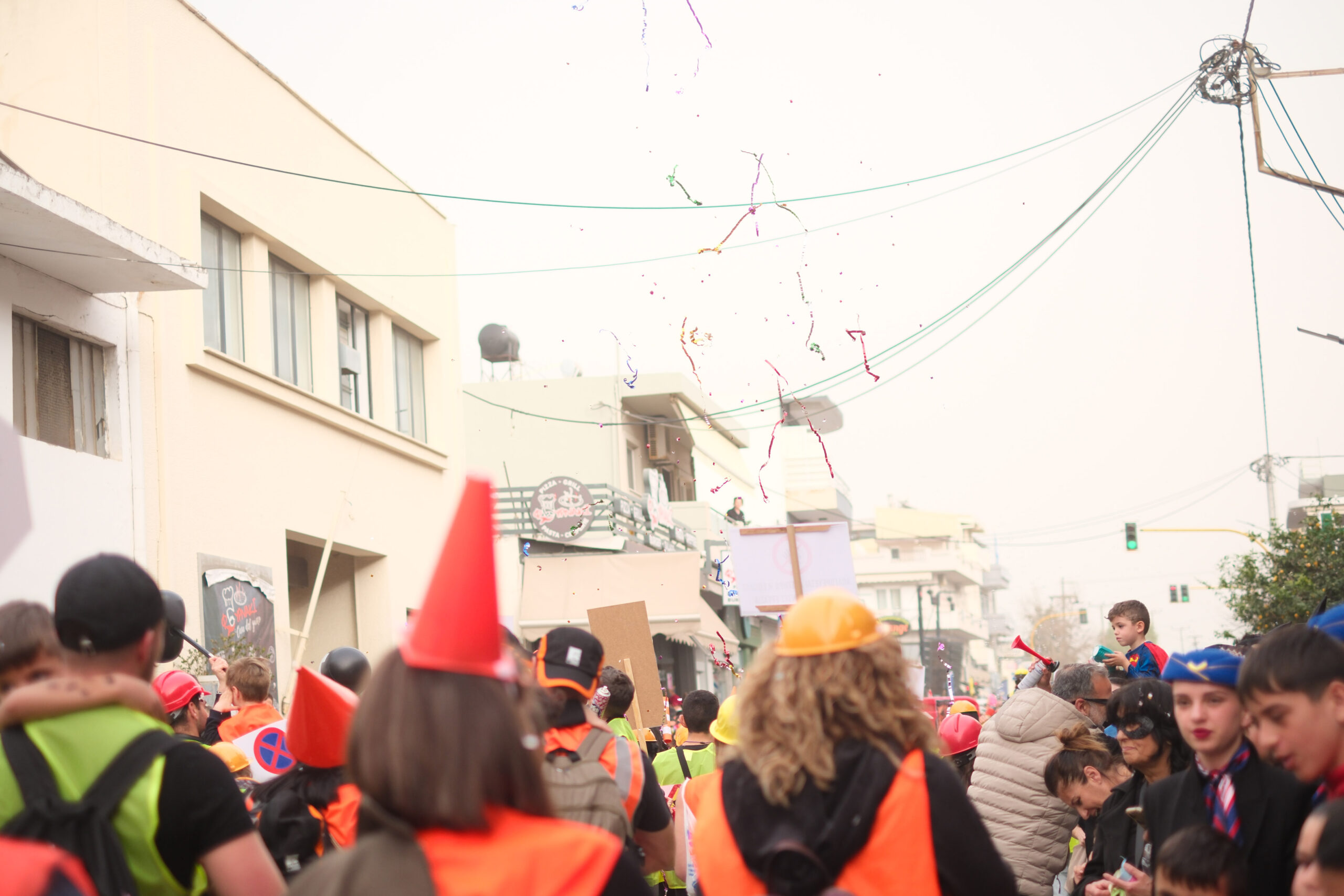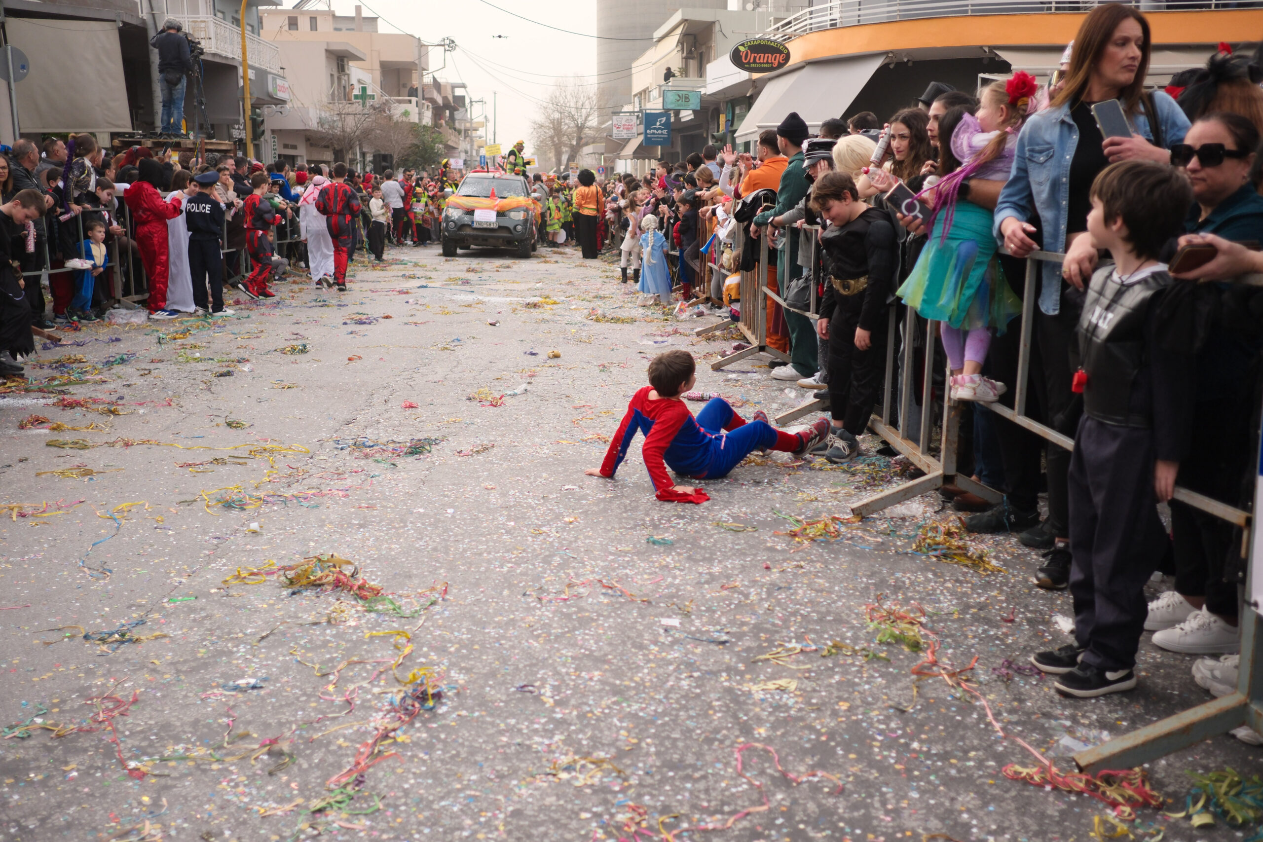 Το σκηνικό της παρέλασης συμπληρώθηκε από τα καθιερωμένα αποκριάτικα αξεσουάρ, με τις σερπαντίνες και τα κονφετί να δημιουργούν μια αίσθηση ατελείωτου πάρτι.