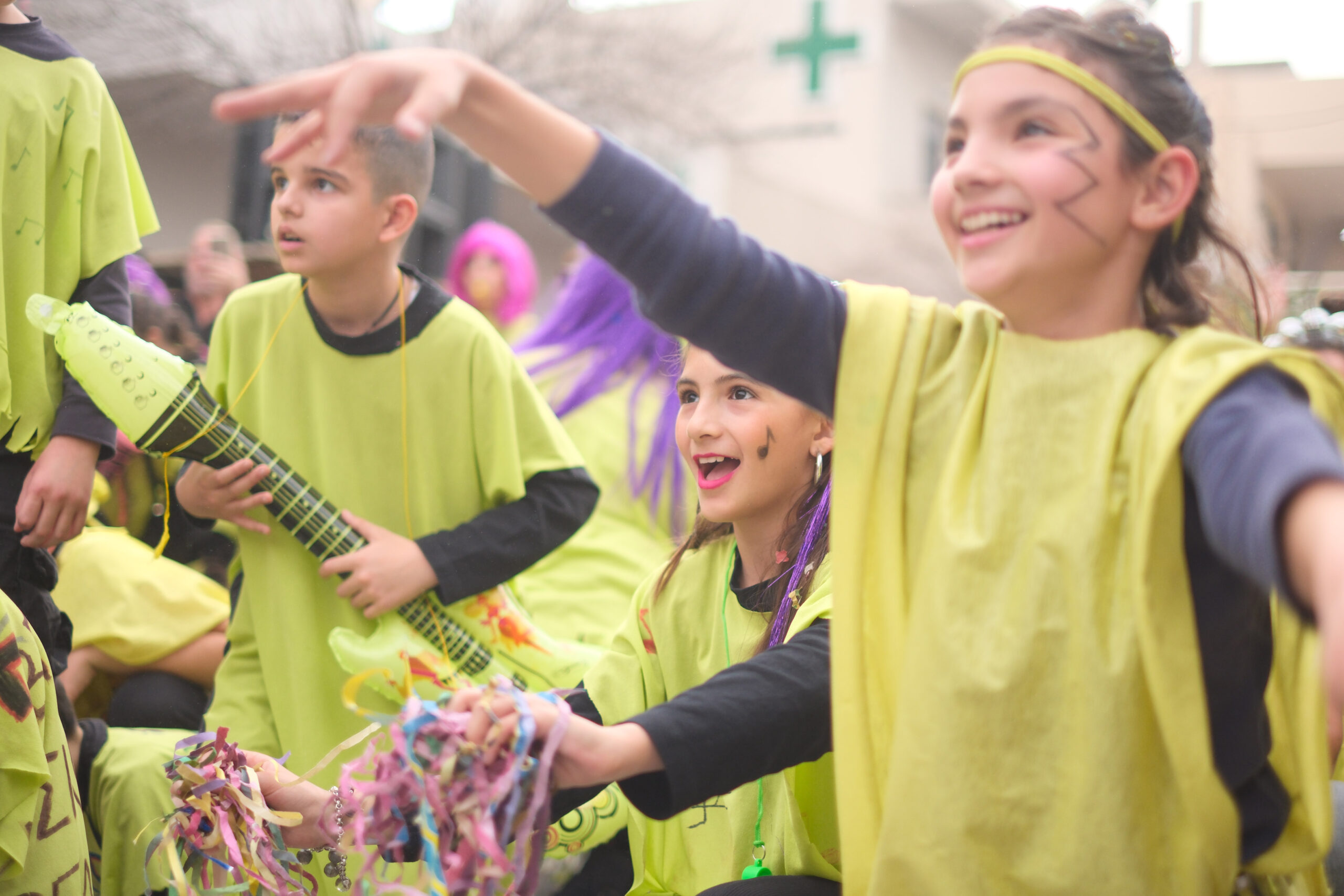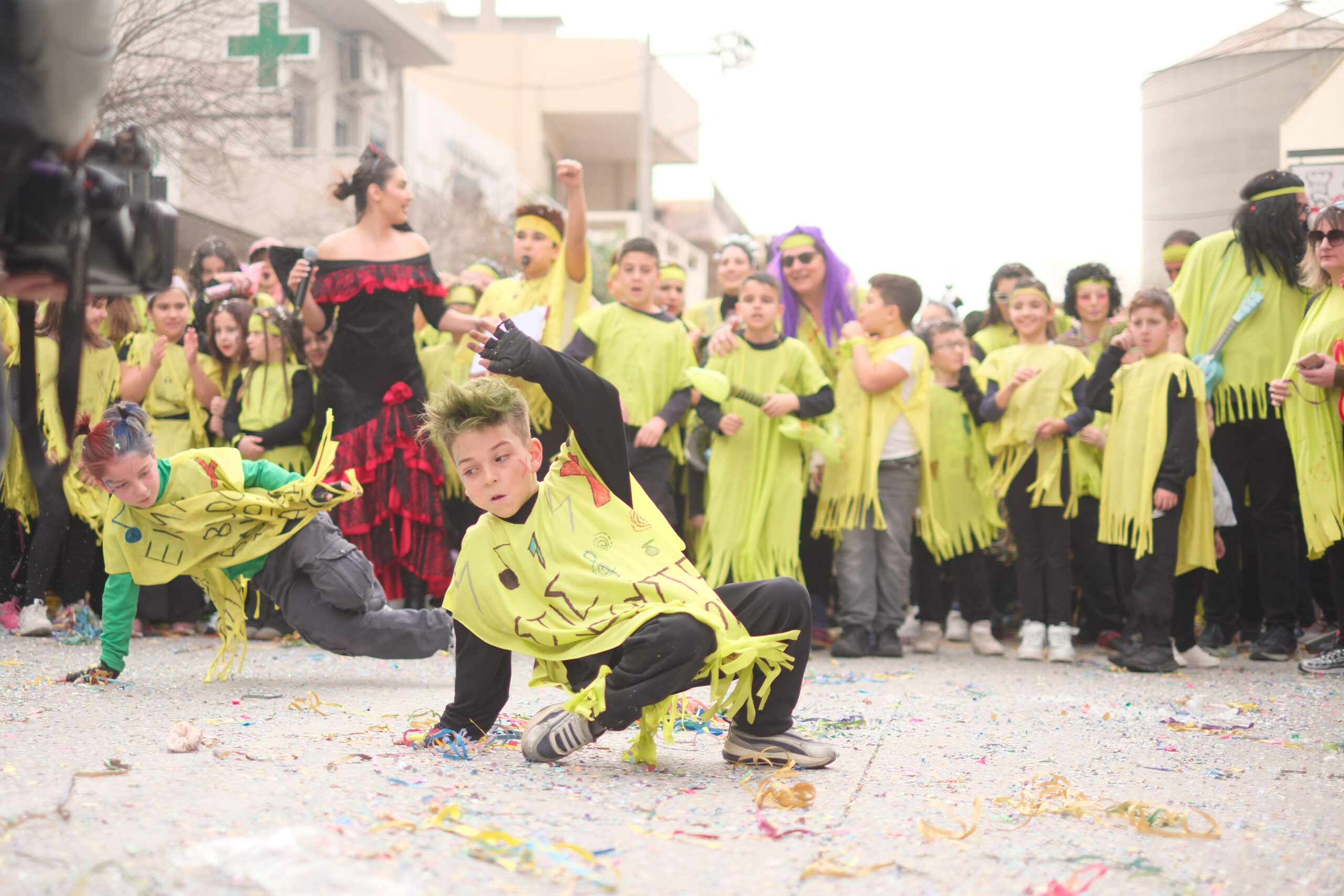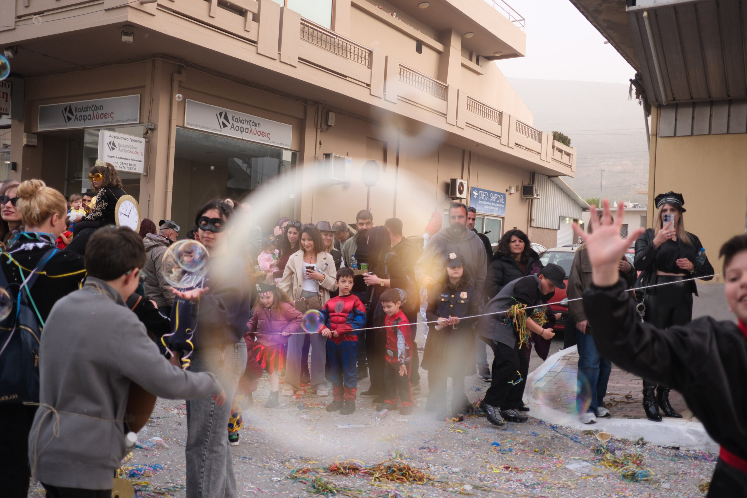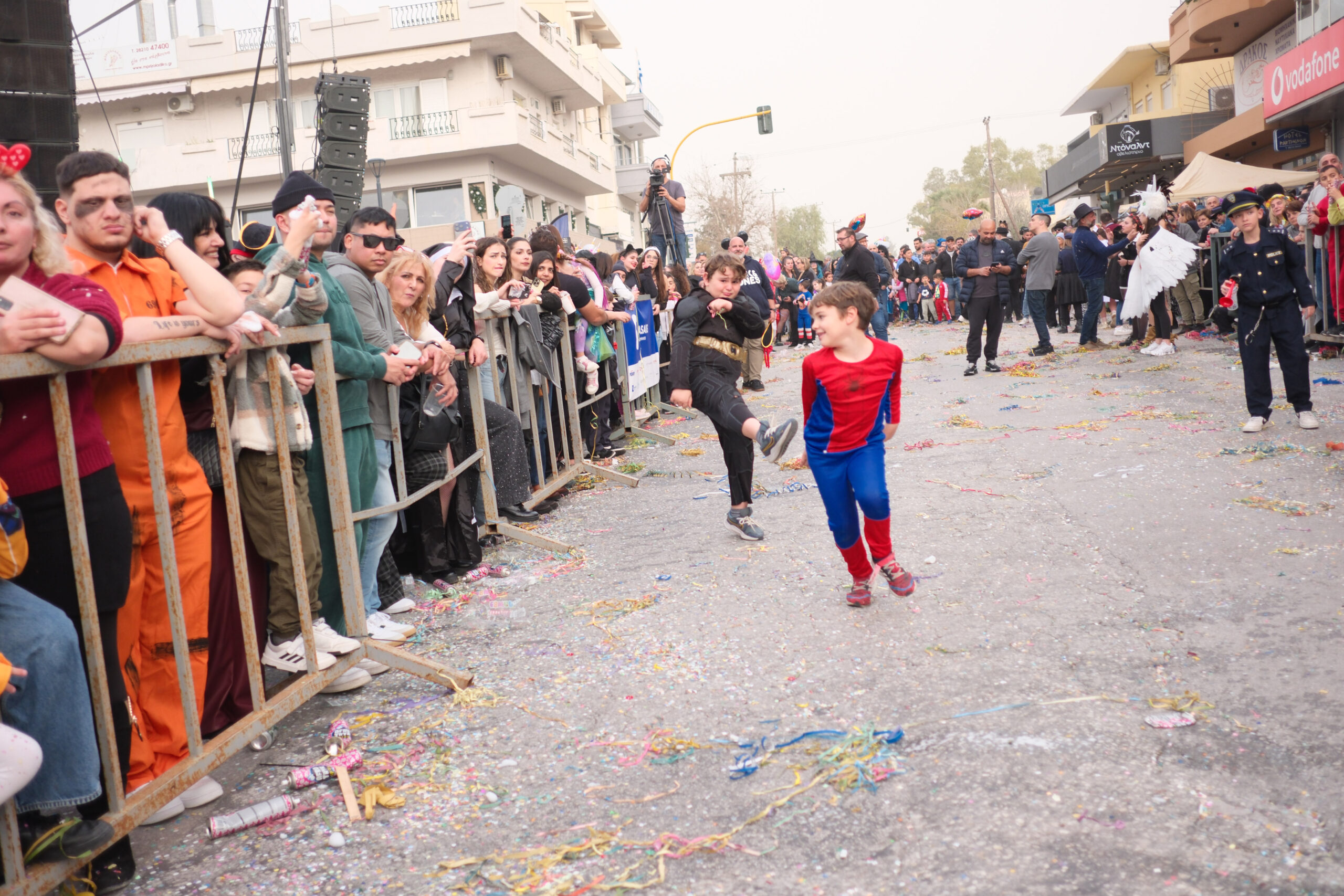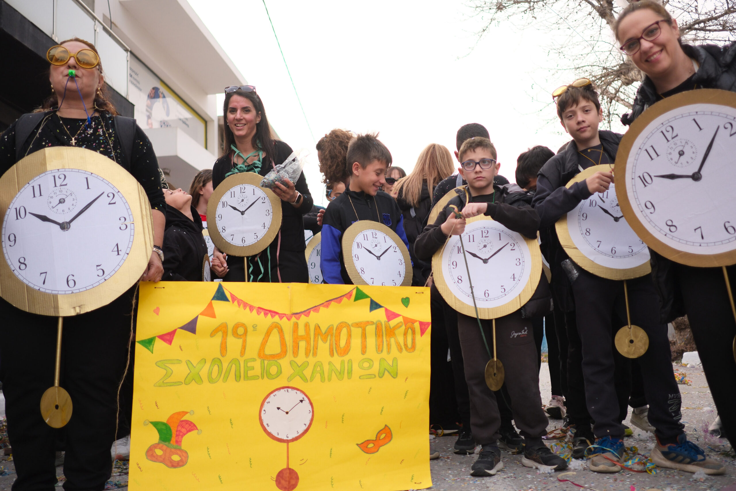 Το σκηνικό της παρέλασης συμπληρώθηκε από τα καθιερωμένα αποκριάτικα αξεσουάρ, με τις σερπαντίνες και τα κονφετί να δημιουργούν μια αίσθηση ατελείωτου πάρτι.