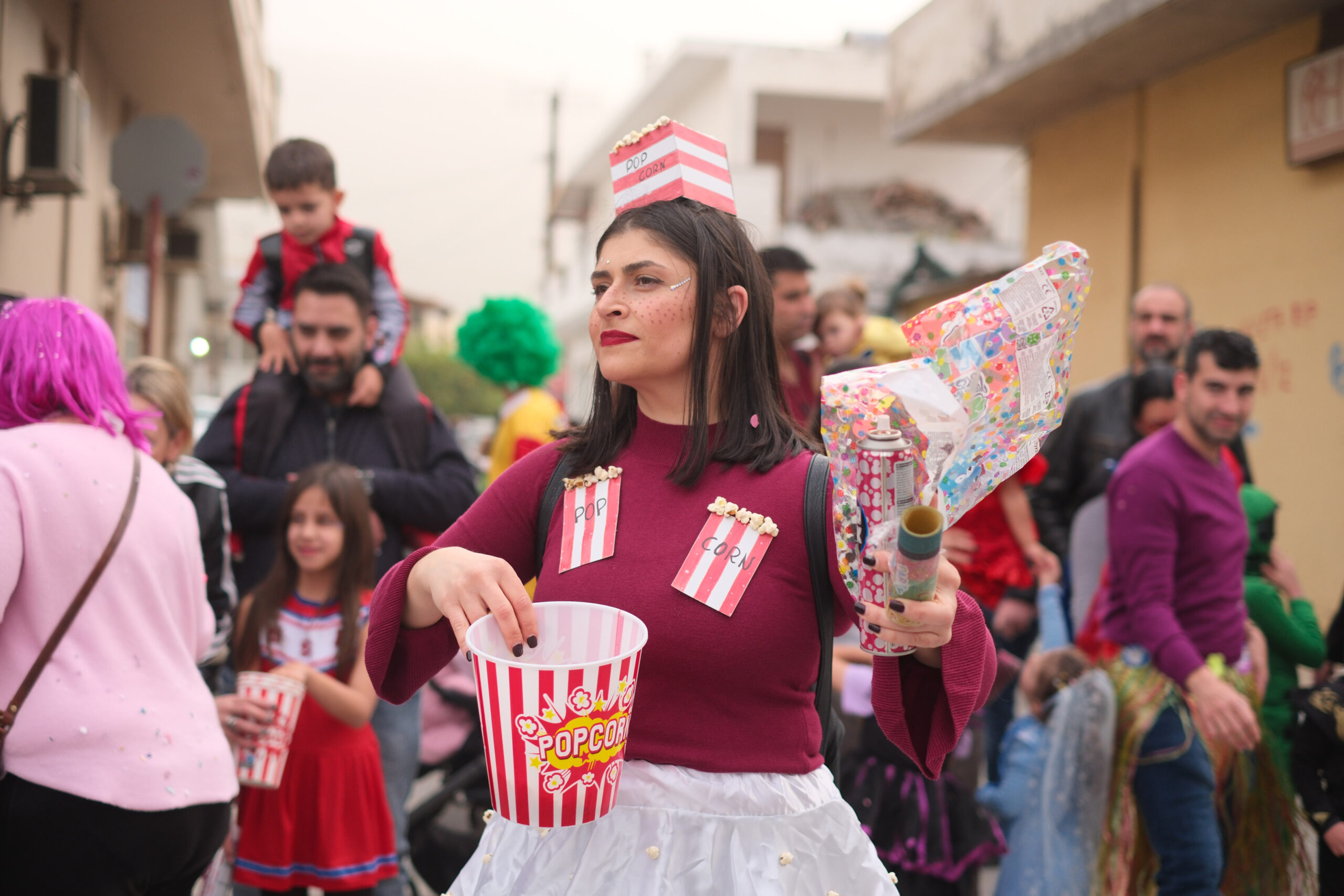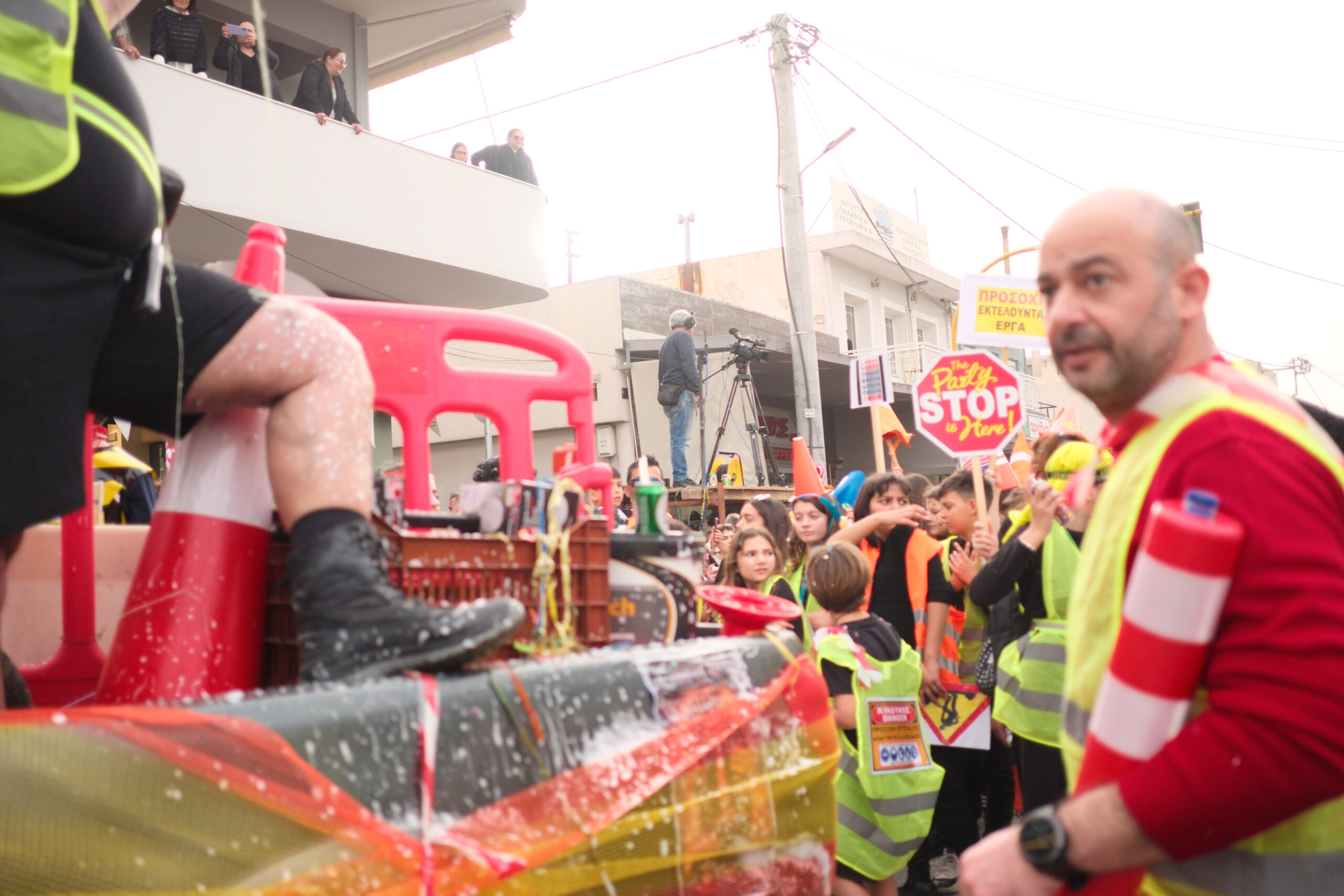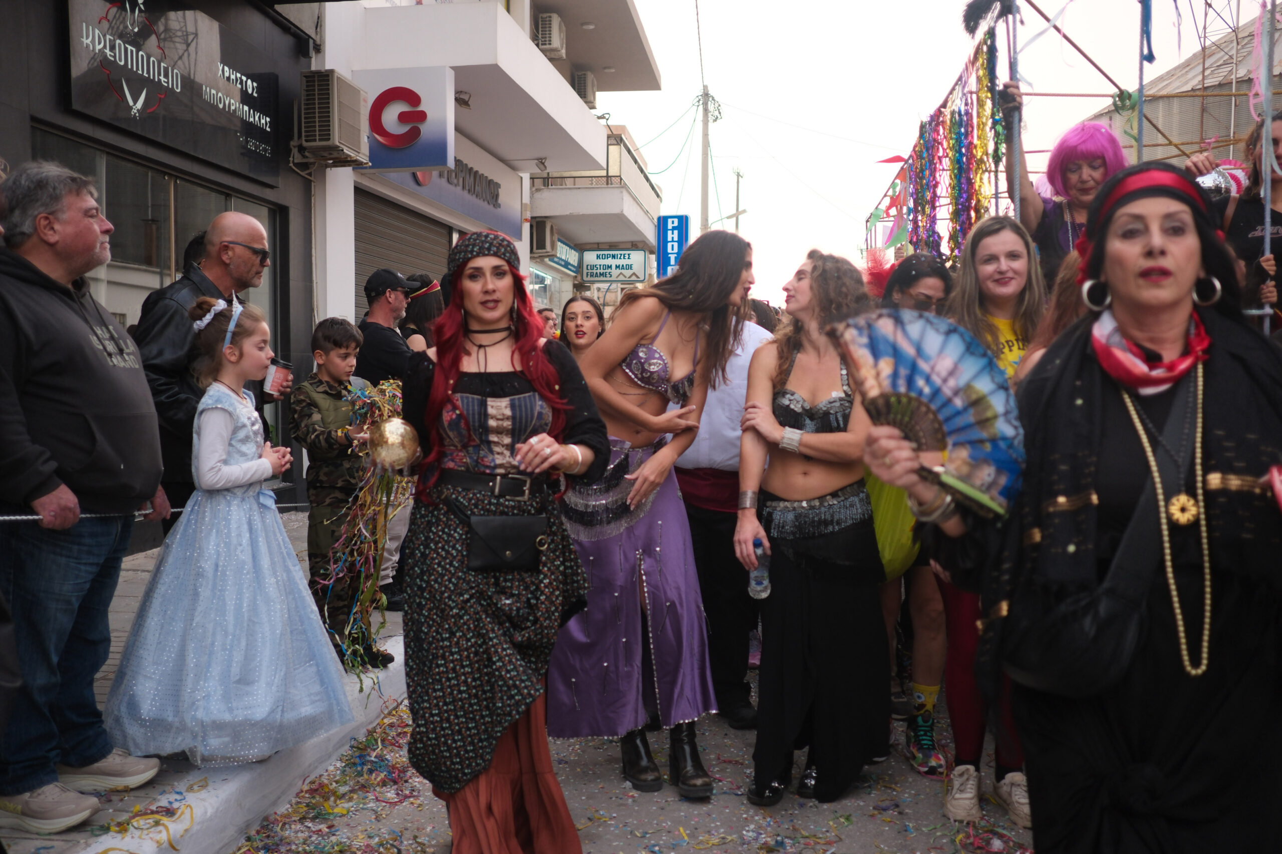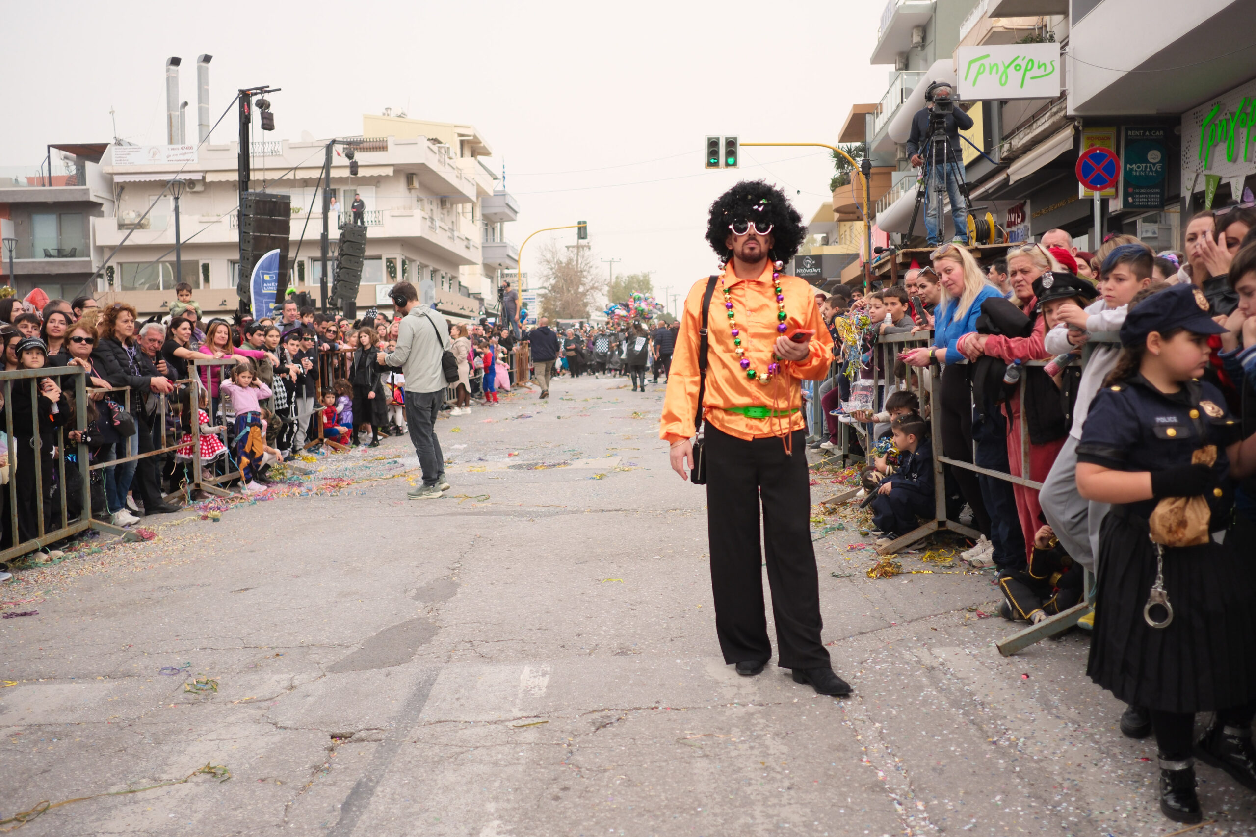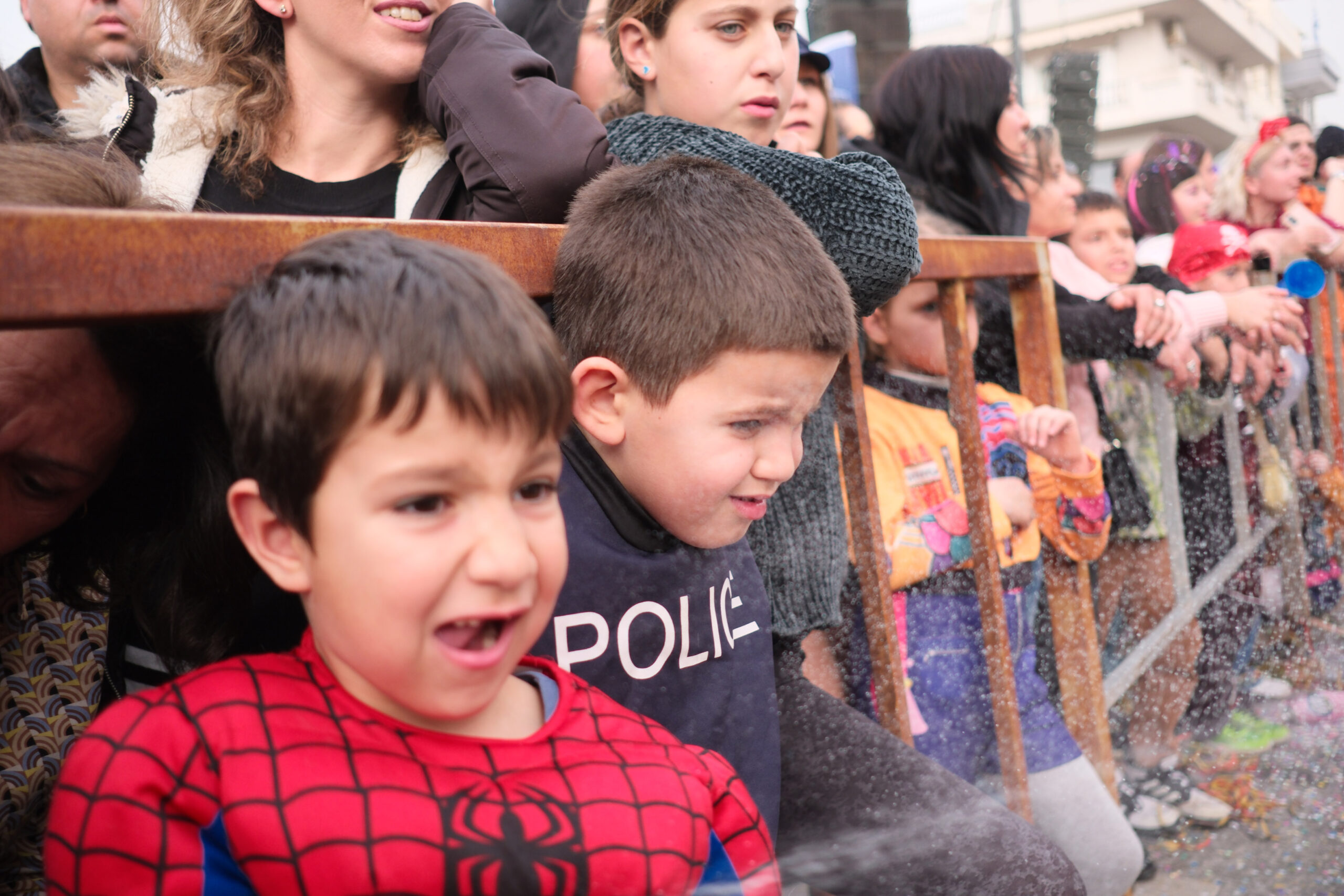 Το σκηνικό της παρέλασης συμπληρώθηκε από τα καθιερωμένα αποκριάτικα αξεσουάρ, με τις σερπαντίνες και τα κονφετί να δημιουργούν μια αίσθηση ατελείωτου πάρτι.