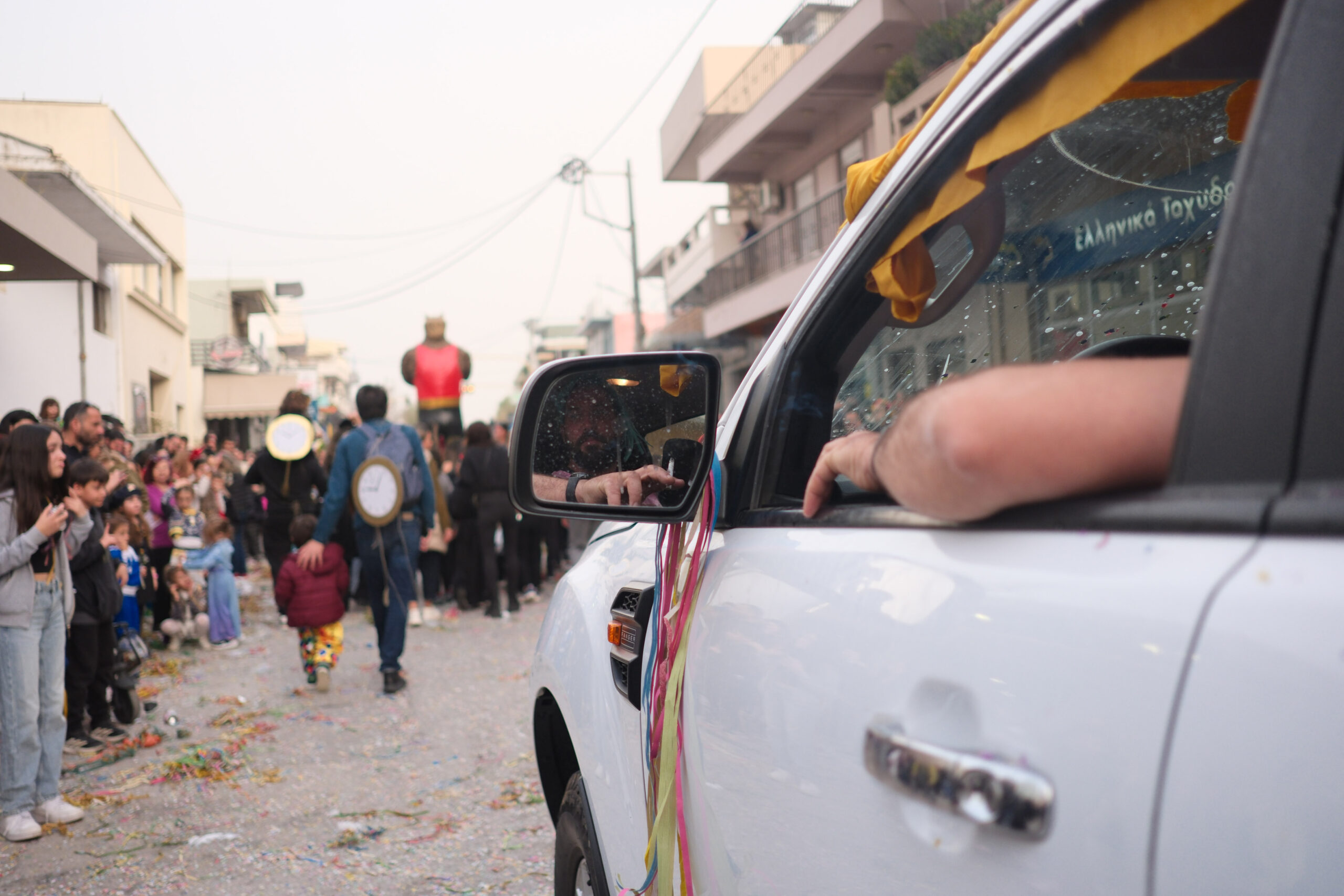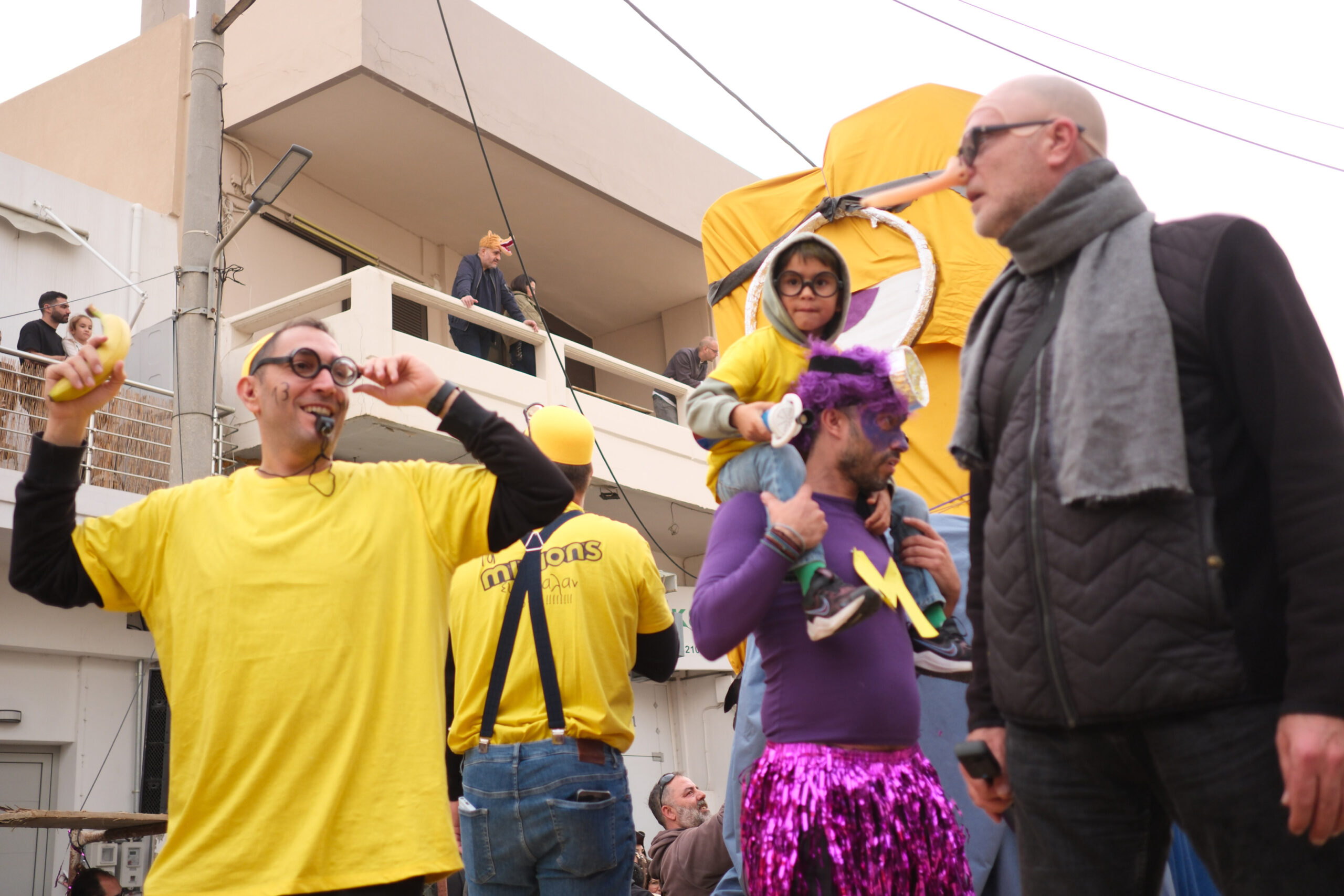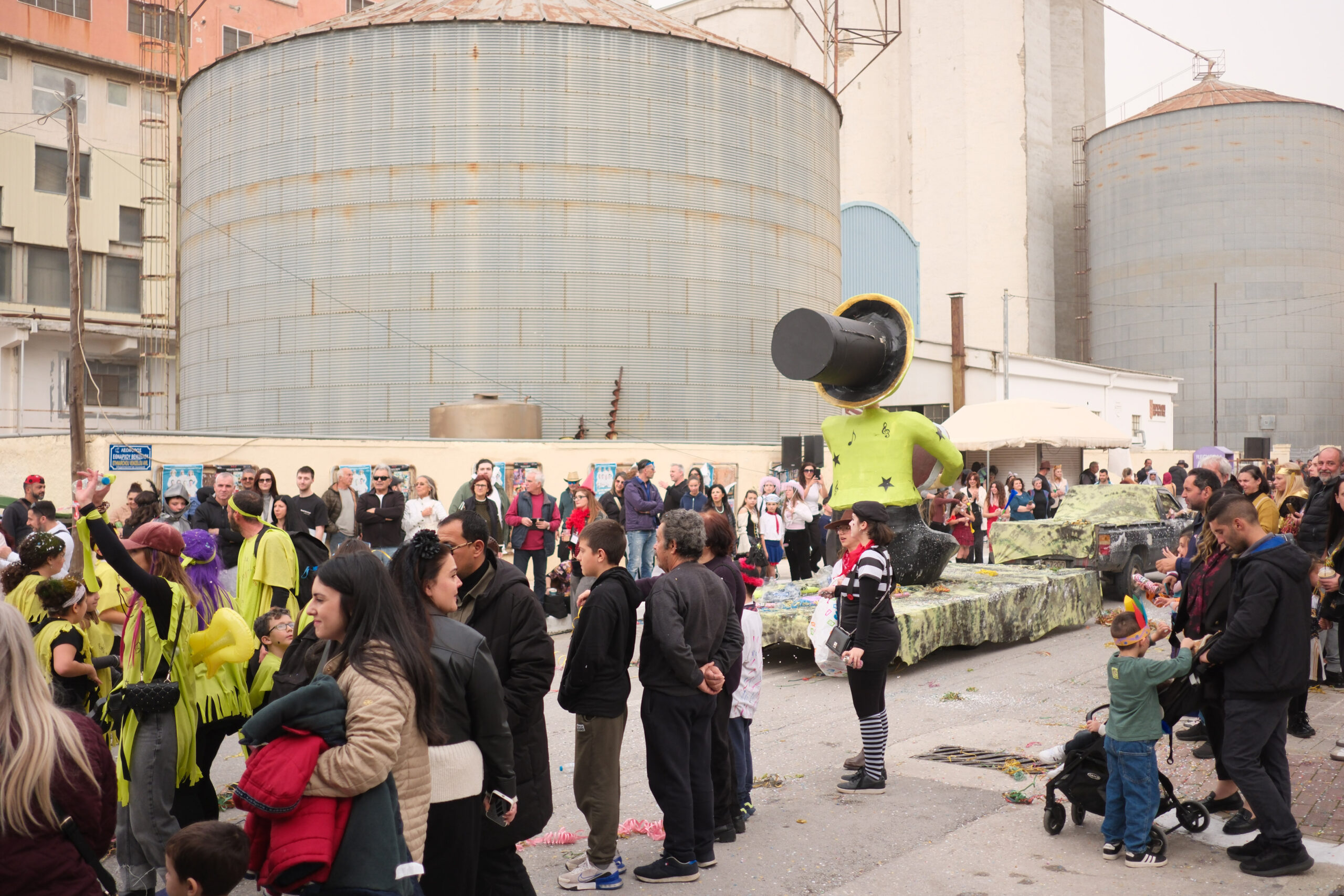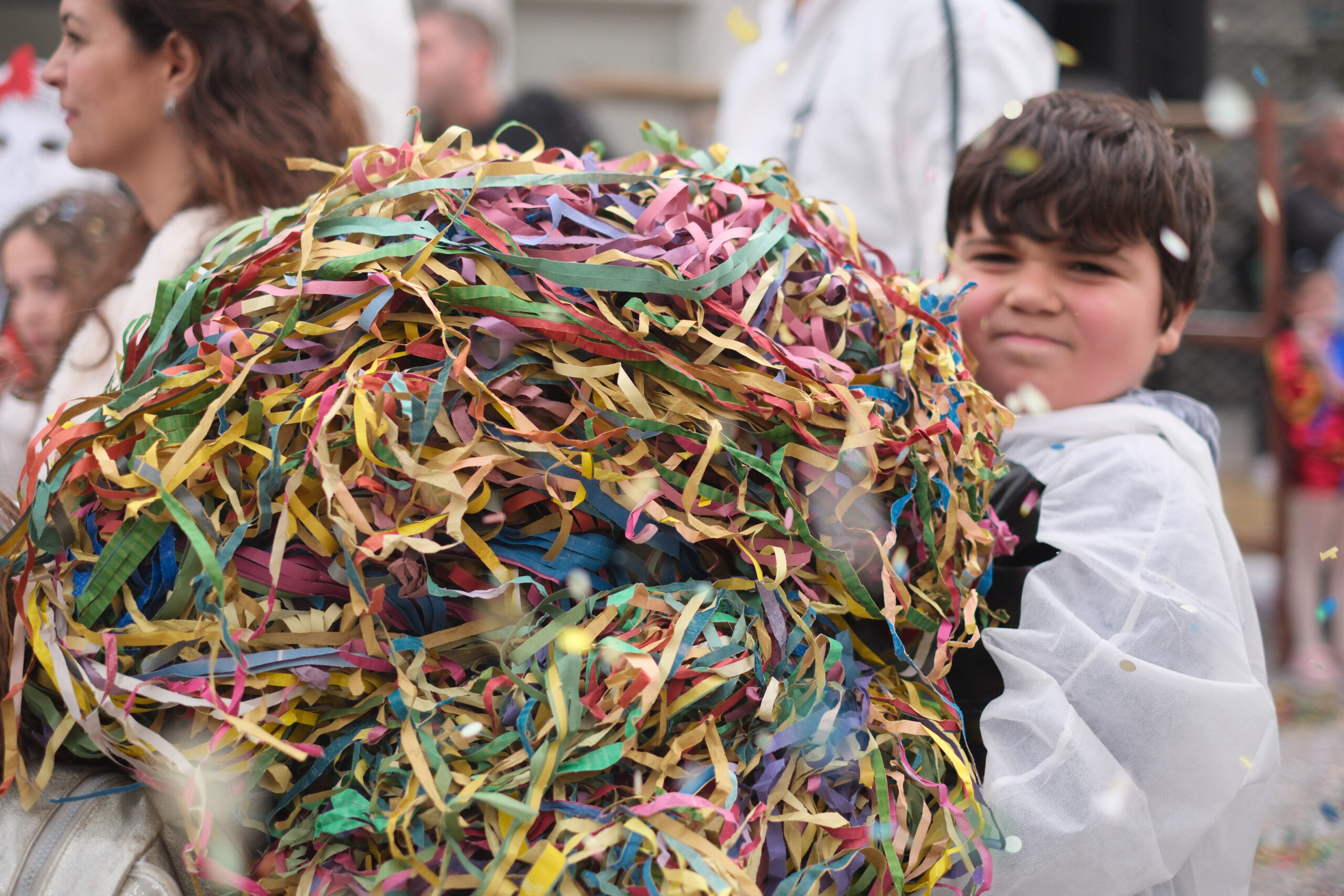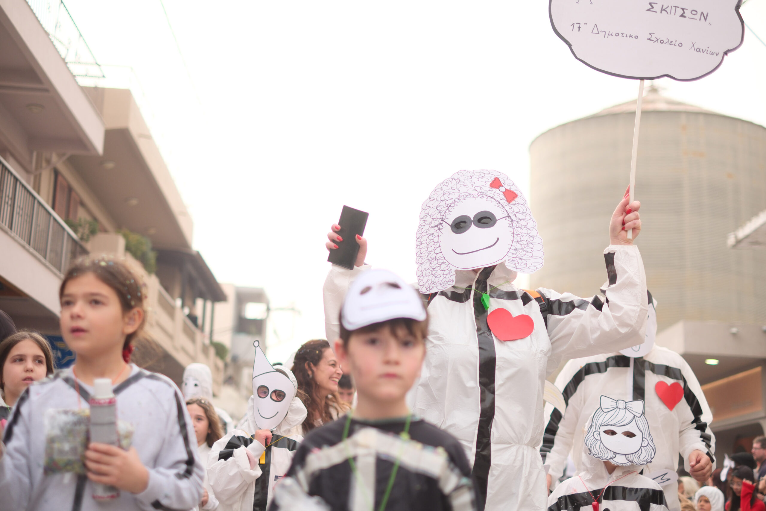 Το σκηνικό της παρέλασης συμπληρώθηκε από τα καθιερωμένα αποκριάτικα αξεσουάρ, με τις σερπαντίνες και τα κονφετί να δημιουργούν μια αίσθηση ατελείωτου πάρτι.