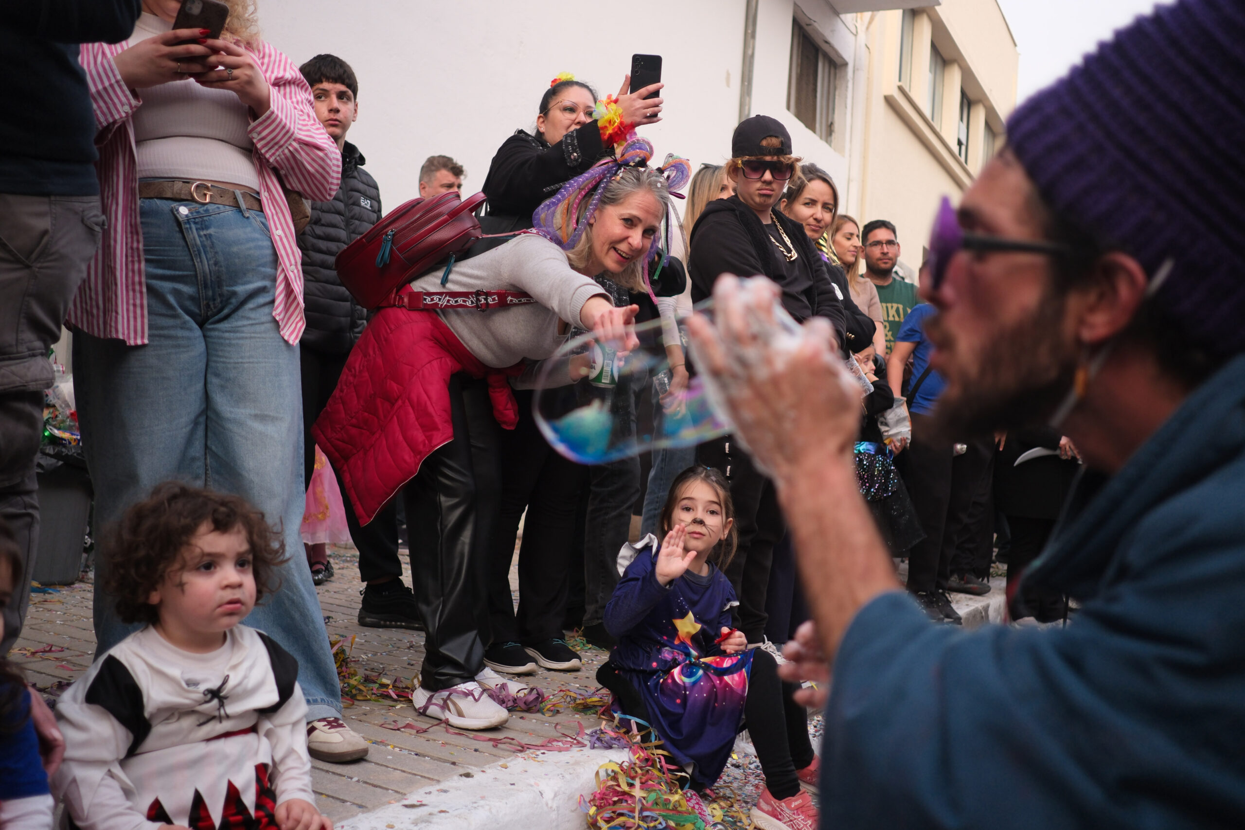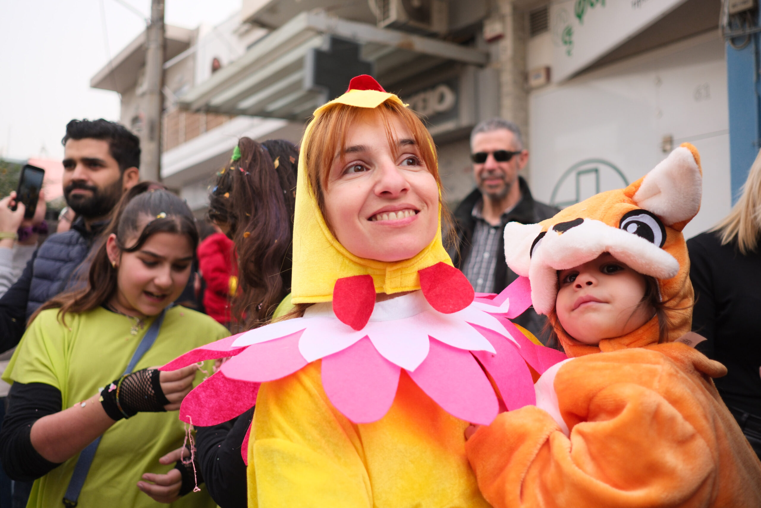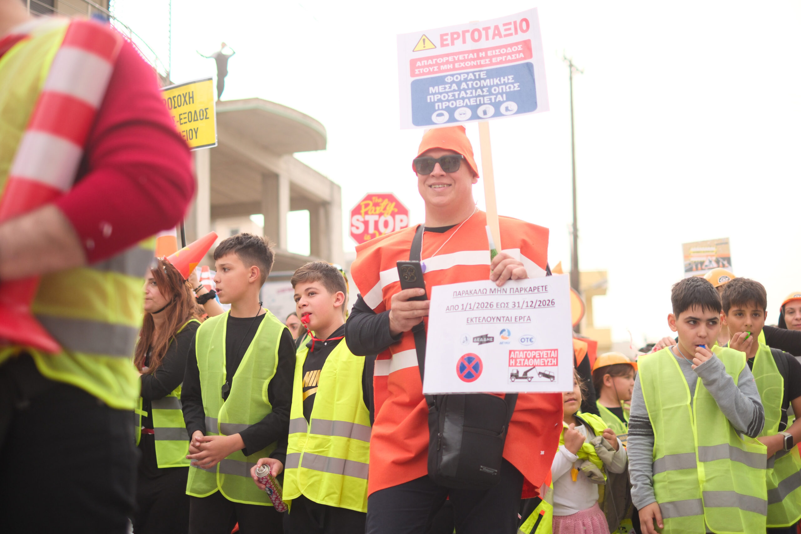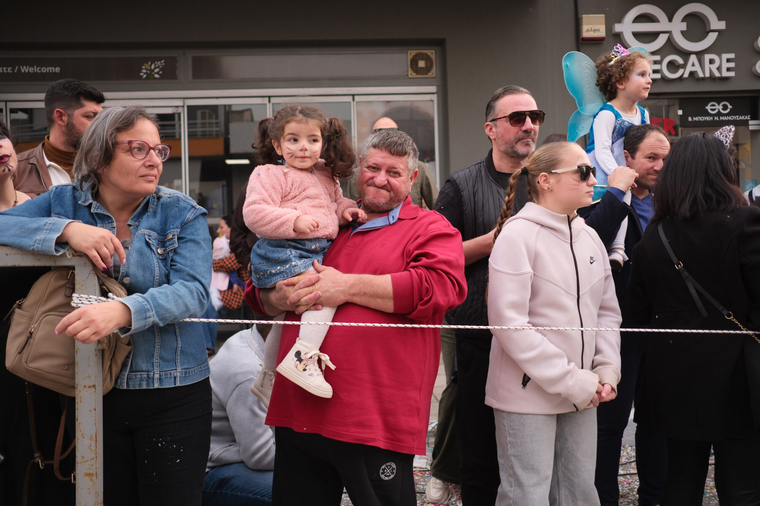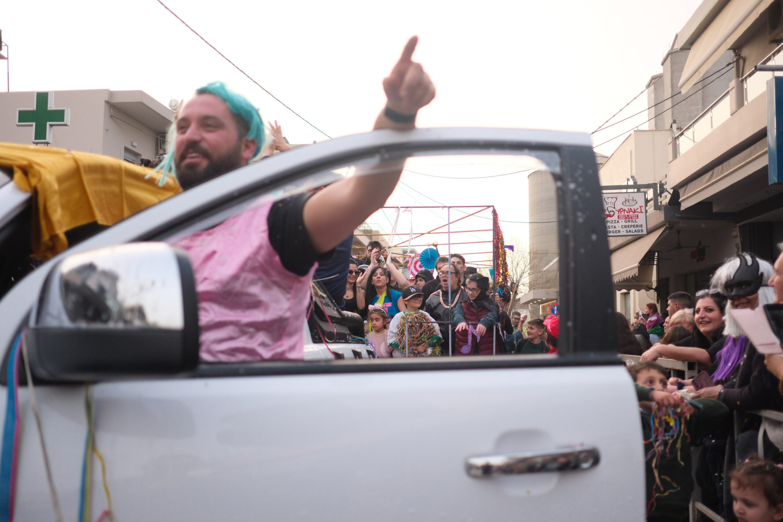 Το σκηνικό της παρέλασης συμπληρώθηκε από τα καθιερωμένα αποκριάτικα αξεσουάρ, με τις σερπαντίνες και τα κονφετί να δημιουργούν μια αίσθηση ατελείωτου πάρτι.