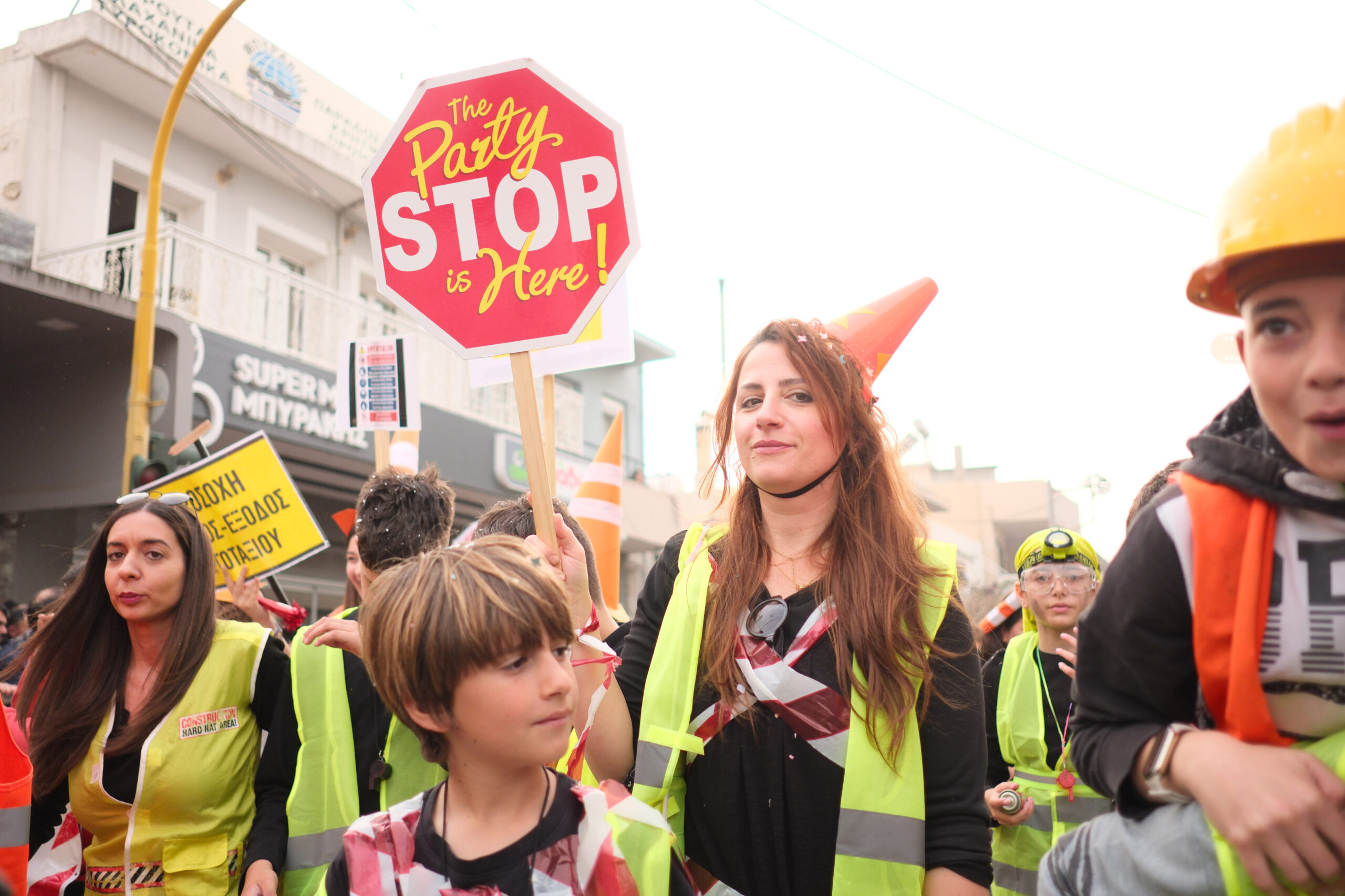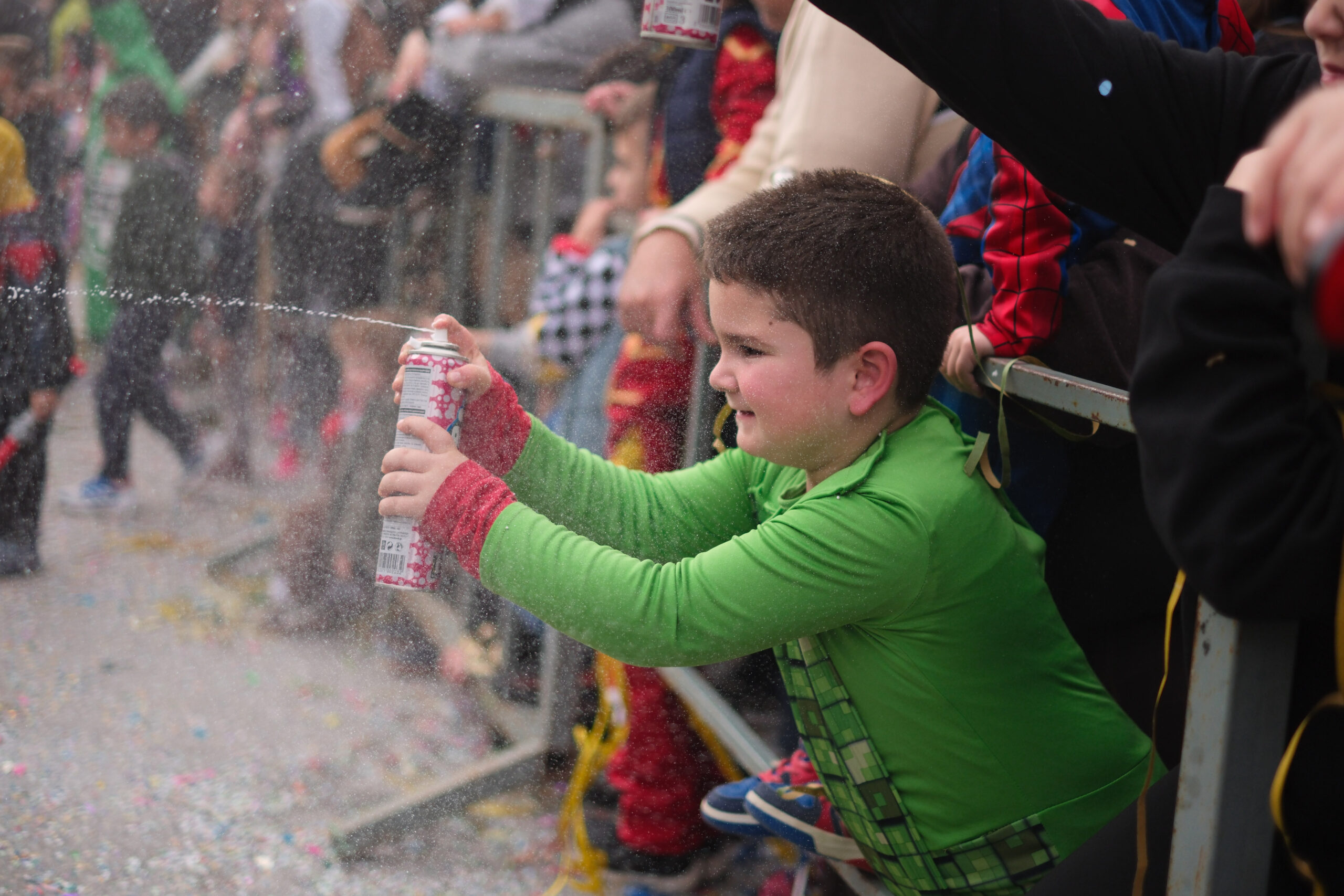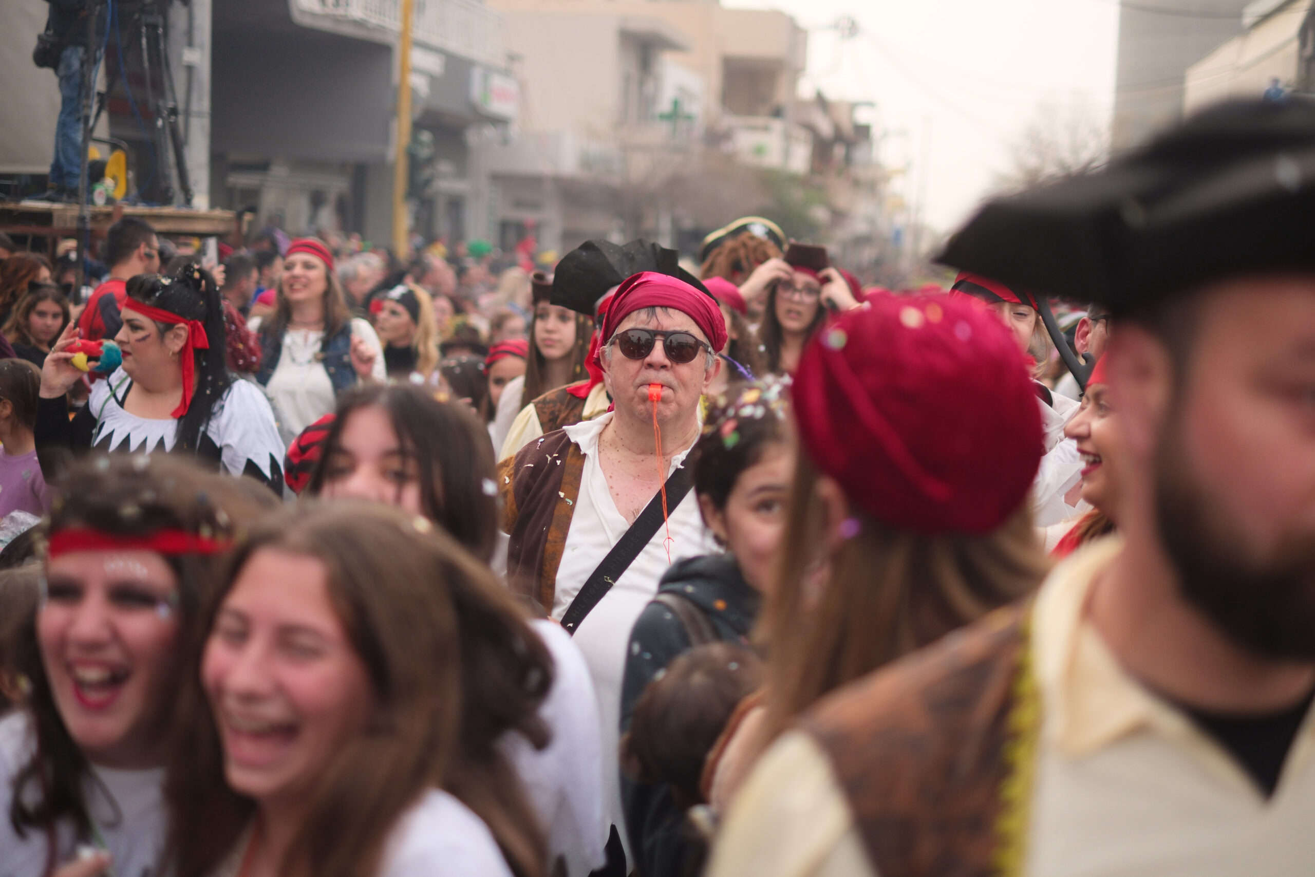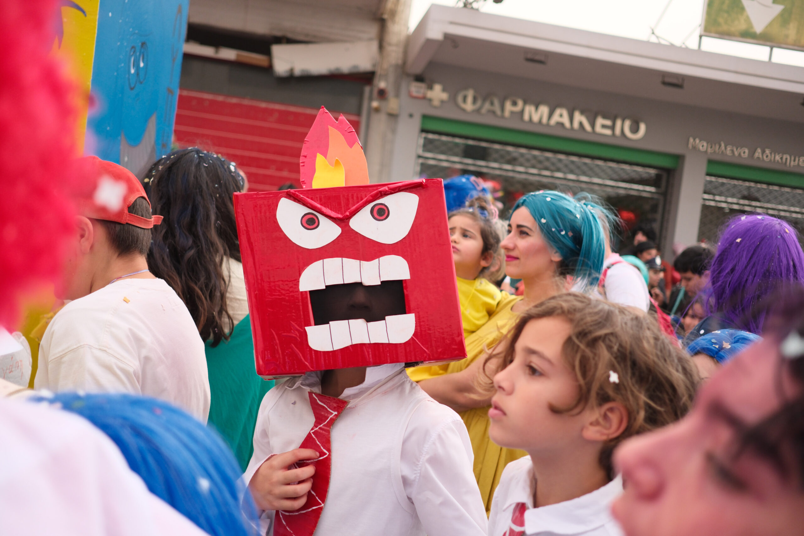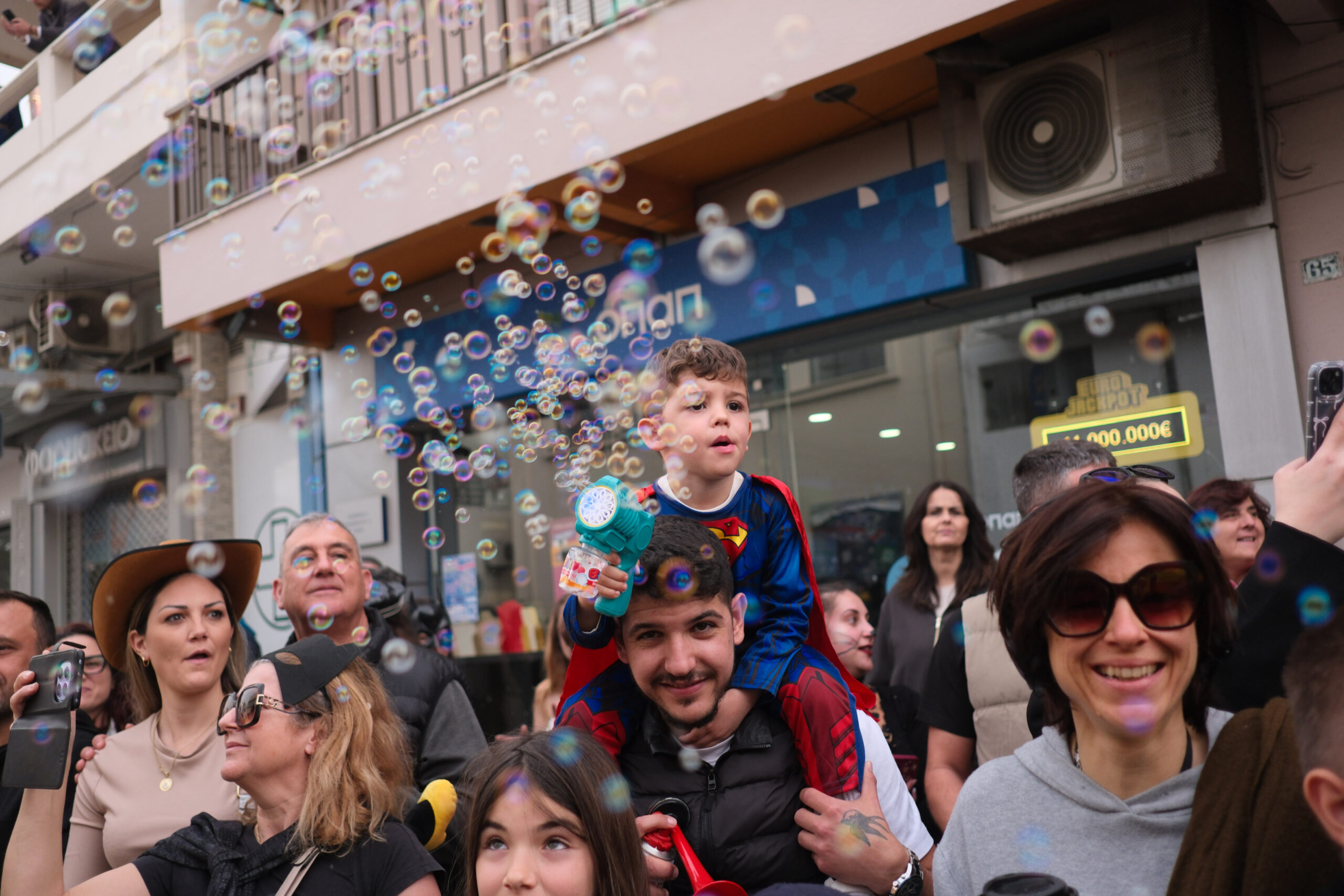 Το σκηνικό της παρέλασης συμπληρώθηκε από τα καθιερωμένα αποκριάτικα αξεσουάρ, με τις σερπαντίνες και τα κονφετί να δημιουργούν μια αίσθηση ατελείωτου πάρτι.