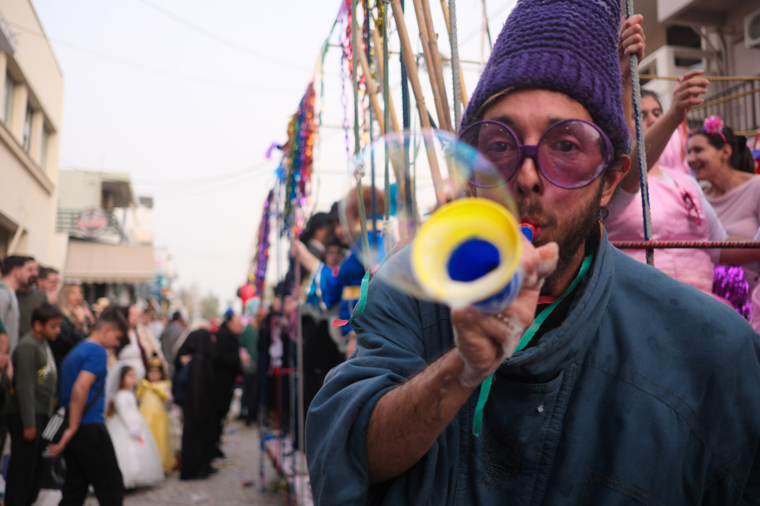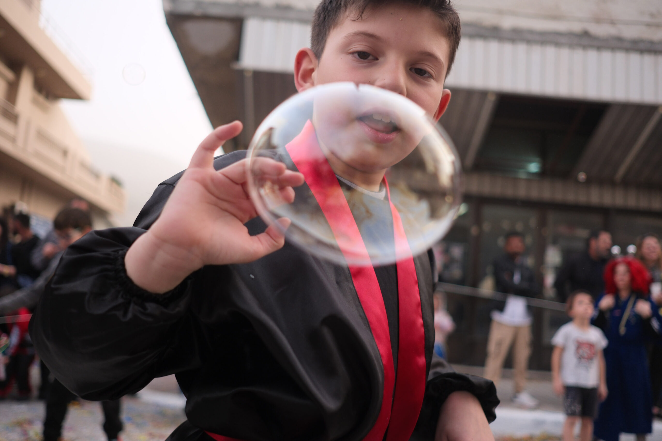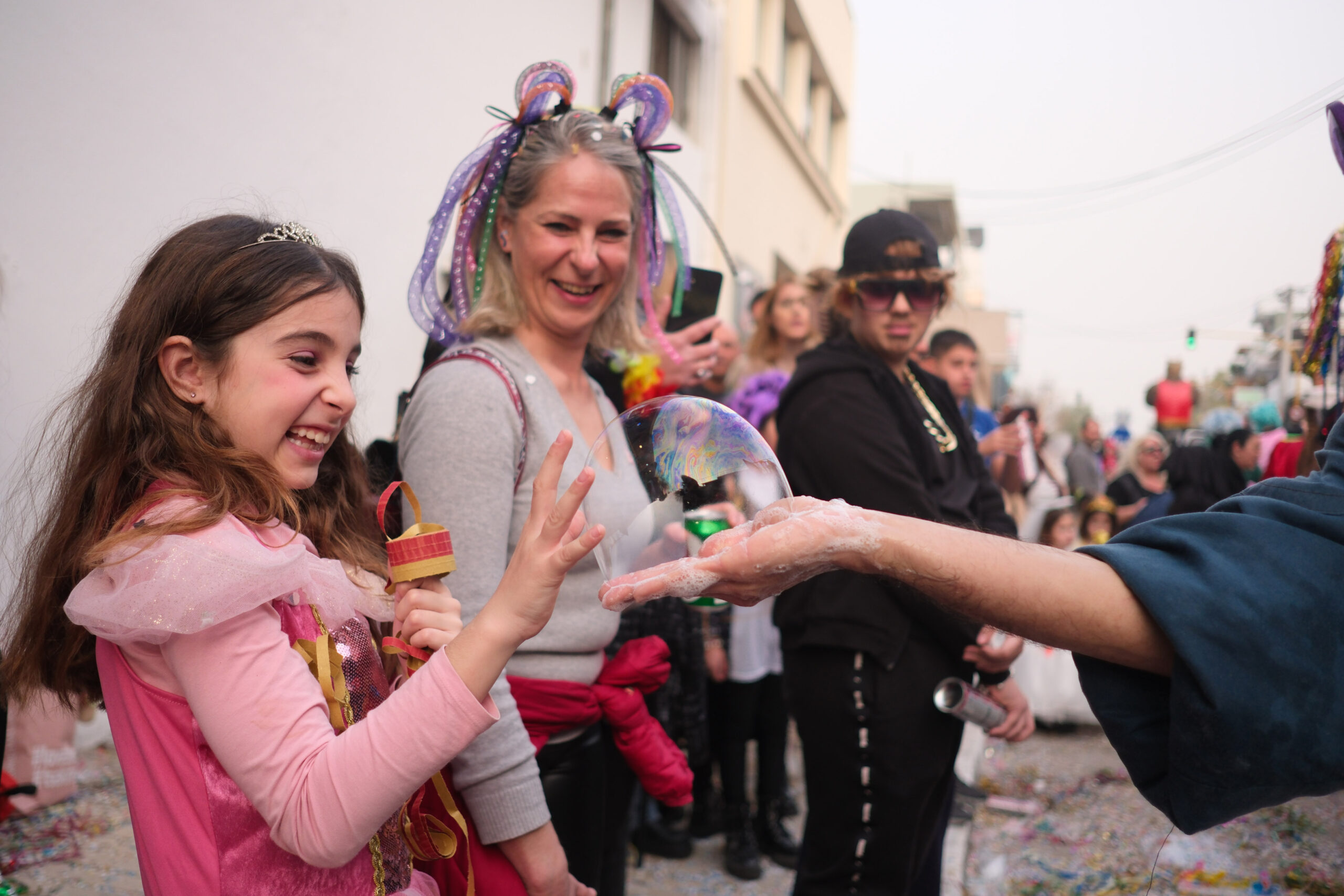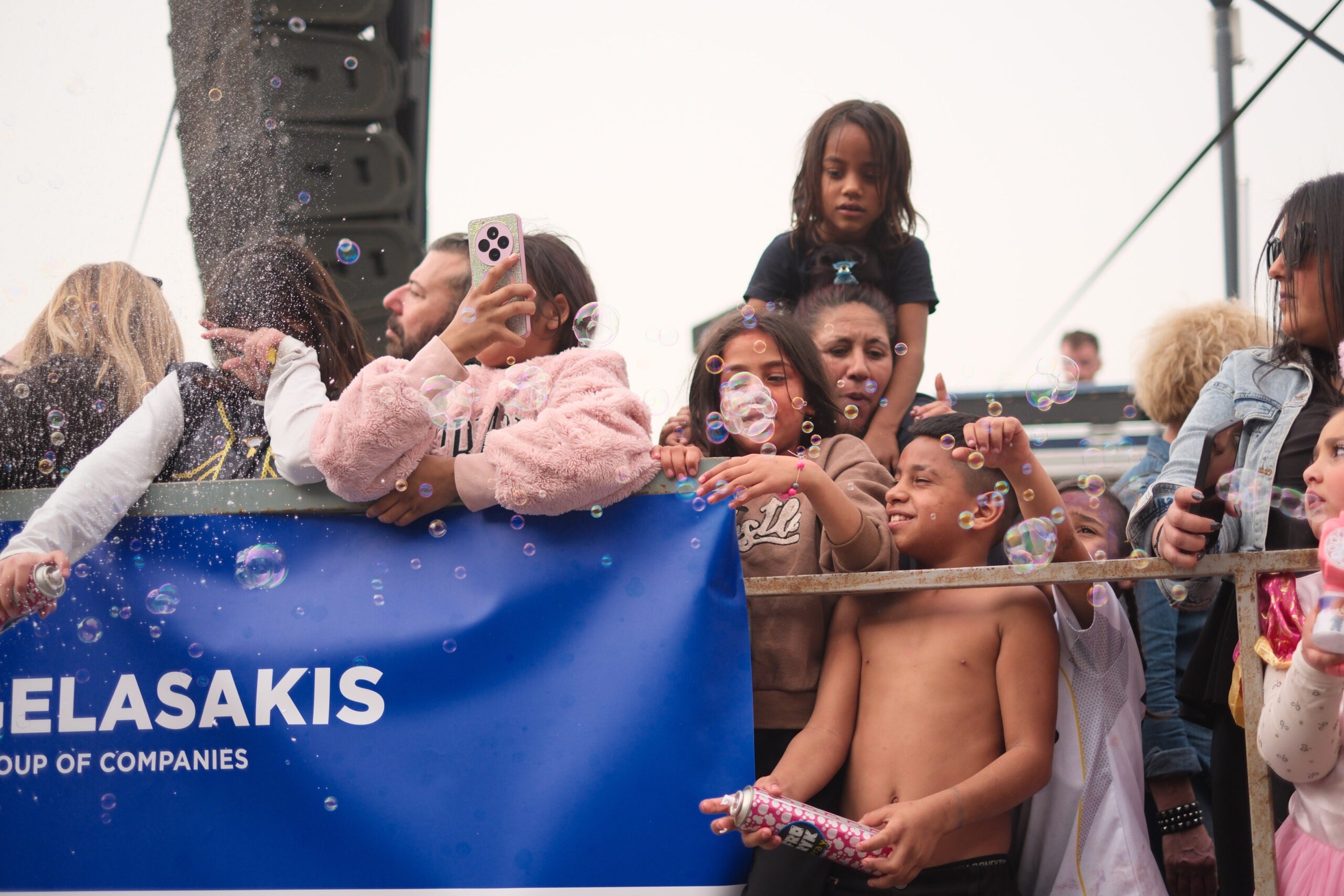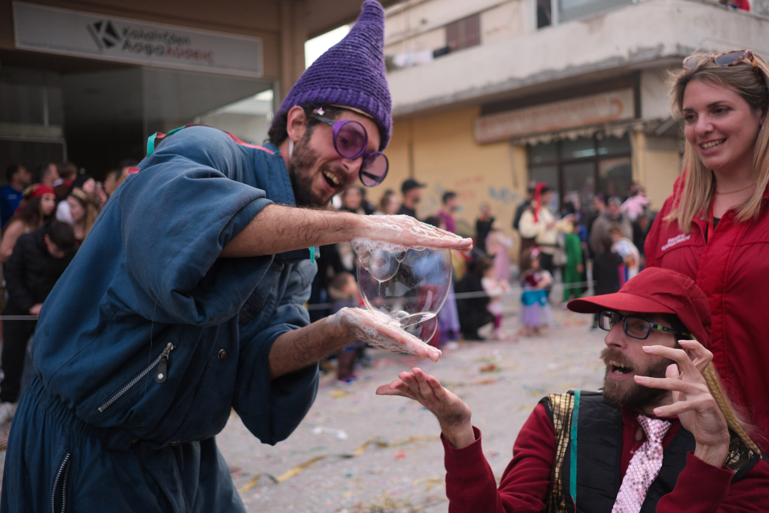 Το σκηνικό της παρέλασης συμπληρώθηκε από τα καθιερωμένα αποκριάτικα αξεσουάρ, με τις σερπαντίνες και τα κονφετί να δημιουργούν μια αίσθηση ατελείωτου πάρτι.