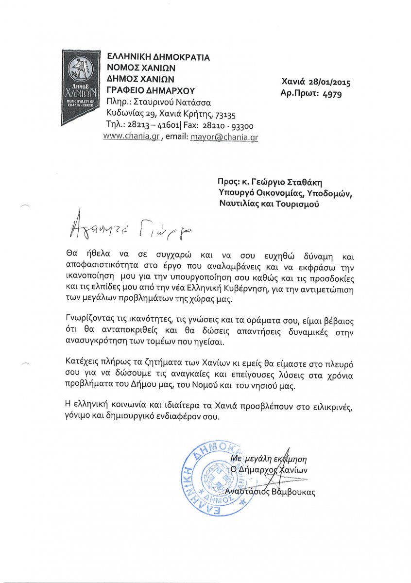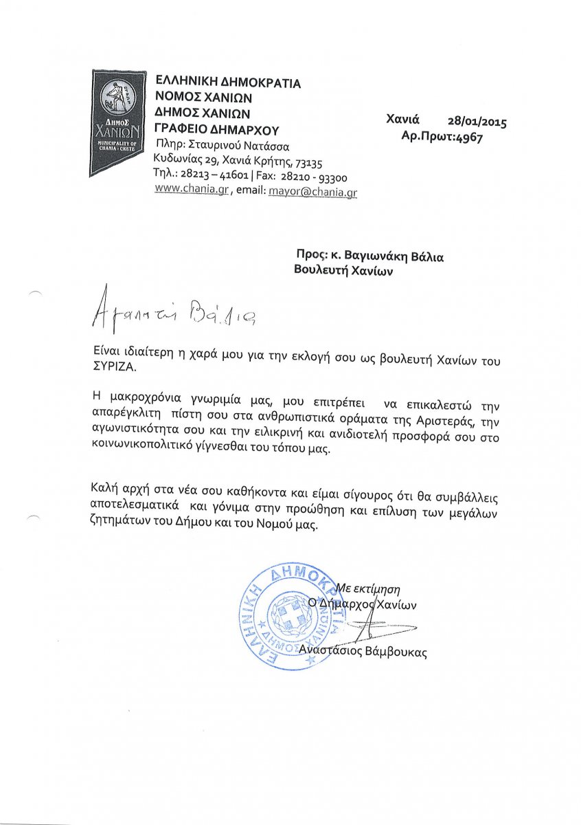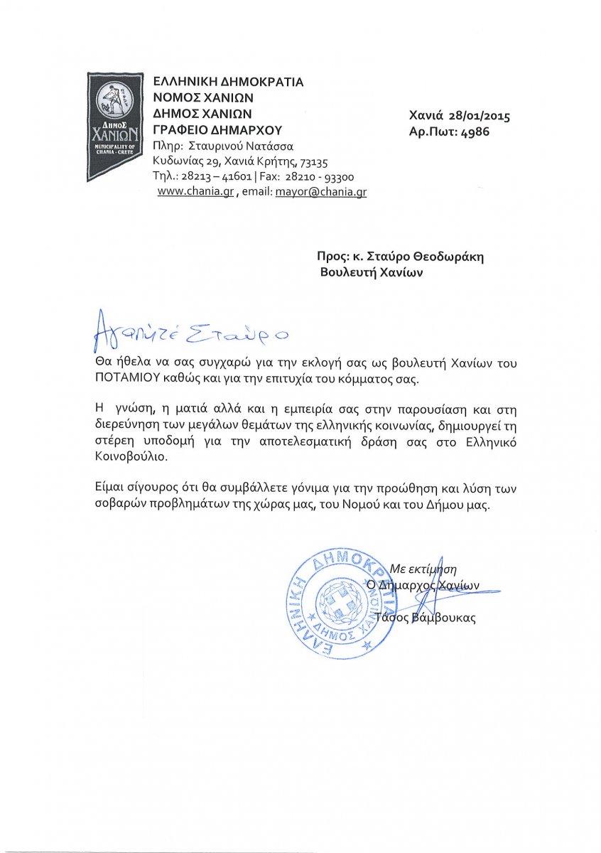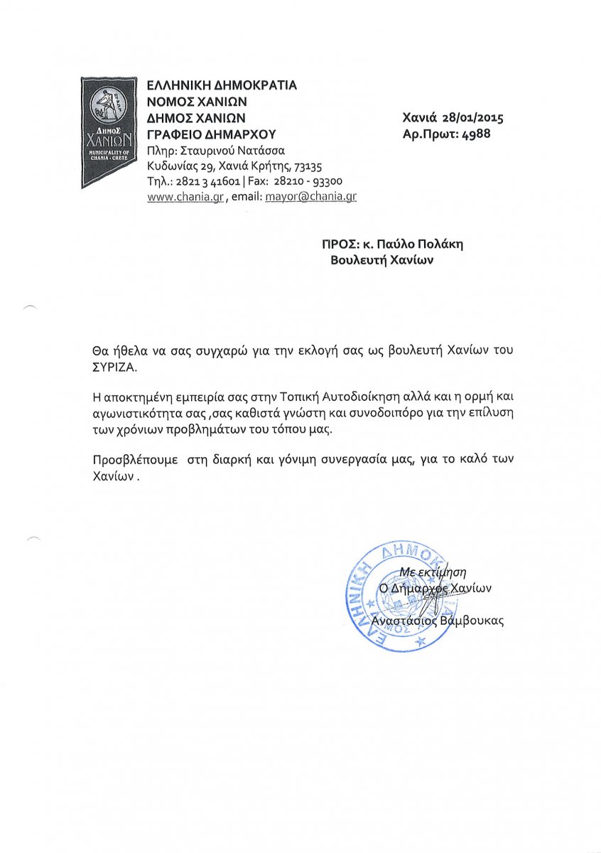 Συγχαρητήρια επιστολή προς τον Χανιώτη Υπουργό, Γεώργιο Σταθάκη, και τους νεοεκλεγέντες Βουλευτές, Παύλο Πολάκη, Βάλια Βαγιωνάκη και Σταύρο Θεοδωράκη, απέστειλε ο Δήμαρχος Χανίων, Τάσος Βάμβουκας.