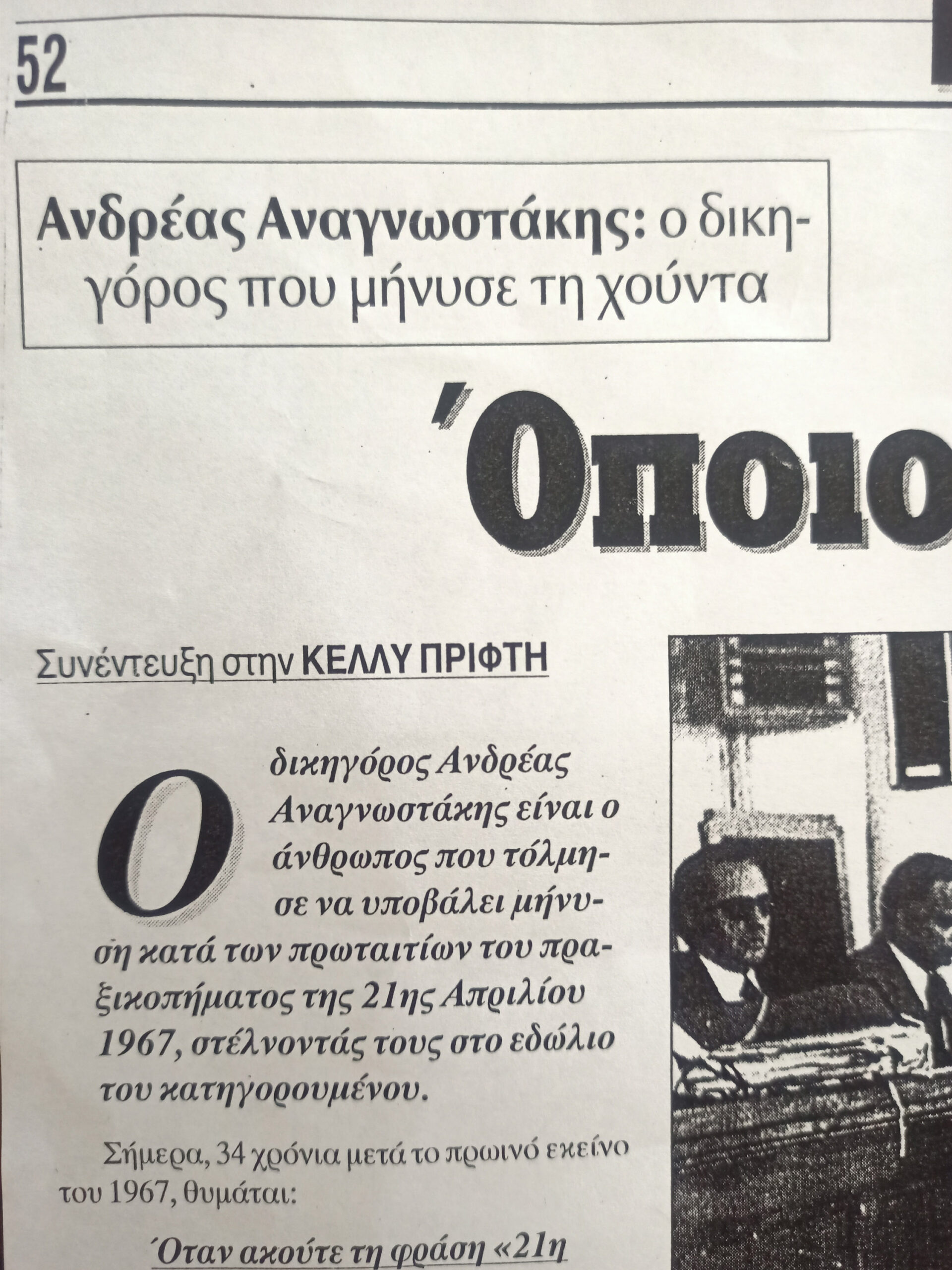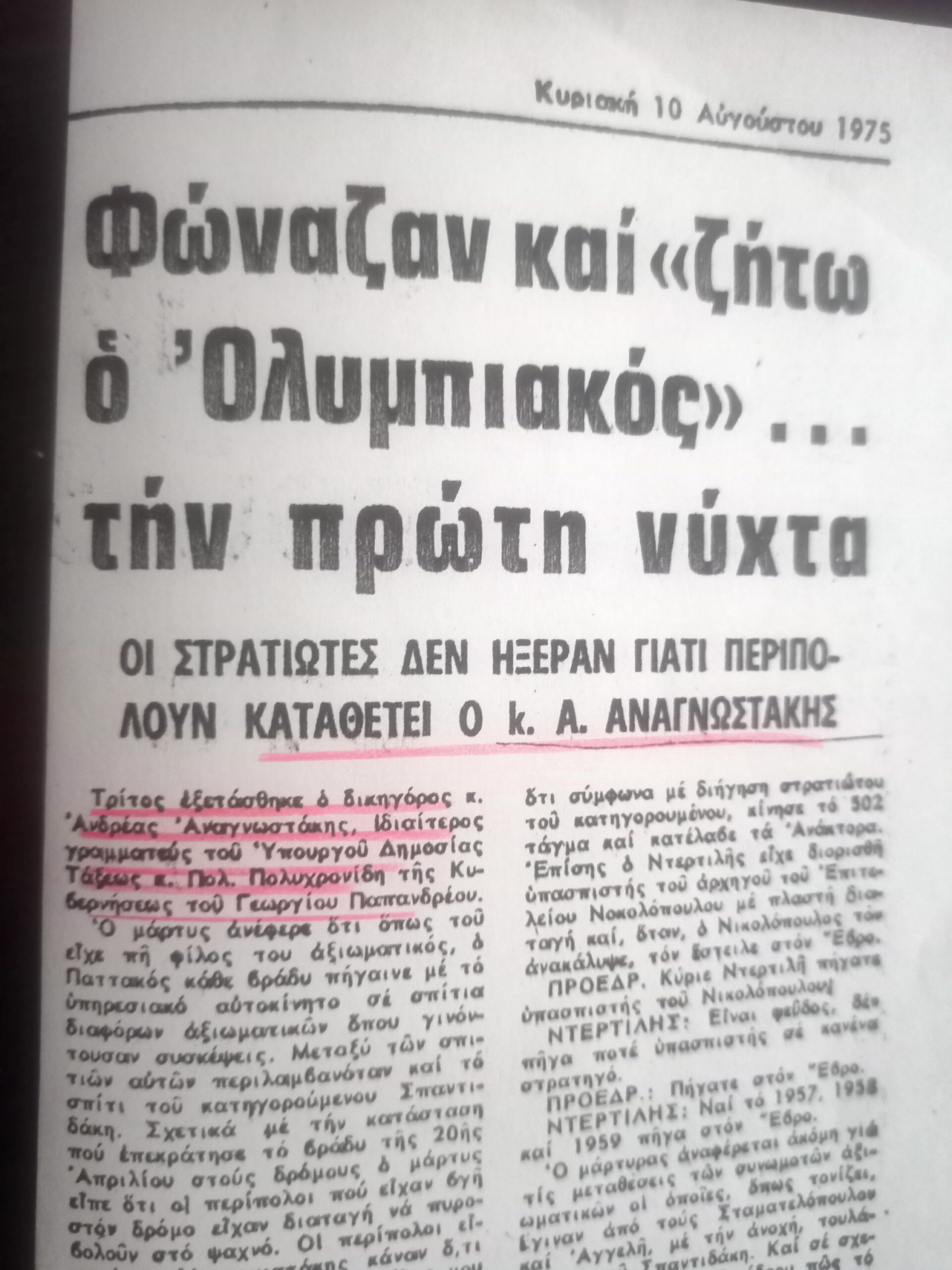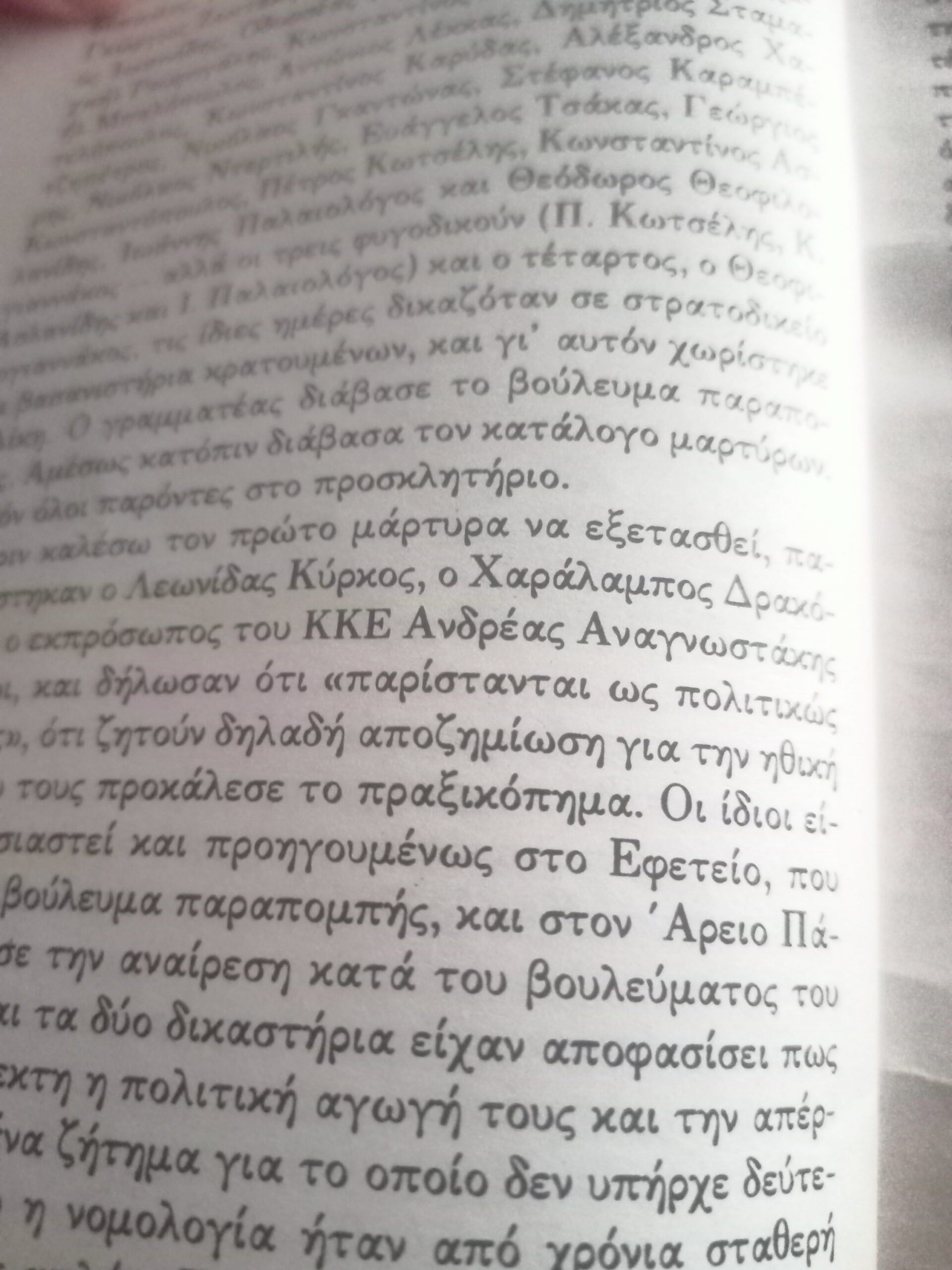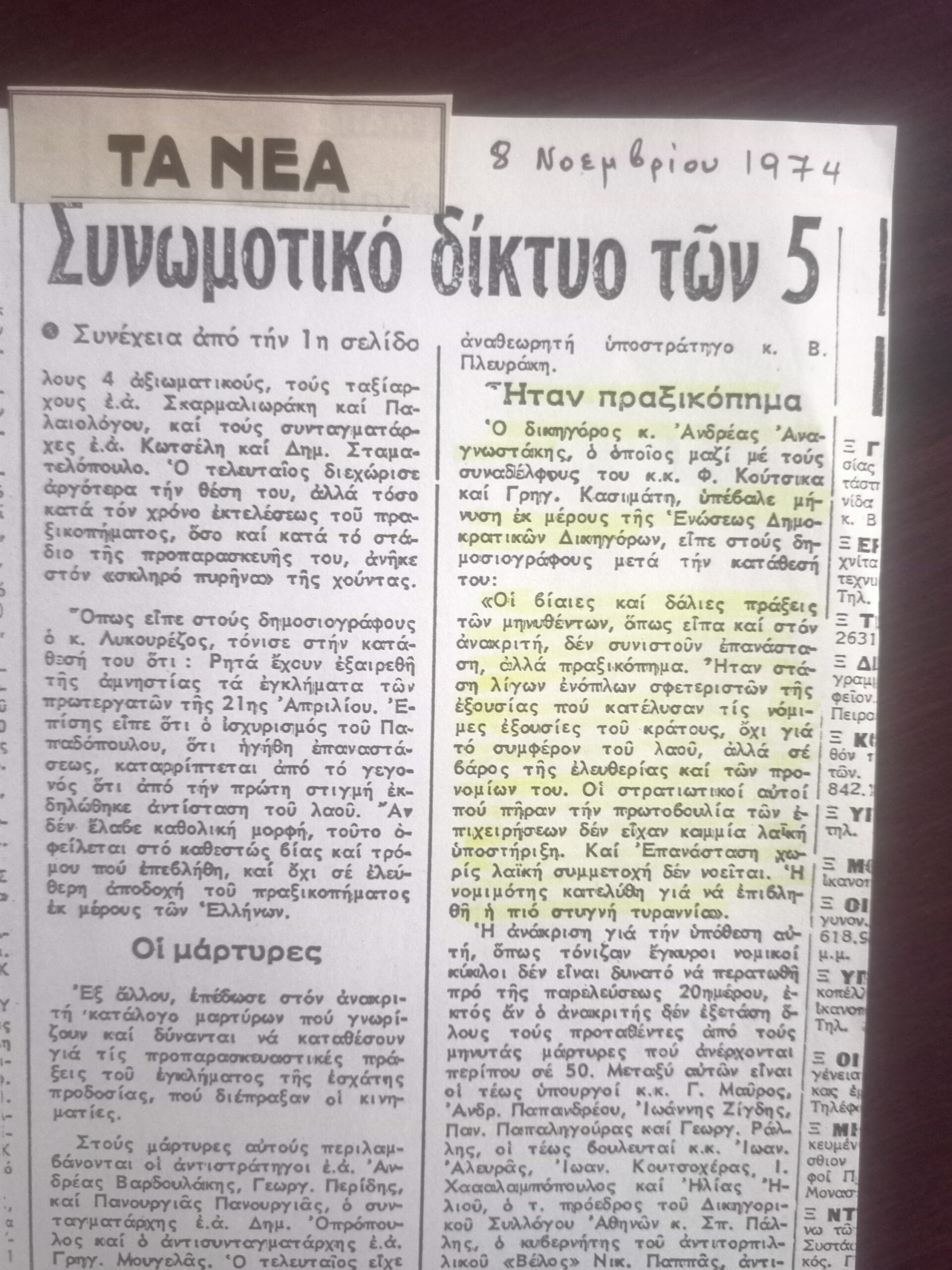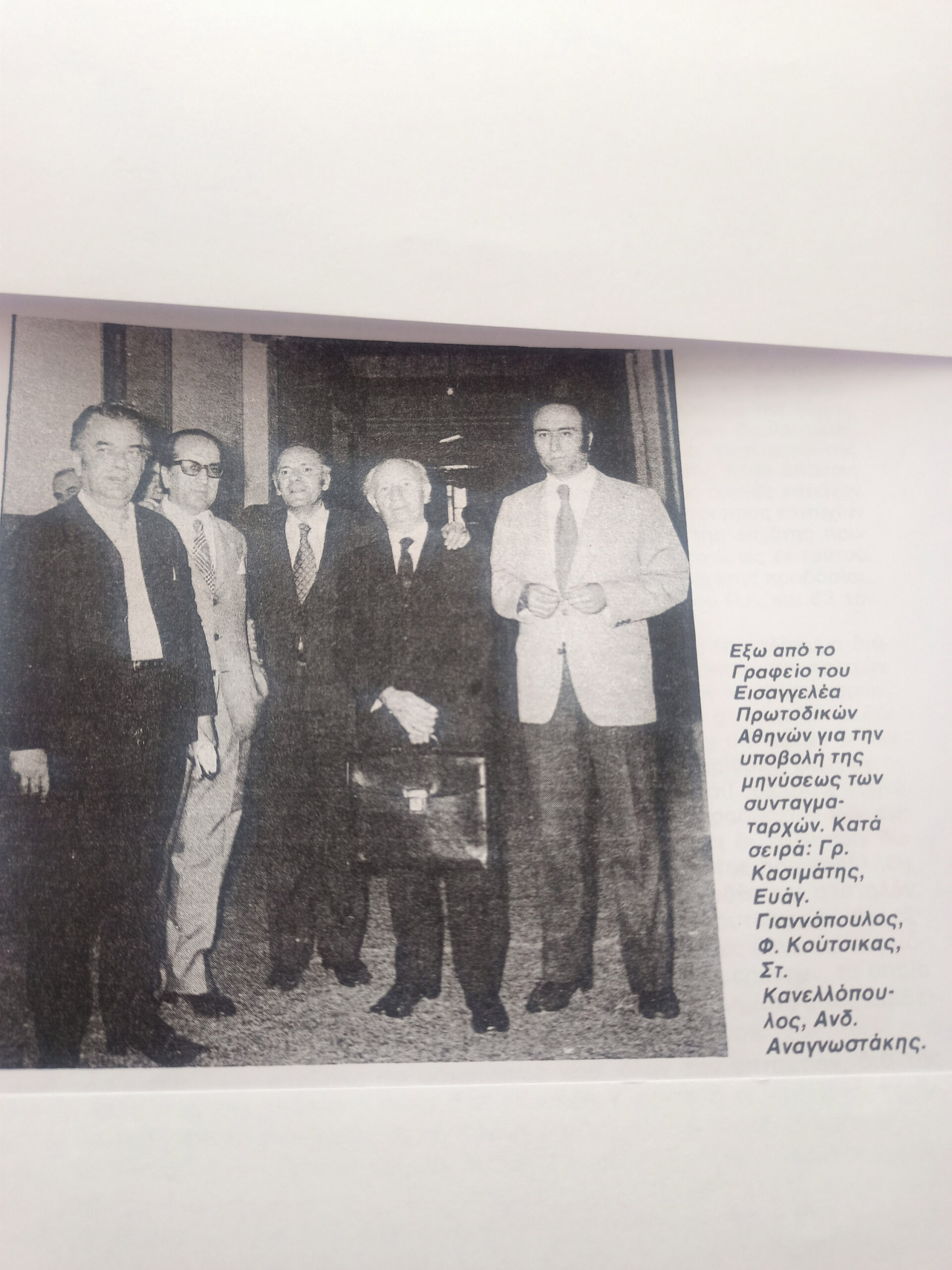 Κατά την έναρξη, της συζήτησης της υπόθεσης, στο Πενταμελές Εφετείο Αθηνών και πριν καλέσει ο Πρόεδρος τον πρώτο μάρτυρα, παρουσιαστήκαμε ο Λεωνίδας Κύρκος (ΚΚΕ Εσωτερικού) ο Χαράλαμπος Δρακόπουλος (ΚΚΕ) μετά Συνηγόρων και εγώ, (Ανδρέας Αναγνωστάκης) ως εκπρόσωπος της Ένωσης Δημοκρατικών Δικηγόρων Ελλάδος και δηλώσαμε, ότι παριστάμεθα ως πολιτικώς ενάγοντες εναντίον των κατηγορουμένων προσωπικά, για την ηθική και υλική βλάβη που μας προκάλεσαν τα εγκλήματα του πραξικοπήματος και τα εντεύθεν της Επταετίας, που διήρκεσε η Δικτατορία. -Αυτά περιέχονται στην σελίδα 42 του άνω Βιβλίου του Προέδρου, Γιάννη Ντεγιάννη-.