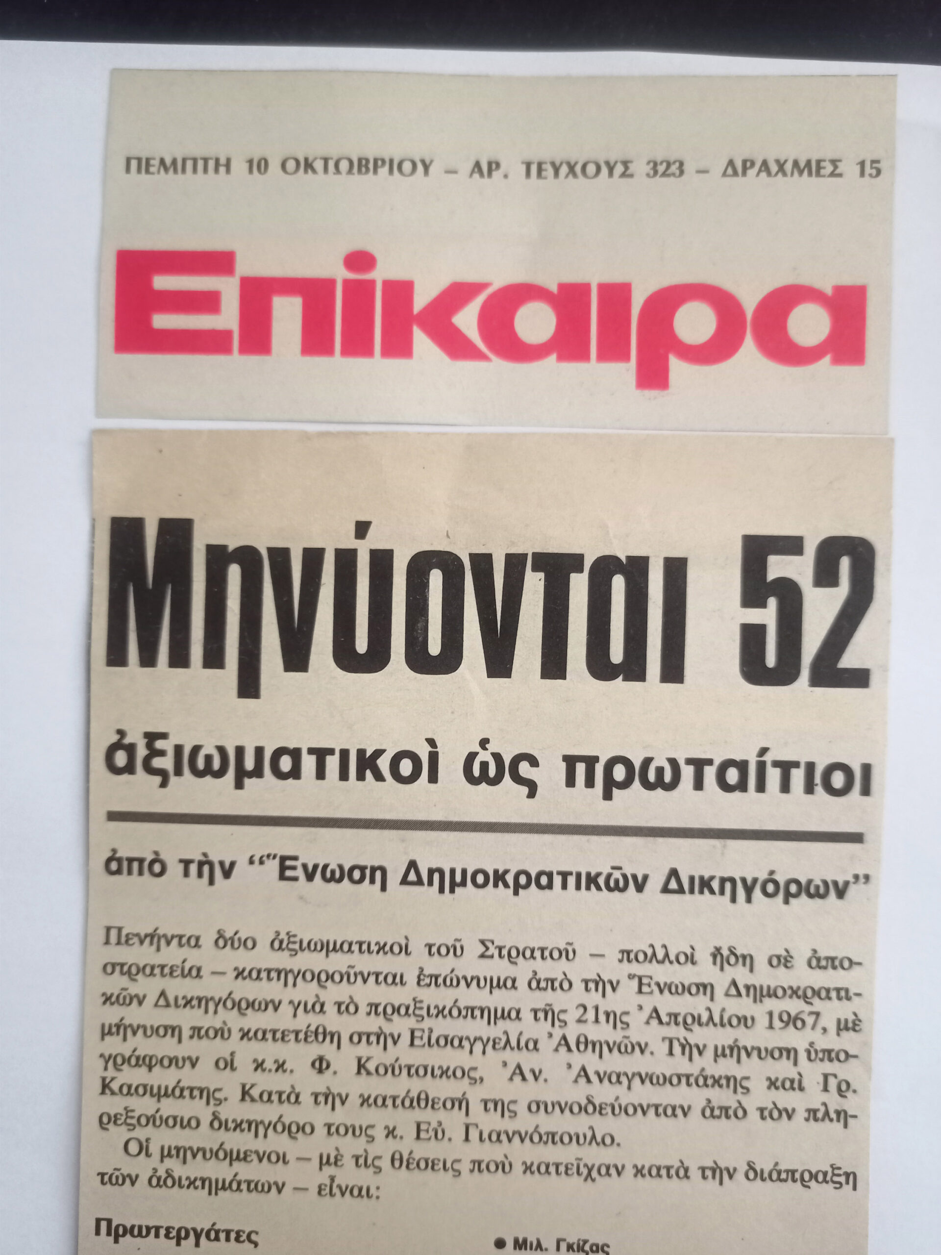 ΔΕΝ αναφέρεται γενικά το όνομα κανενός, από αυτούς, που έως σήμερα διαδίδουν πως η μήνυσή τους και οι παραστάσεις τους ήταν, η αφετηρία για να οδηγηθούν οι πρωταίτιοι της χούντας στο δικαστήριο και να καταδικαστούν τον Αύγουστο του 1975. (ΤΟ ΒΗΜΑ 9-9-2025.)