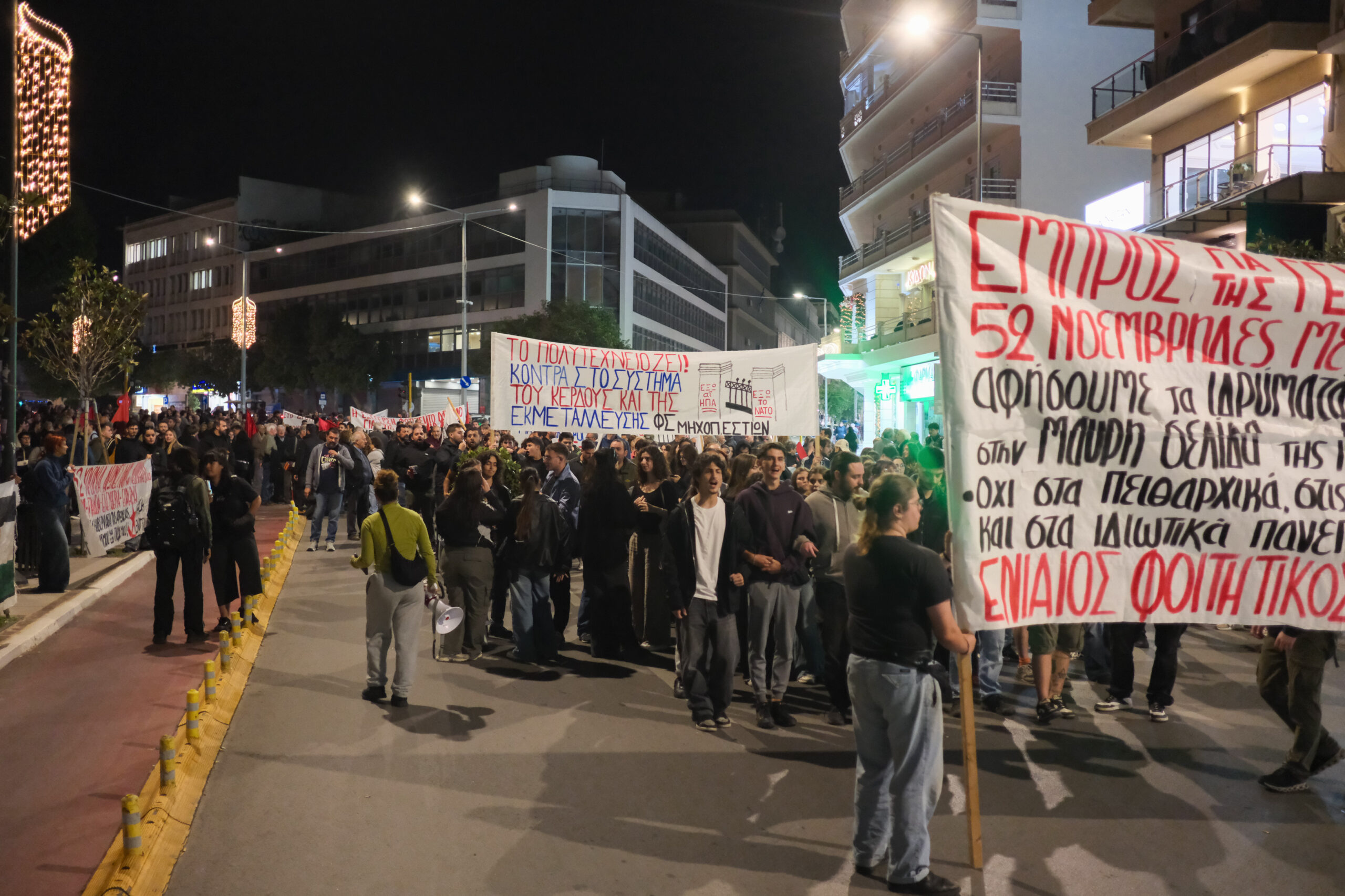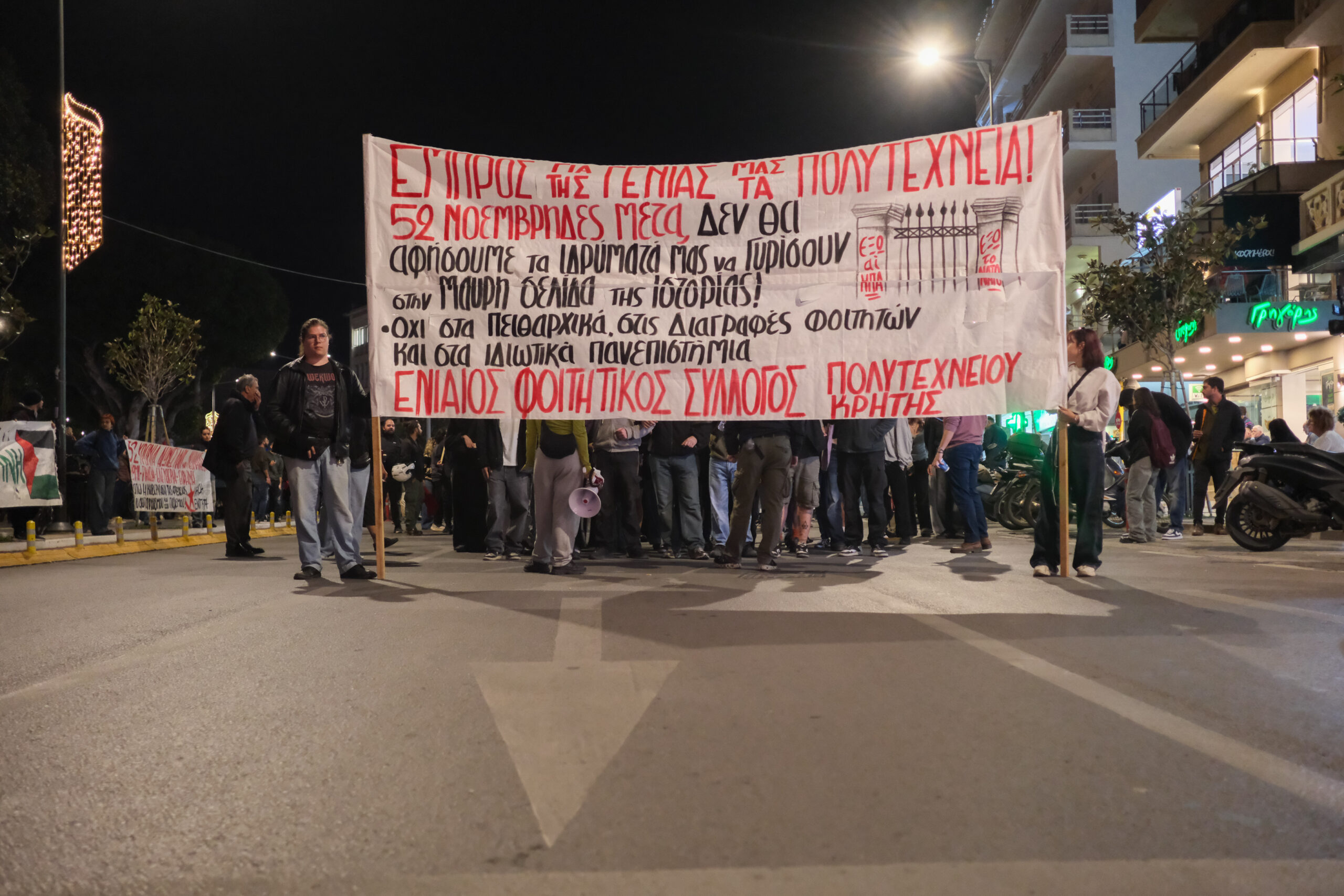 Κατά τη διάρκεια της πορείας στα Χανιά για την 52η επέτειο του Πολυτεχνείου, τον λόγο έλαβαν εκπρόσωποι των φοιτητικών συλλόγων του Πολυτεχνείου Κρήτης, μεταφέροντας το πολιτικό στίγμα και τις ανησυχίες της νεολαίας για τις εξελίξεις στα πανεπιστήμια και την κοινωνία συνολικά.