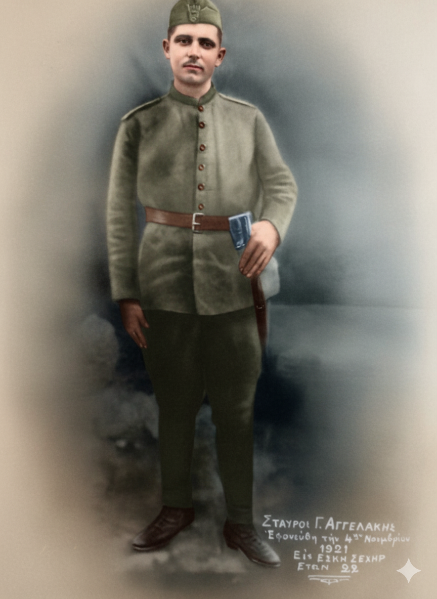 Το ‘ξεραν! Και πόζαραν όχι για τη ζωή και τη χαρά αλλά για τον θάνατο. Τι θλιβερό!. Είναι στιγμές που μισώ τις φωτογραφίες. Γιατί εκεί καταλήγουν οι χαρές μα και οι λύπες. Δύο παιδιά, δύο άντρες εδώ, δύο ιστορίες αληθινές. 22 χρονών κι εγώ, νύφη, όταν πρωτοπήγα στο χωριό μαζεύτηκαν γύρω μου όπως συνηθίζεται όλο το σόι. Γριές, γέροι, παιδιά. Και ένοιωθα φοβερά άβολα, ένοιωθα την ανάγκη να δραπετεύσω μέχρι που η παπαδιά, θεία του άντρα μου, άρχισε να αφηγείται την ιστορία του Αγγελάκη Σταύρου. Την άκουγα συγκλονισμένη. Την επιβεβαίωναν και οι άλλες γερόντισσες. Ότι την έζησαν την ιστορία. Ότι ήταν αλήθεια. Όταν λέει το παιδί έφυγε στον πόλεμο έστειλε ένα γράμμα. Η μάννα του περίμενε μ’ αγωνία το δεύτερο γράμμα αλλά αργούσε.