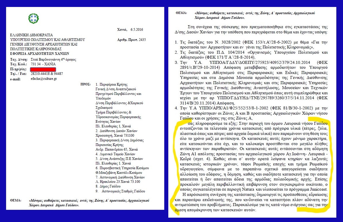 Η επιχειρηματολογία του Δήμου Γαύδου εδράζεται σε στοιχεία της Εφορείας Αρχαιοτήτων Χανίων, τα οποία χρονολογούνται ήδη από το 2016. Σύμφωνα με τα έγγραφα που έχουν διαβιβαστεί και στις εισαγγελικές αρχές, στην παράκτια ζώνη Αη Γιάννη – Λαυρακά έχουν εντοπιστεί μόνιμες αυθαίρετες κατασκευές εντός της Ζώνης Α, η οποία τελεί υπό καθεστώς απόλυτης προστασίας. Η συγκεκριμένη περιοχή χαρακτηρίζεται από την παρουσία λειψάνων αρχαίων κτηρίων, λαξευτών κατασκευών, τάφων της ρωμαϊκής εποχής, καθώς και τμήματος ρωμαϊκού υδραγωγείου.