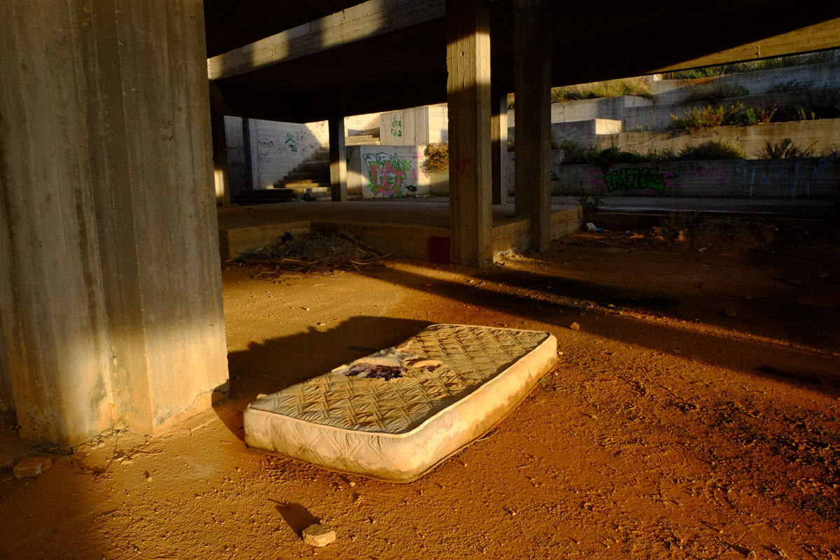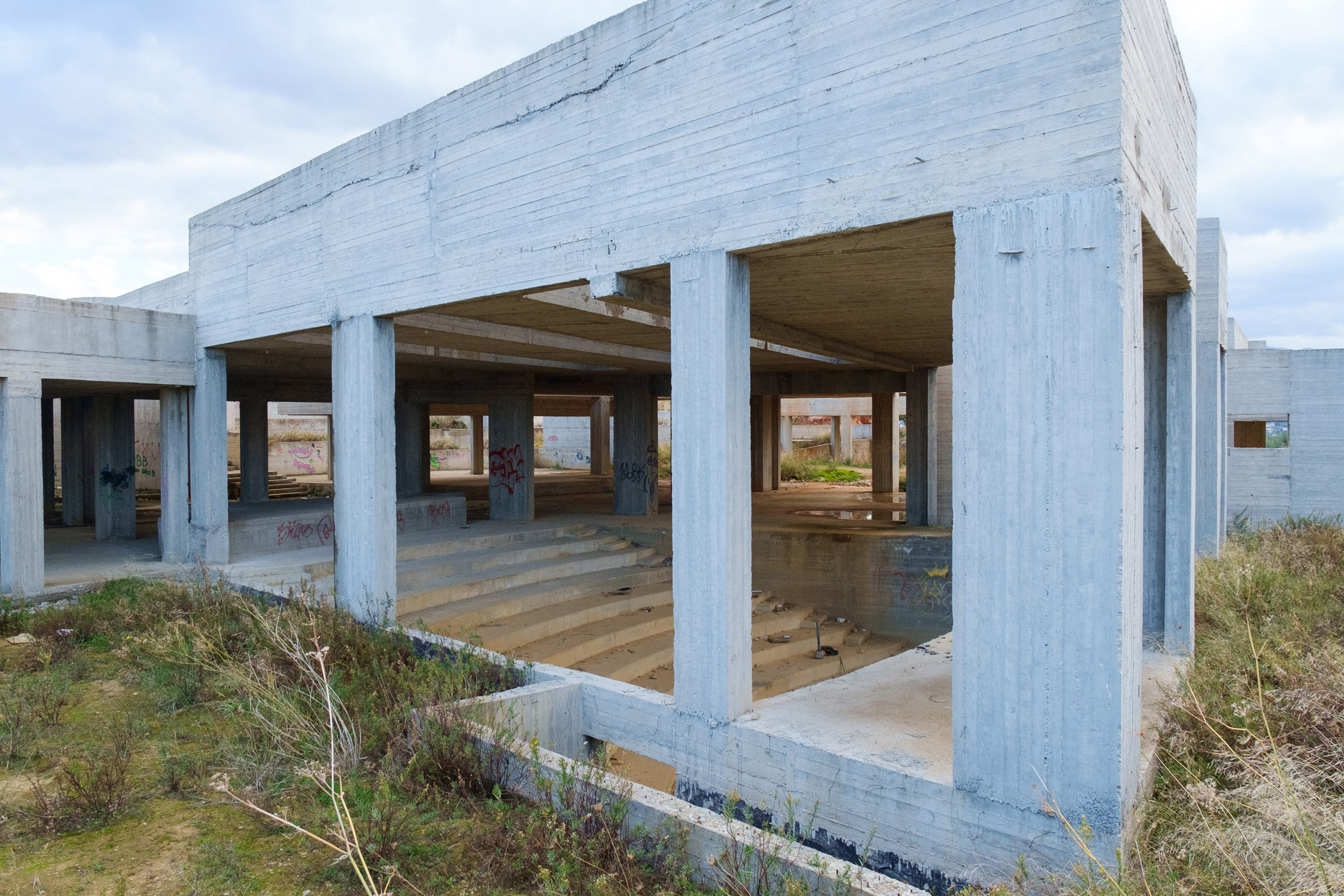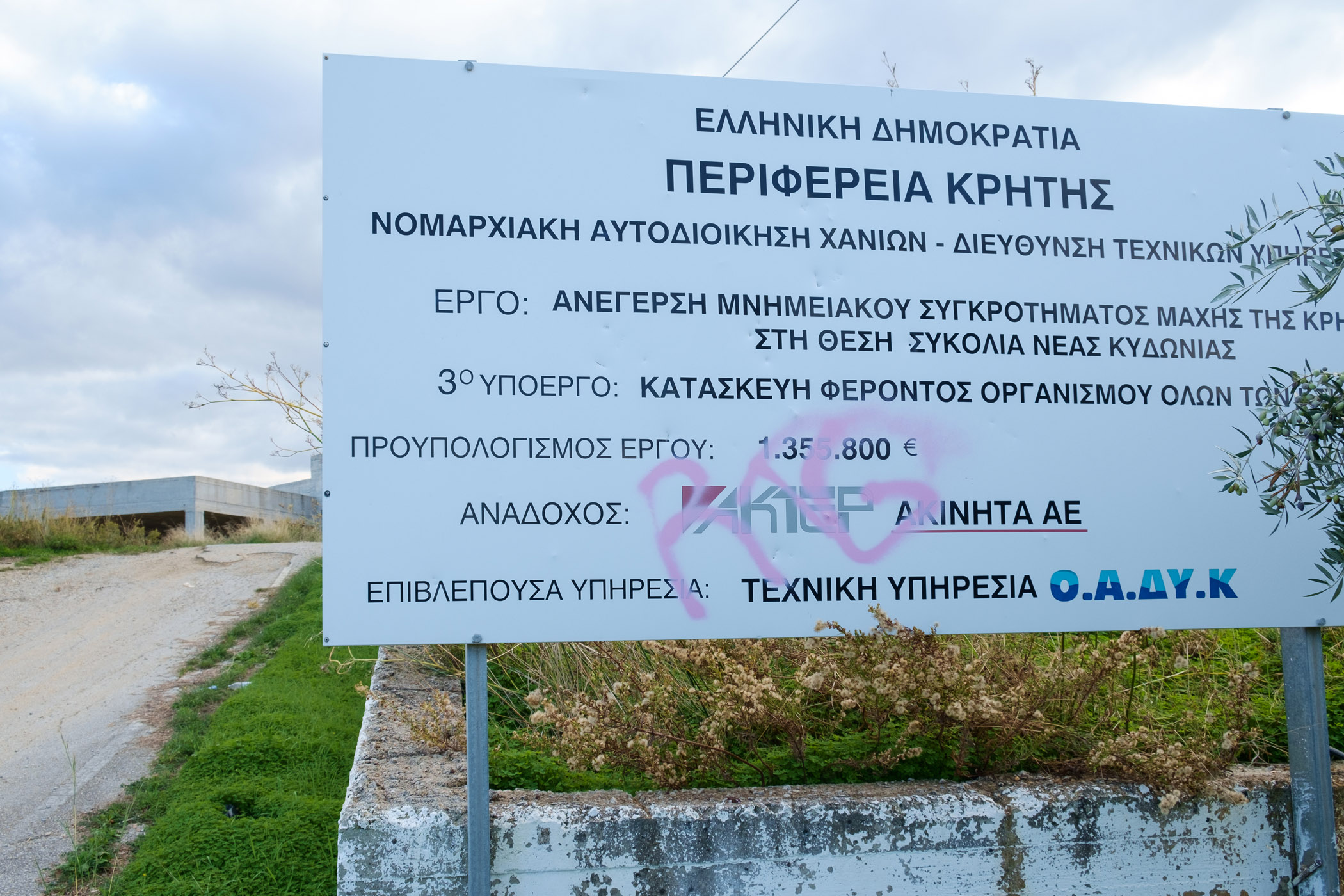 Στο σημείο που θα έπρεπε να υπάρχει το μνημείο δεν υπάρχει παρά μια μουτζουρωμένη πινακίδα καλυμμένη από ψηλά χόρτα που ενημερώνει πως στο σημείο θα κατασκευαστεί το συγκρότημα με προϋπολογισμό 1.355.000 ευρώ. Γύρω – γύρω σκουπίδια, ένας ταιριαστός στολισμός για τον σκελετό ενός κτιρίου, τον τσιμεντένιο γκρι όγκο που το μόνο ιδιαίτερο χαρακτηριστικό είναι το μέγεθός του και το γεγονός ότι βρίσκεται δίπλα σε ένα νεκροταφείο.