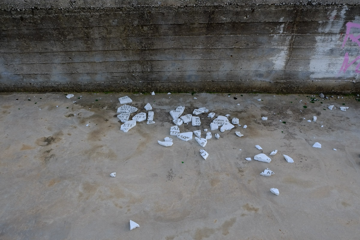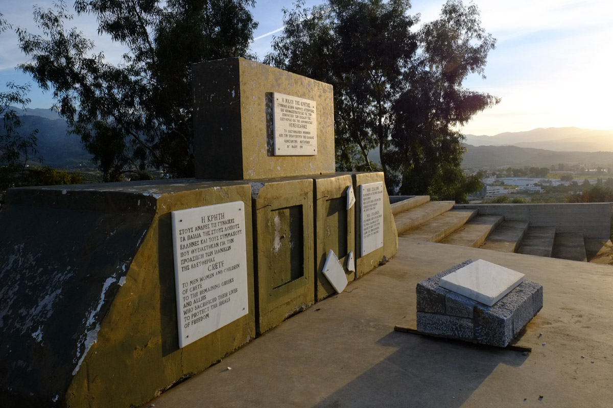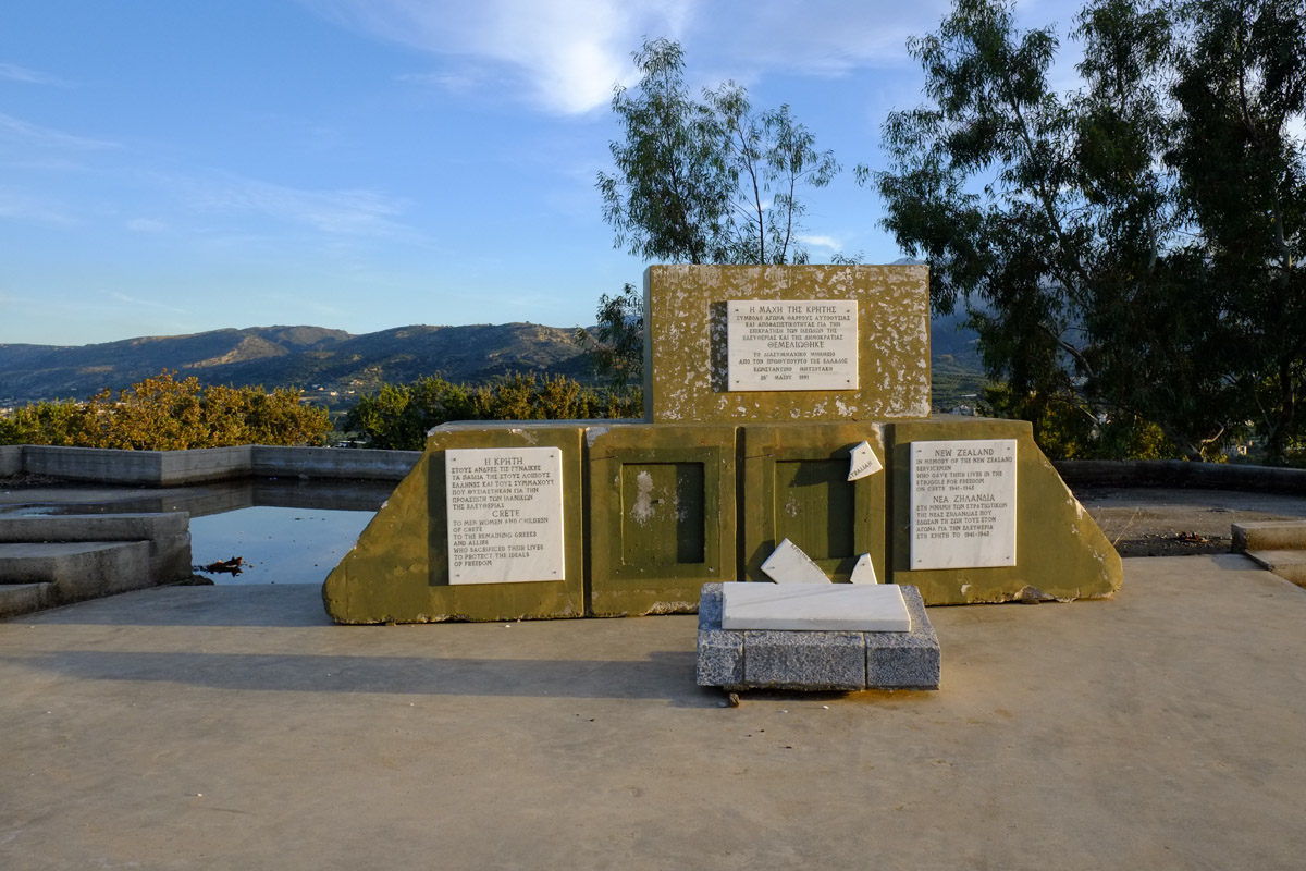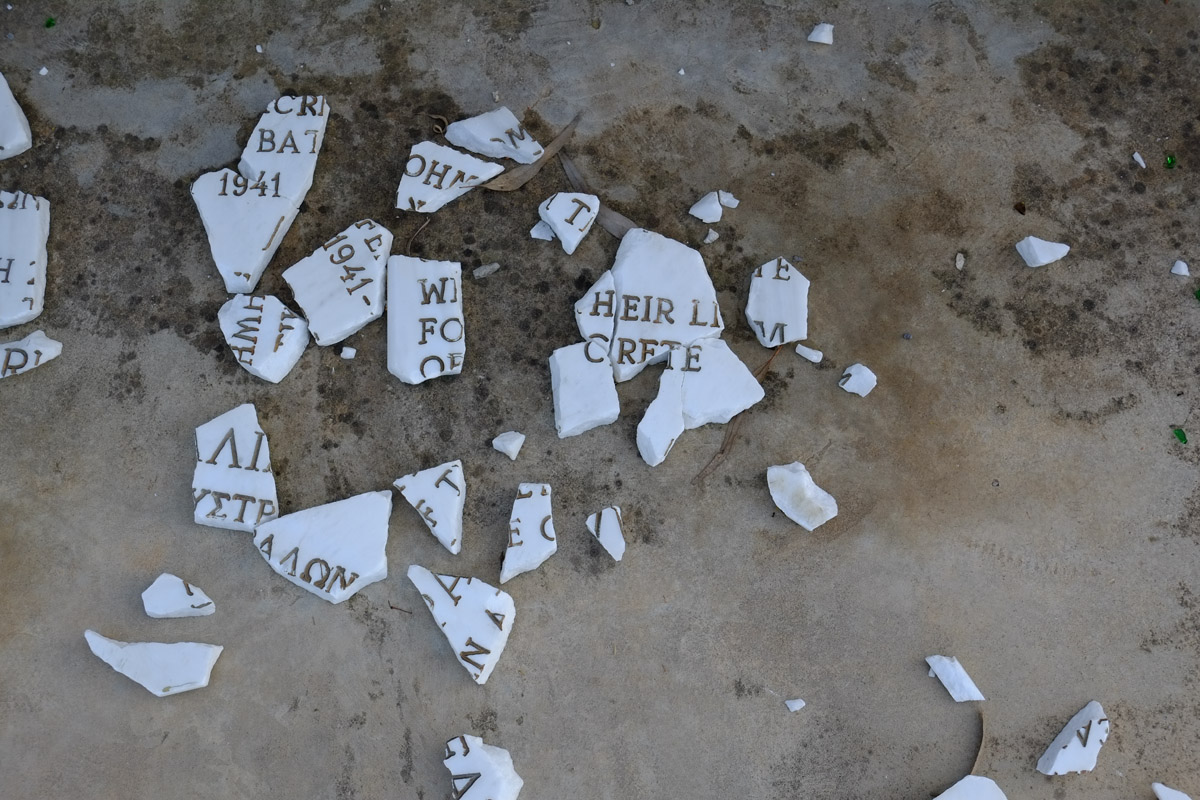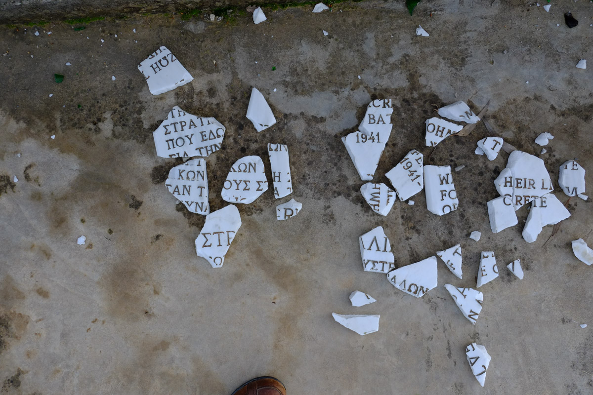 “Γι’ αυτούς που έδωσαν τις ζωές τους στη Μάχη της Κρήτης” γράφει η σπασμένη πλάκα που βρίσκεται στο έδαφος στο χώρο του μνημείου