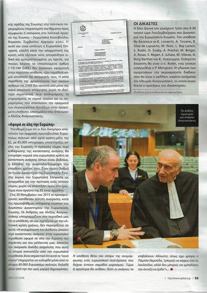 Την 13/12/2016, η παραπάνω υπόθεση εκδικάστηκε στο Δικαστήριο της Ευρωπαϊκής Ένωσης. Παρεπέμφθηκε, με Απόφαση του Προέδρου του Δικαστηρίου, στην Ευρεία Σύνθεση, ένεκα της ύψιστης σημασίας. Ο Γενικός Εισαγγελέας P. Mengozzi θα υποβάλλει στο Δικαστήριο, γραπτά τις Προτάσεις του επί της υπόθεσης, στις 7/3/2017. Τις θέσεις του, θα κληθούμε ν’ αποκρούσουμε, εφ’ όσον δεν ευνοούν, τα αιτήματά μας. Στη συνέχεια, το Δικαστήριο, θα προχωρήσει σε διασκέψεις, προς έκδοση απόφασης. Η απόφαση, είναι “ευρωκεντρική”. Αναμένεται με μεγάλο ενδιαφέρον από όλο τον Ευρωπαϊκό κόσμο.