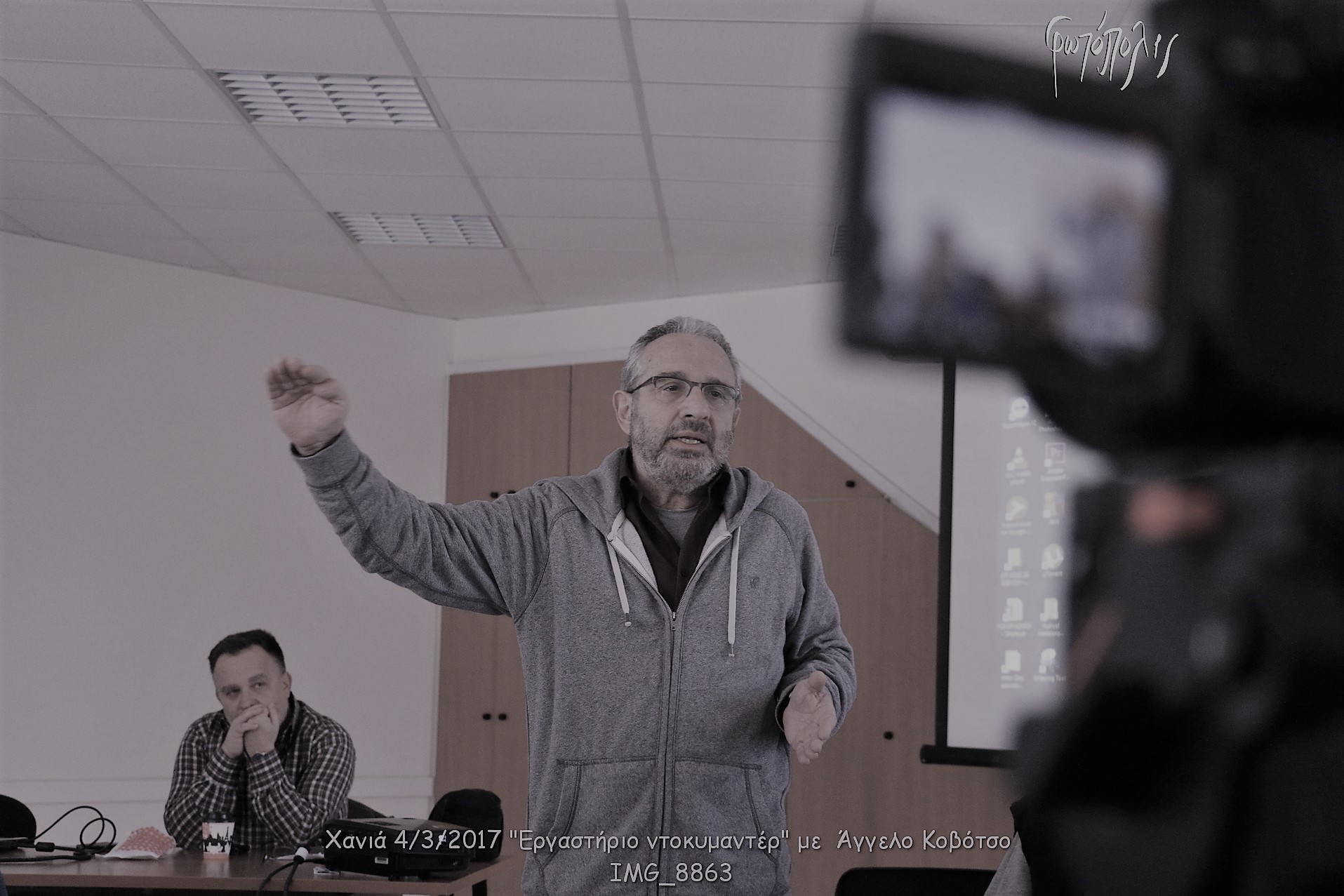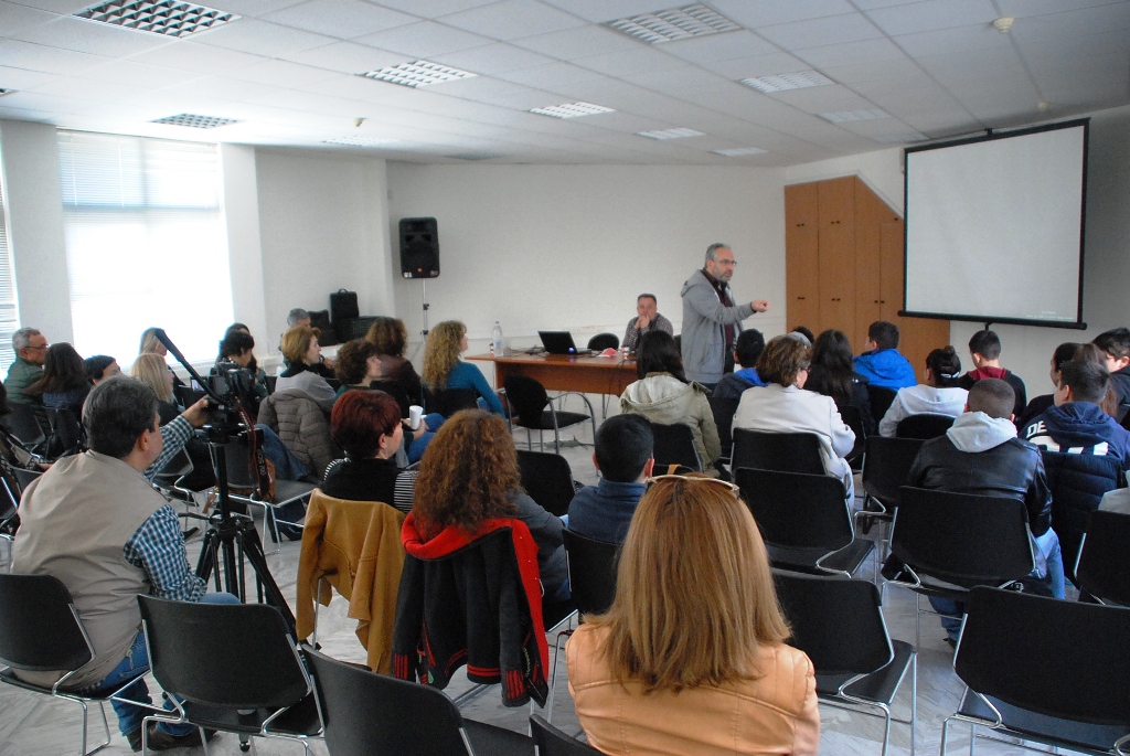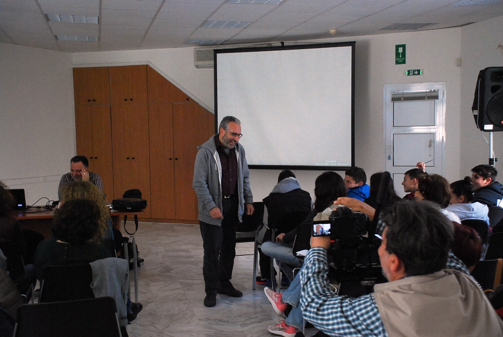 Στο πρώτο μέρος της συνάντησης ο κ. Κοβότσος ανέλυσε την διαδικασία παραγωγής ταινιών στα πλαίσια μιας εκπαιδευτικής δράσης επικεντρώνοντας στο ντοκιμαντέρ.