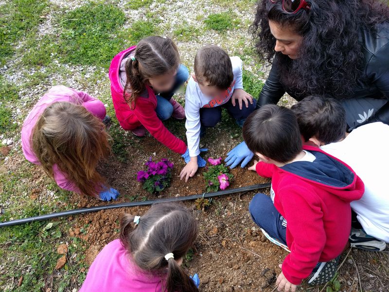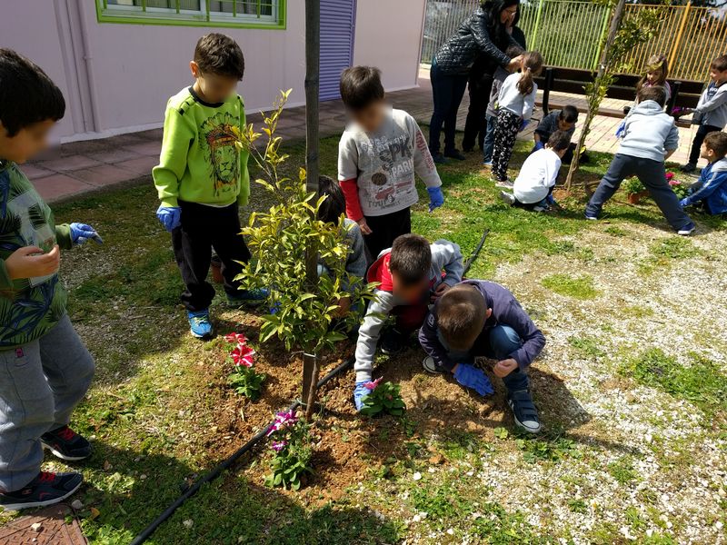 Επίσης, την ίδια μέρα, με τη συνδρομή γεωπόνου της Υπηρεσίας Πρασίνου πραγματοποιήθηκε φύτευση καλλωπιστικών φυτών στην αυλή του 1ου Νηπιαγωγείου Αρωνίου από τους μικρούς μαθητές και τις δασκάλες τους.