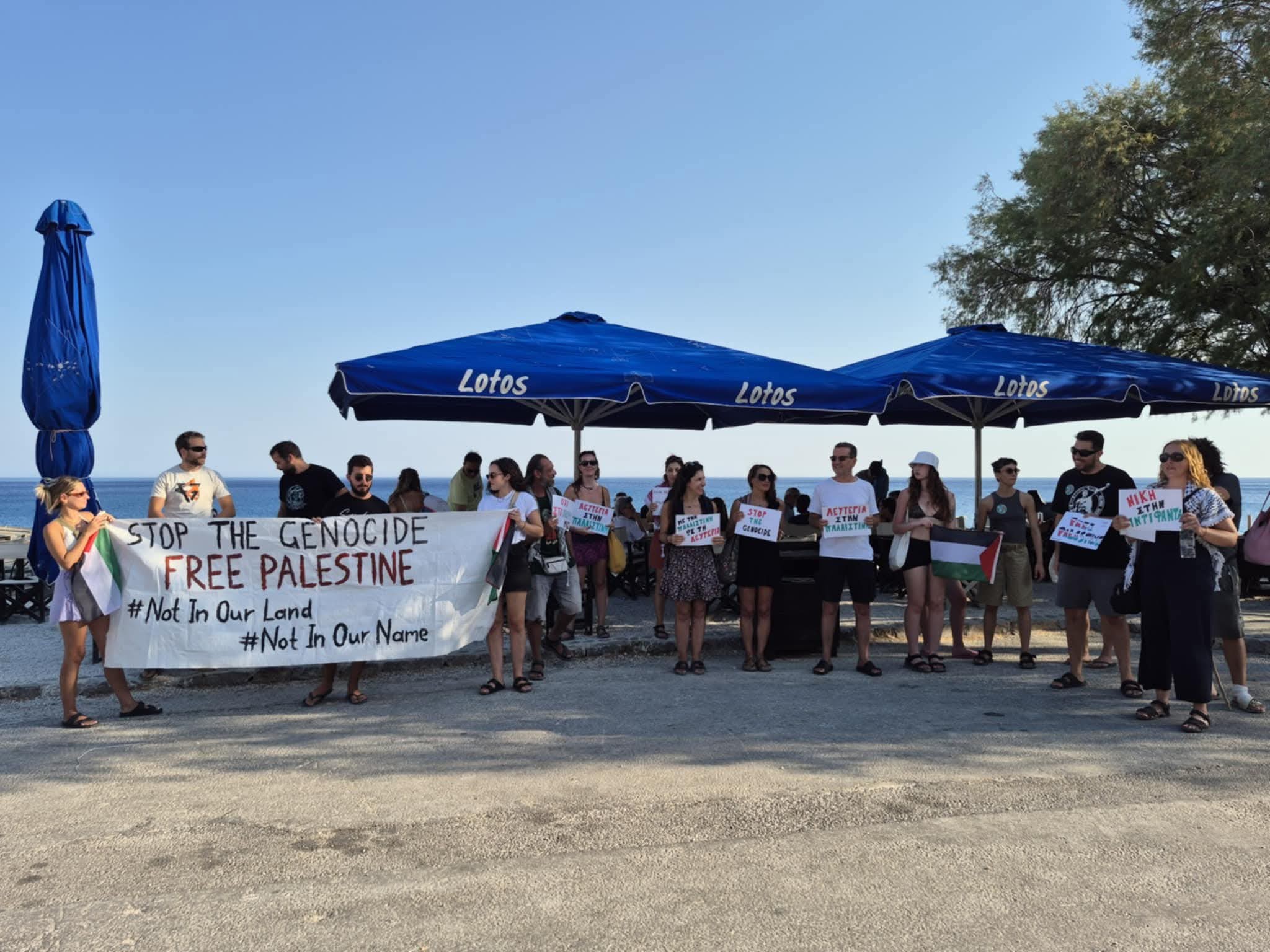 Στο πλαίσιο της πανελλαδικής κινητοποίησης «Ημέρα Δράσης για την Παλαιστίνη», παραθεριστές και κάτοικοι εγκατέλειψαν την παραλία, κρατώντας πανό και πλακάτ με μηνύματα αλληλεγγύης προς τον παλαιστινιακό λαό.