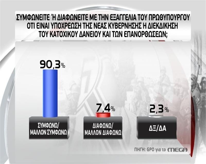 Από την ίδια δημοσκόπηση προκύπτει ότι 9 στους 10 πολίτες διατυπώνουν συμφωνία με την εξαγγελία του πρωθυπουργού ότι είναι υποχρέωση της νέας κυβέρνησης η διεκδίκηση του κατοχικού δανείου και των επανορθώσεων.