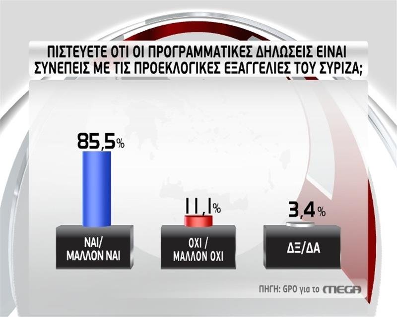 Παράλληλα, το 85% των πολιτών θεωρούν ότι οι προγραμματικές αυτές δηλώσεις είναι συνεπείς με τις προεκλογικές εξαγγελίες του ΣΥΡΙΖΑ.