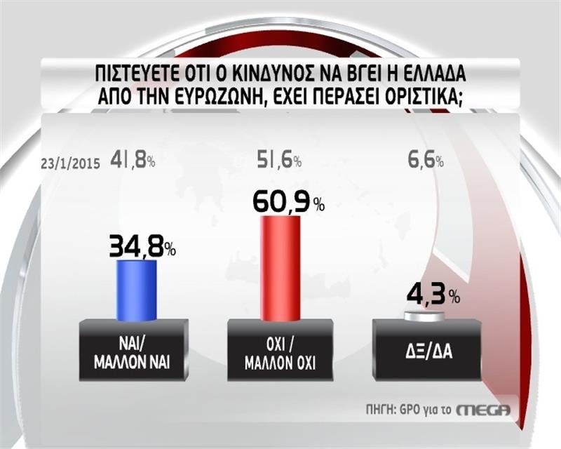 Πάντως, το 60,9% πιστεύει ότι ο κίνδυνος να βγει η Ελλάδα από την Ευρωζώνη δεν έχει περάσει οριστικά, με το ποσοστό αυτό να είναι αυξημένο κατά 9,3% σε σχέση με την προηγούμενη μέτρηση στις 23 Ιανουαρίου.