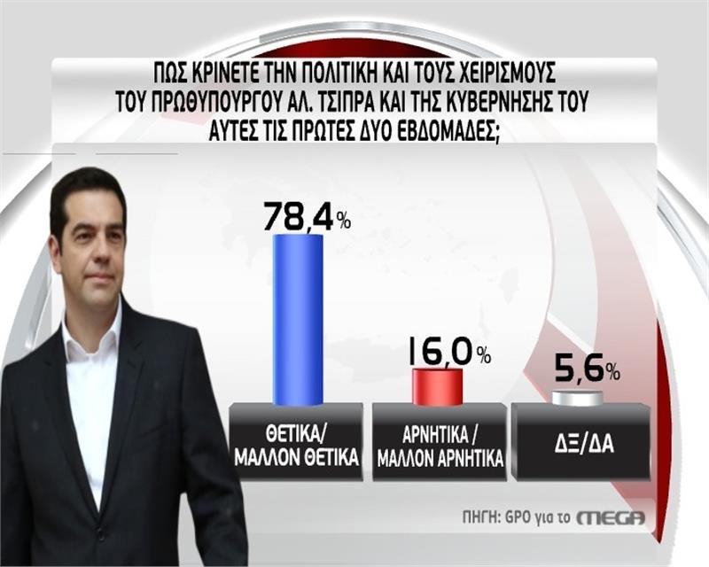 Το 78,4% των πολιτών διατυπώνουν θετικές κρίσεις για την πολιτική και τους χειρισμούς του πρωθυπουργού και της κυβέρνησης τις δύο πρώτες εβδομάδες από την εκλογή τους, ενώ αρνητικές κρίσεις διατυπώνει μόνο το 16% των πολιτών.