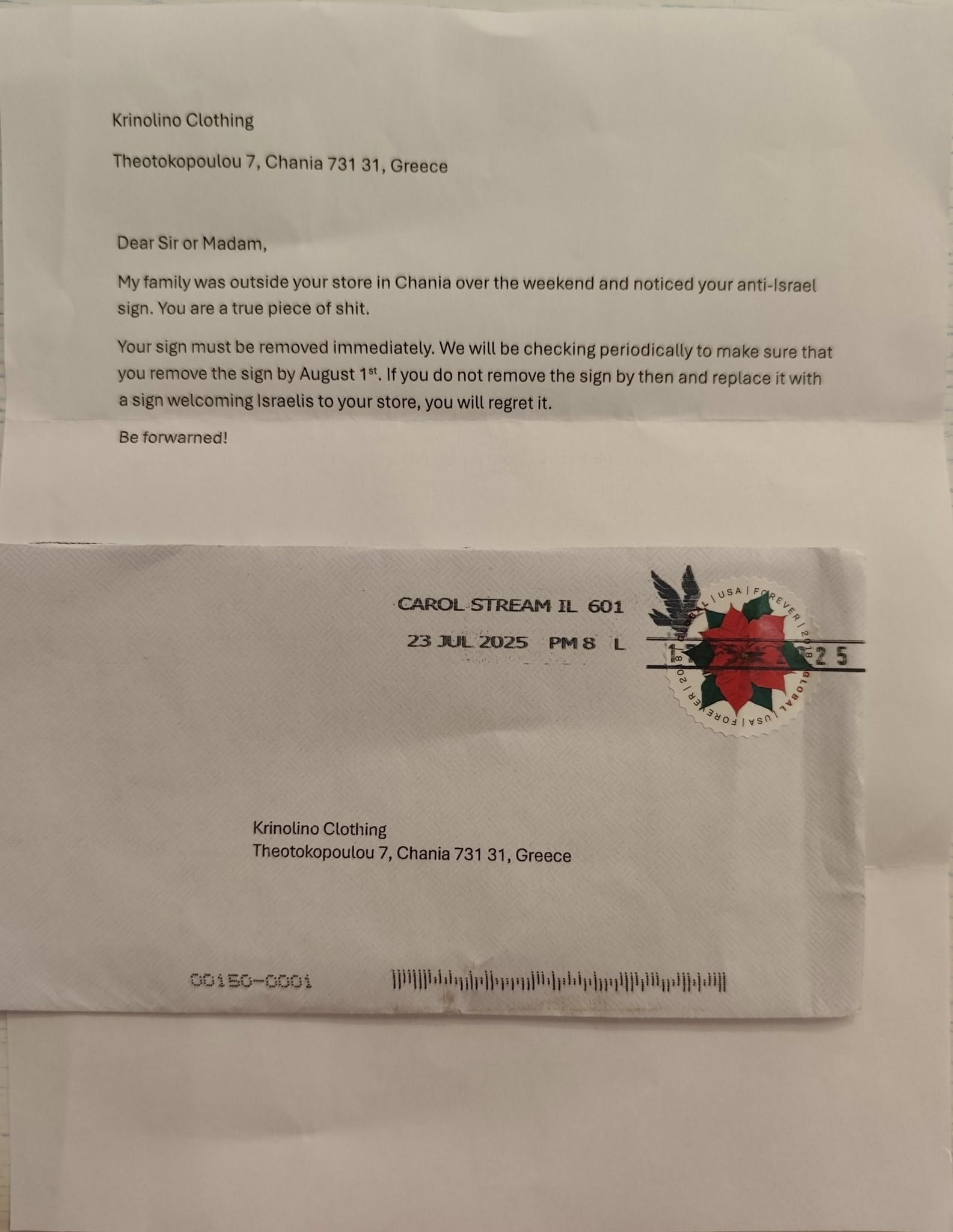 Η ένταση κορυφώθηκε στις 12 Αυγούστου 2025, όταν η ιδιοκτήτρια εντόπισε στην είσοδο του καταστήματος ένα ταχυδρομημένο γράμμα από Carol Stream, Illinois, ΗΠΑ. Το περιεχόμενο του φακέλου περιείχε ευθείες απειλές με την ίδια πάντως να δηλώνει ότι δεν κάμπτεται και ότι έχει τη συνείδησή της καθαρή.