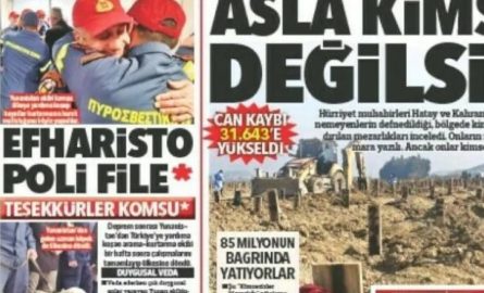 Η Ηurriyet σημειώνει το περιστατικό, δημοσιεύοντας σχετικό φωτογραφικό στιγμιότυπο, όταν άνδρες της ΕΜΑΚ ξέσπασαν σε επιφωνήματα χαράς και εναγκαλισμούς, μετά τη διάσωση 6χρονου κοριτσιού από τα συντρίμμια στην Αντιόχεια, την επομένη του σεισμού.