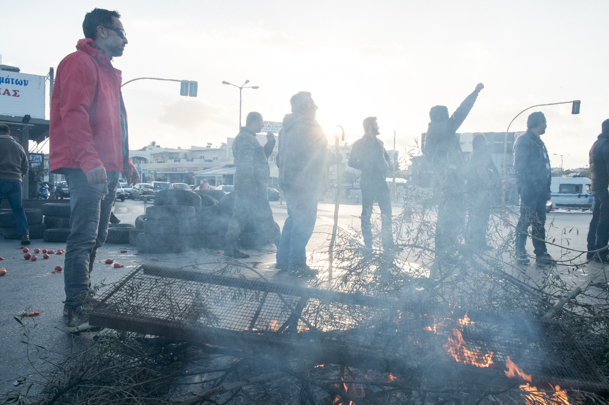 Οι αγρότες έκλεισαν το δρόμο στη γέφυρα του Κλαδισσού με λάστιχα, ξύλα και τα αμάξια τους, ανάρτησαν πανό και όσο βράδιαζε η παρουσία του κόσμου γινόταν πιο έντονα.