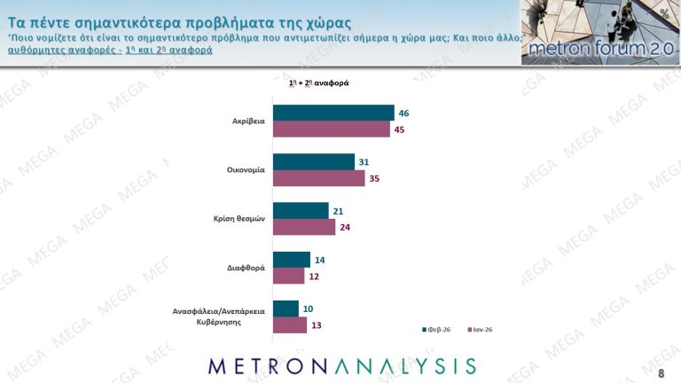 Ως σημαντικότερο πρόβλημα της χώρας αναδεικνύεται η ακρίβεια (46%), με την οικονομία να ακολουθεί (31%). Η κρίση θεσμών (21%) και η διαφθορά (14%) επίσης καταγράφονται ως σοβαρές ανησυχίες.
