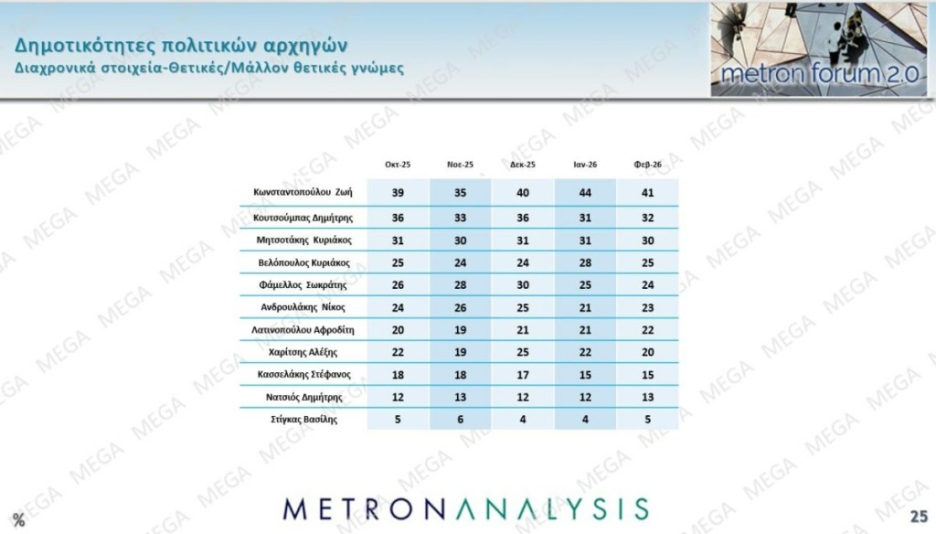 Στους πολιτικούς αρχηγούς η Ζωή Κωνσταντοπούλου έχει την υψηλότερη δημοτικότητα, αν και με μικρή υποχώρηση σε σχέση με την περασμένη μέτρηση, ακολουθούμενη από τον γενικό γραμματέα του ΚΚΕ Δημήτρη Κουτσούμπα, με τον πρωθυπουργό να είναι στην τρίτη θέση.