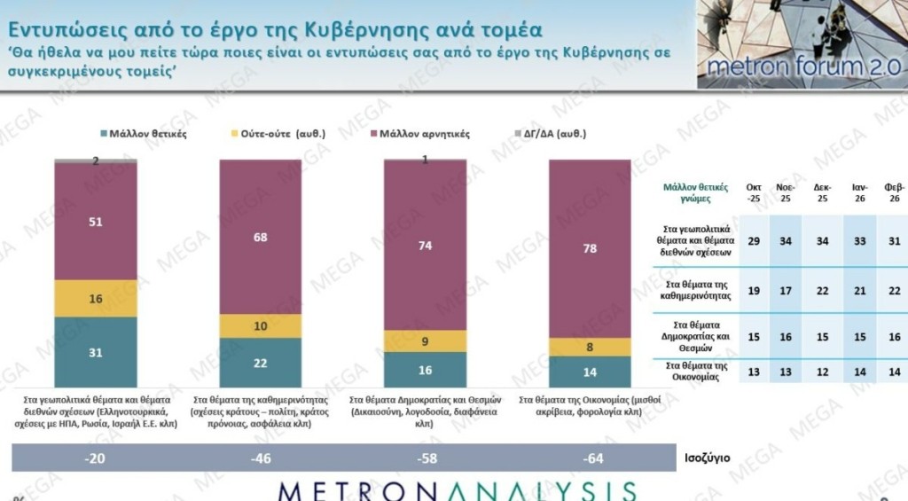 Η εικόνα της κυβέρνησης παραμένει επιβαρυμένη: το 70% αξιολογεί αρνητικά το έργο της, έναντι μόλις 24% που εκφράζει θετική γνώμη.