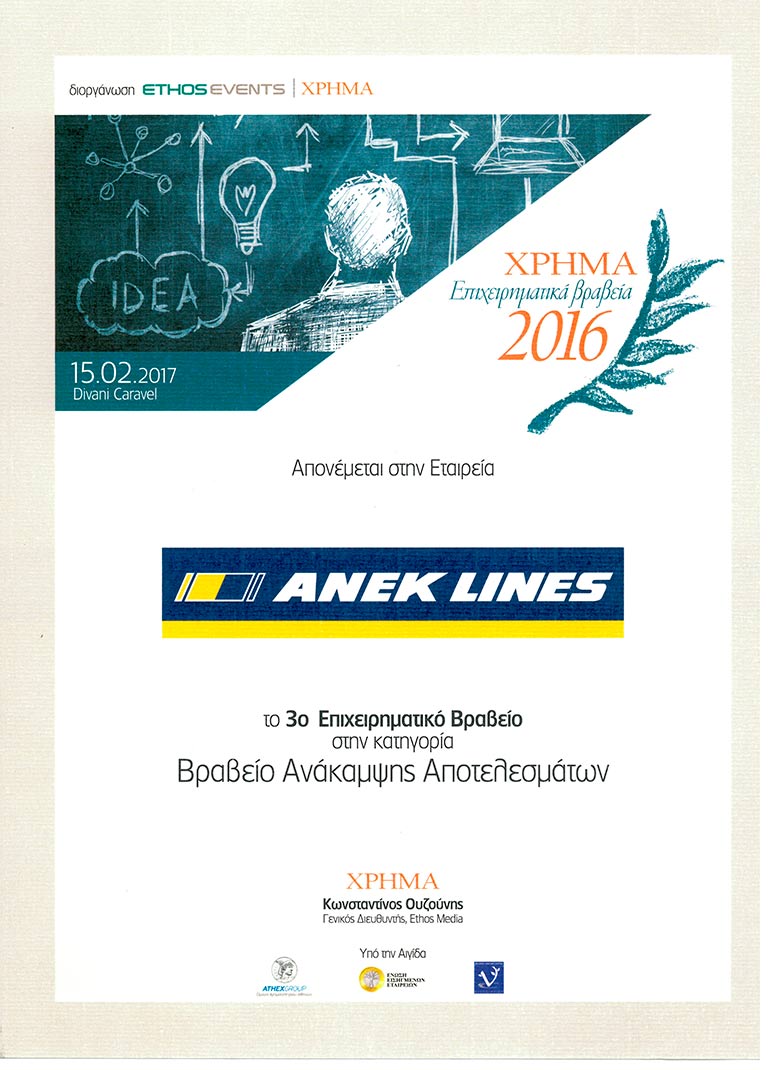 H ΑΝΕΚ LINES, κατάκτησε ένα ακόμα βραβείο. Στα Επιχειρηματικά Βραβεία ΧΡΗΜΑ, η ΑΝΕΚ έλαβε το 3ο ΒΡΑΒΕΙΟ ΑΝΑΚΑΜΨΗΣ ΑΠΟΤΕΛΕΣΜΑΤΩΝ, κατά την διάρκεια σχετικής τελετής, που πραγματοποιήθηκε το Φεβρουάριο (15/2), σε γνωστό ξενοδοχείο στην Αθήνα.