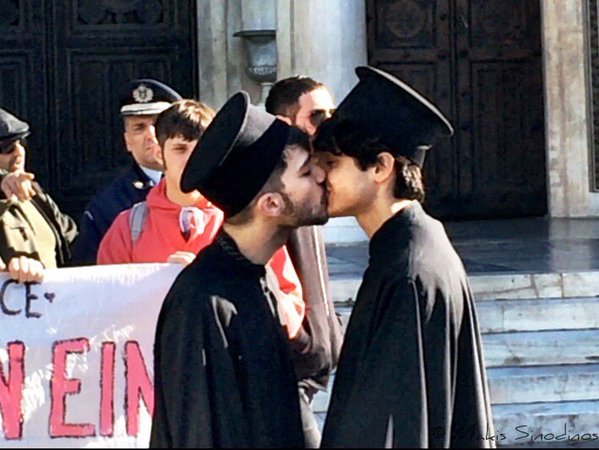 Σε μια συμβολική κίνηση δύο νέοι ντυμένοι παπάδες φιλήθηκαν μπροστά στην Μητρόπολη. Ένταση προκλήθηκε με περαστικό ο οποίος αντέδρασε στη διαμαρτυρία των μελών των ομοφυλοφιλικών οργανώσεων.