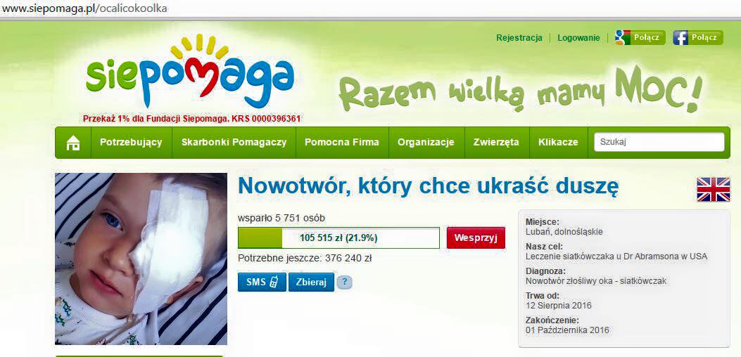 Ένα ίδρυμα στην Πολωνία που ονομάζεται “Siepomaga” έχει ήδη συγκεντρώσει περίπου το ένα τρίτο των χρημάτων που χρειάζονται (περίπου 126.000 δολάρια) για να χρηματοδοτηθεί η θεραπεία του παιδιού στην οφθαλμολογική ογκολογική κλινική του Ντέιβιντ Αμπραμσον στη Νέα Υόρκη.