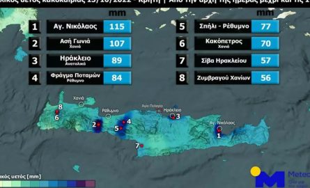 “Καταστροφικές πλημμύρες έπληξαν τις πρωινές ώρες του Σαββάτου το Ηράκλειο όπου ένας άνθρωπος έχασε τη ζωή του και 2 ακόμη αγνοούνται, όταν τα οχήματά τους παρασύρθηκαν από τα νερά ορμητικών χειμάρρων κατά τη διάρκεια ξαφνικής πλημμύρας. Πολλά τα προβλήματα και στην Ανατολική Κρήτη όπου οι σταθμοί του δικτύου του Εθνικού Αστεροσκοπείου Αθηνών/meteo.gr καταγράφουν ημερήσια ύψη βροχής άνω των 100 mm, δηλαδή περίπου το 1/3 του ύψους βροχής που σημειώνεται συνήθως ετησίως.