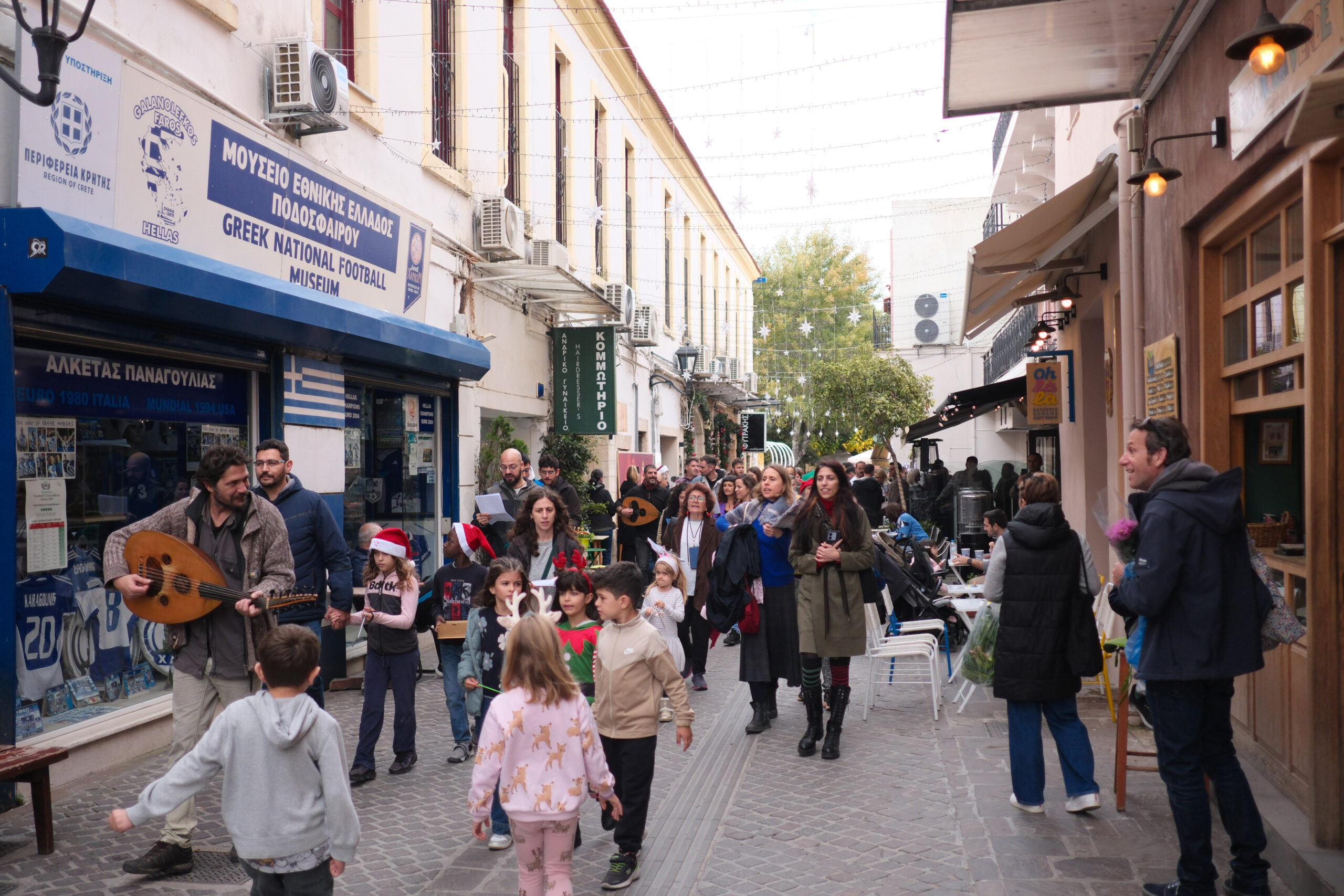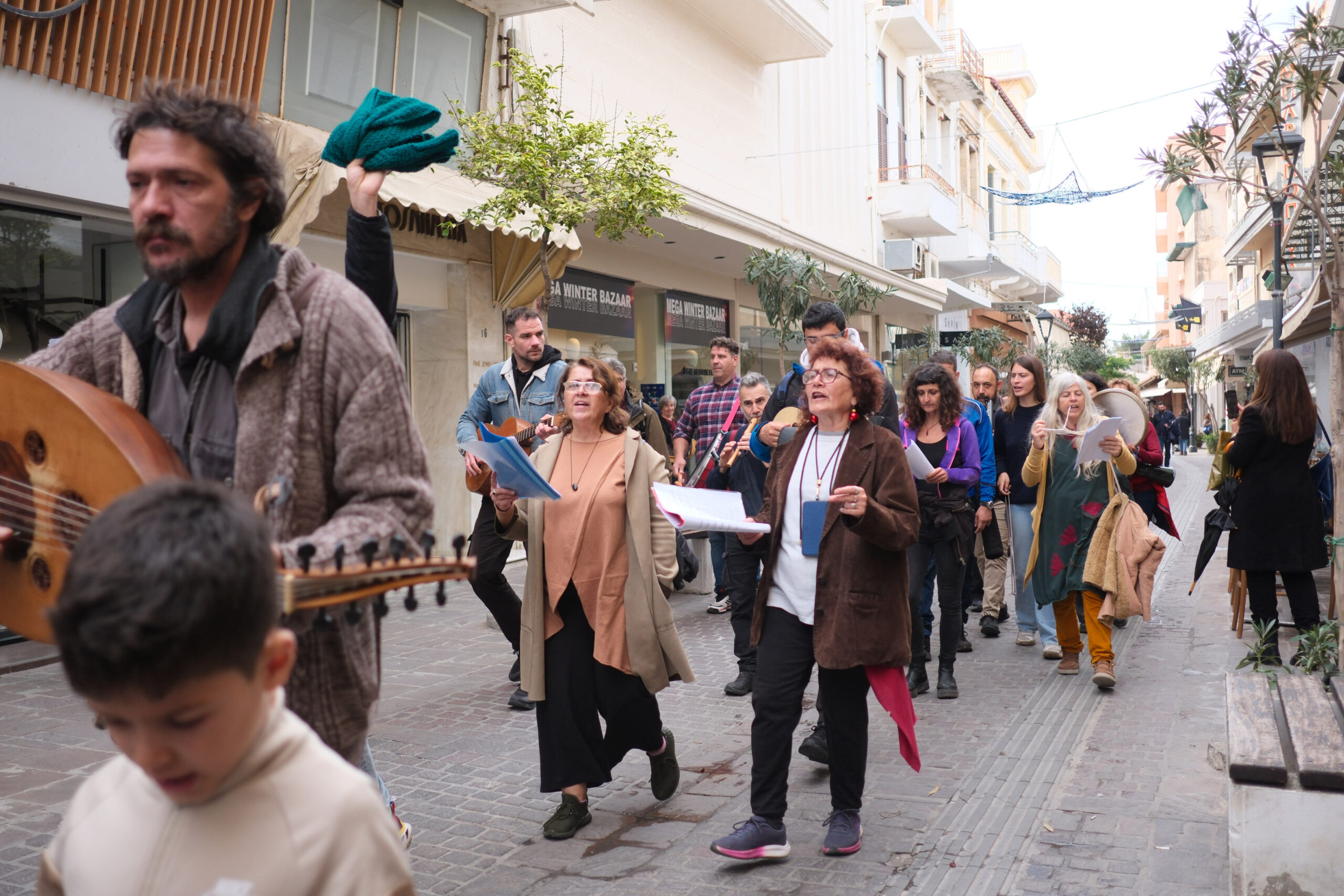 Η μουσική αυτή πορεία κορυφώθηκε με συμβολικό τρόπο σε ένα από τα πιο ζωντανά σημεία της πόλης το πρωί του Σαββάτου. Η ομάδα κατέληξε στην οδό Μίνωος, διασχίζοντας τον χώρο όπου πραγματοποιείται η καθιερωμένη λαϊκή αγορά.